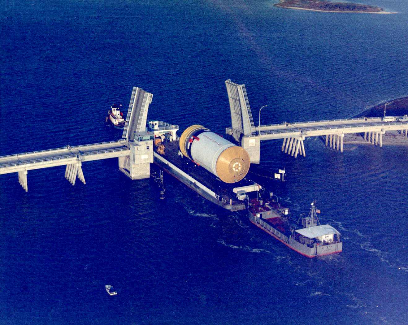 S-II second stage on sea going barge passing through swing bridge enroute to KSC.