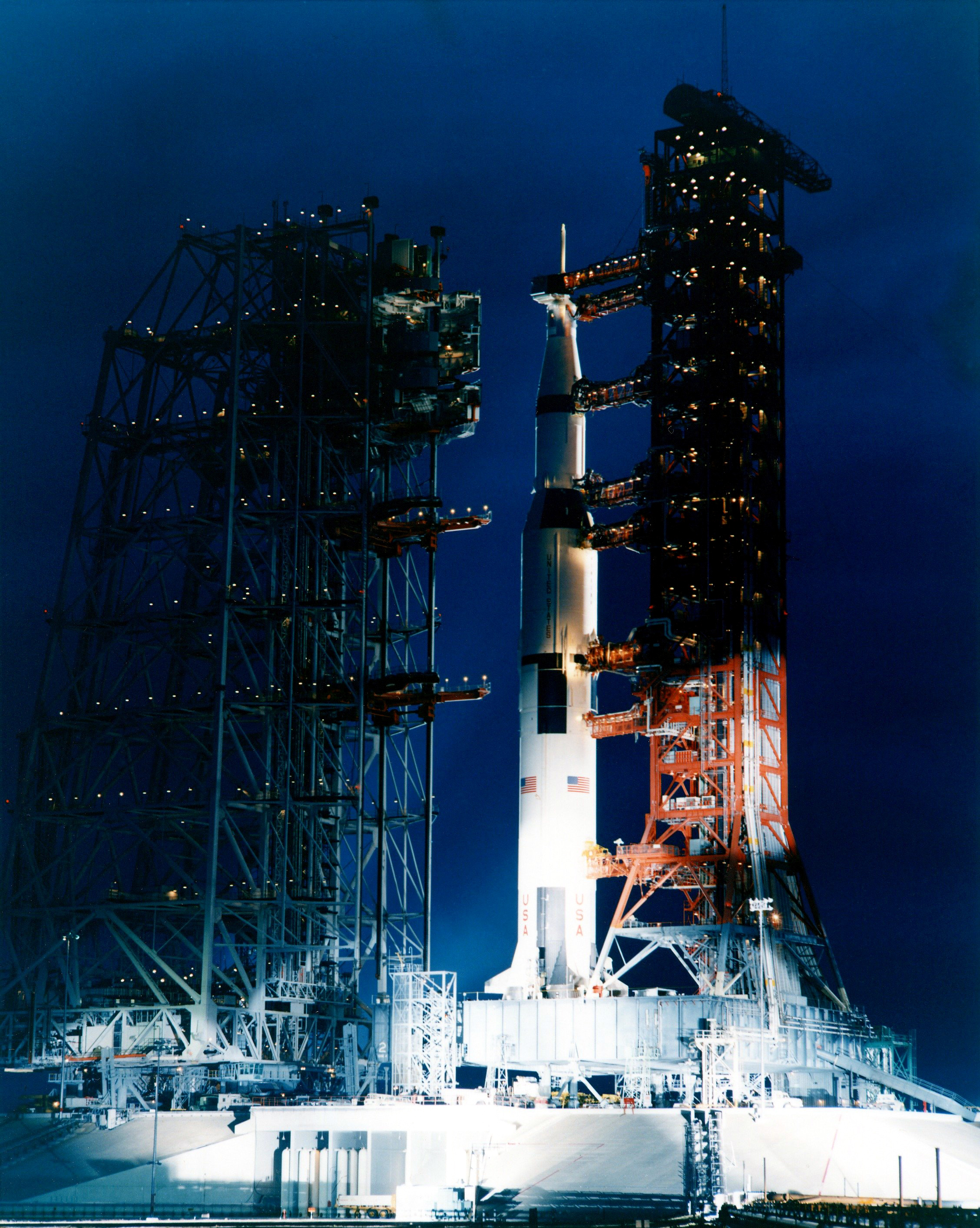 Ground-level view at sunset of the Apollo 10 (CM-106/LM-4/Saturn-505) space vehicle at Pad B, Launch Complex 39, Kennedy Space Center. The Apollo 10 stack had just been positioned after being rolled out from the Vehicle Assembly Building.