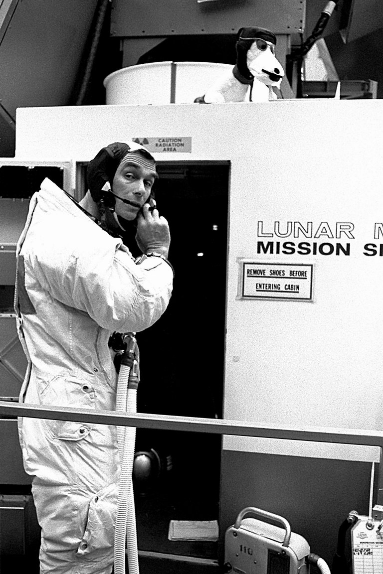 Eugene Cernan along with mascot the cartoon character 'Snoopy' at a press conference. (ALSJ)