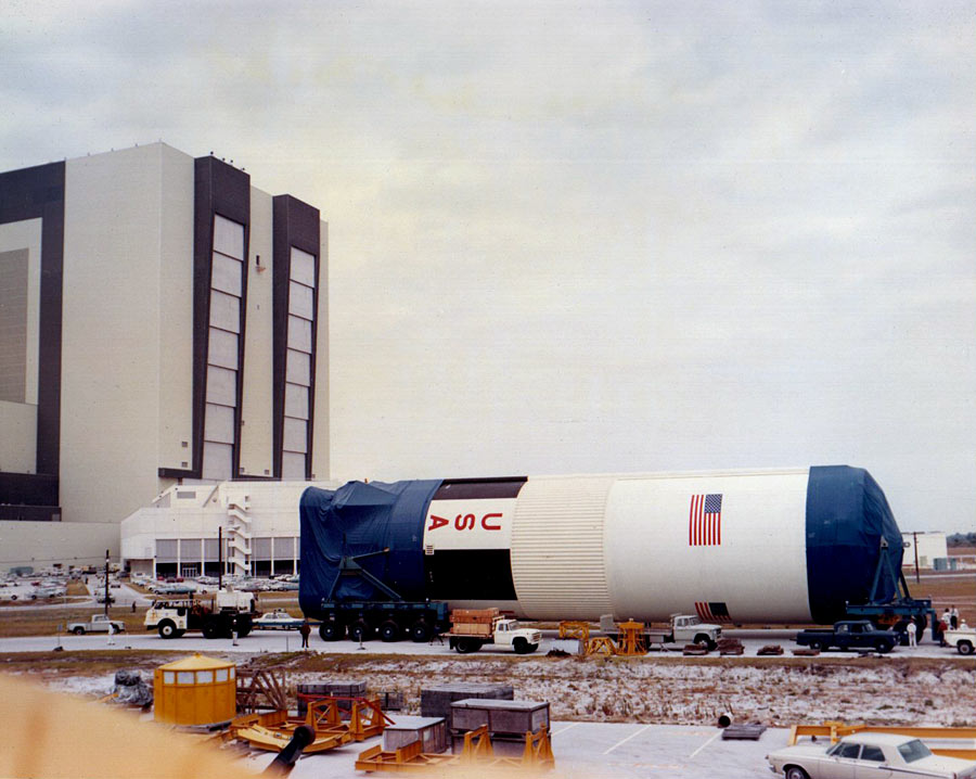 The Apollo 10 spacecraft begins its rollout to pad 39-B at KSC. The VAB cab be seen in the background.