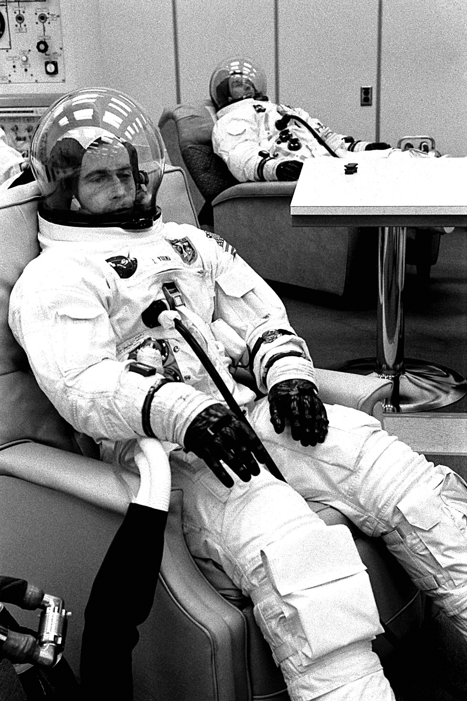 John Young sitting in comfortable reclining chair in the suiting up room at KSC.