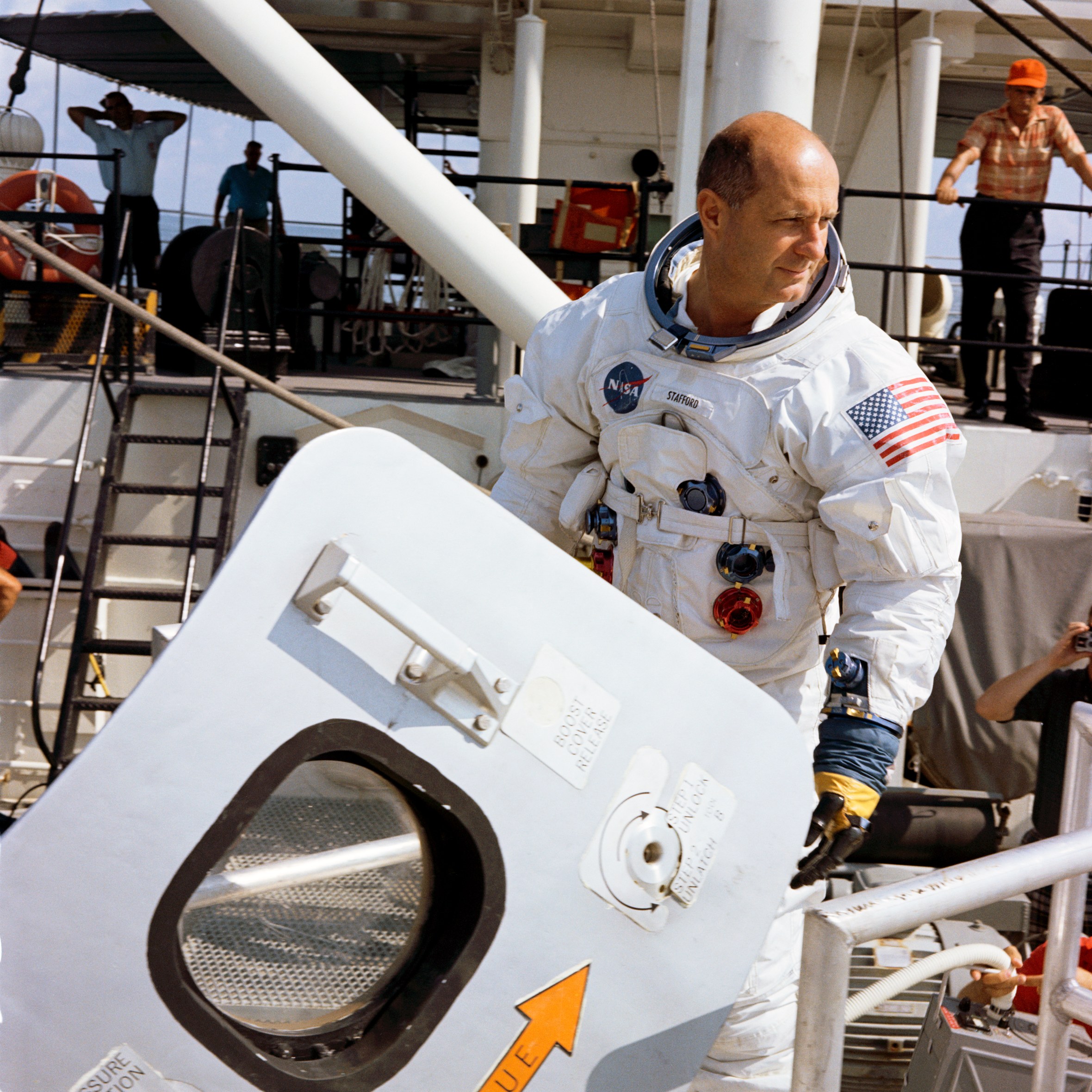 Apollo 10 CDR Thomas Stafford during a pre-flight press conference.