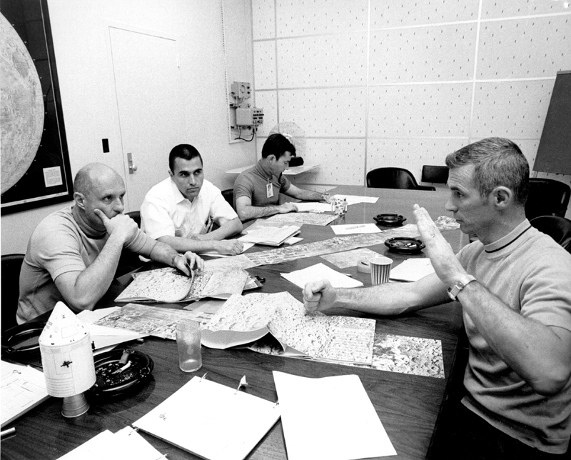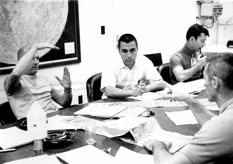 The prime crews of the Apollo 10 lunar orbit mission and the Apollo 11 lunar landing mission are photographed during an Apollo 10 postflight de-briefing session.