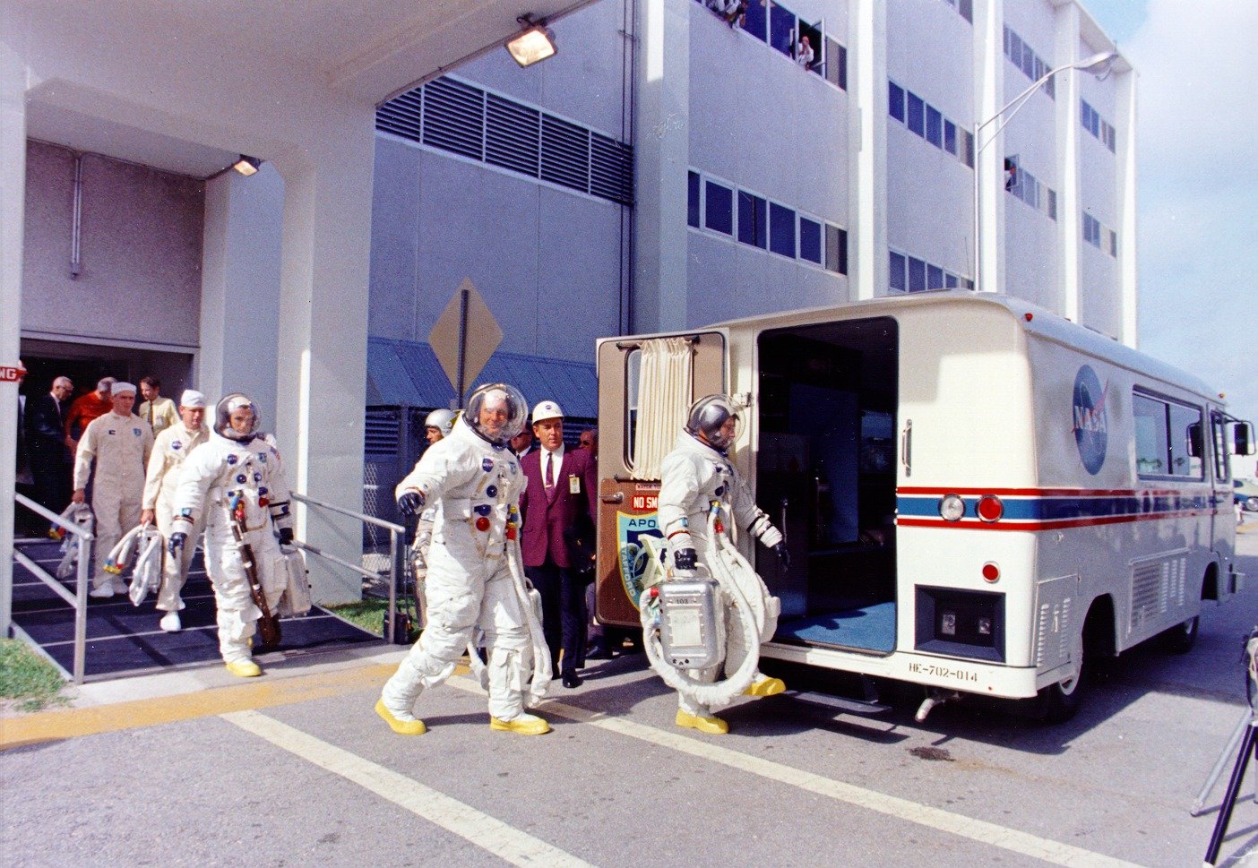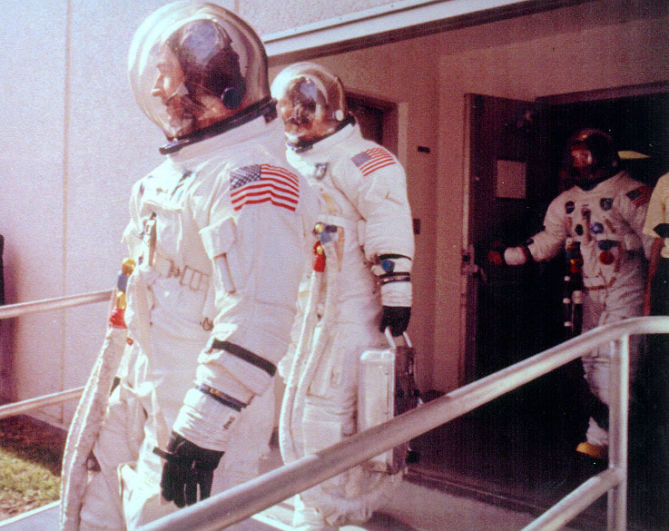 John Young (left) and Tom Stafford head for the elevator and the transfer van which will take Gene Cernan and them out to the pad for the Countdown Demonstration Test. (ALSJ)