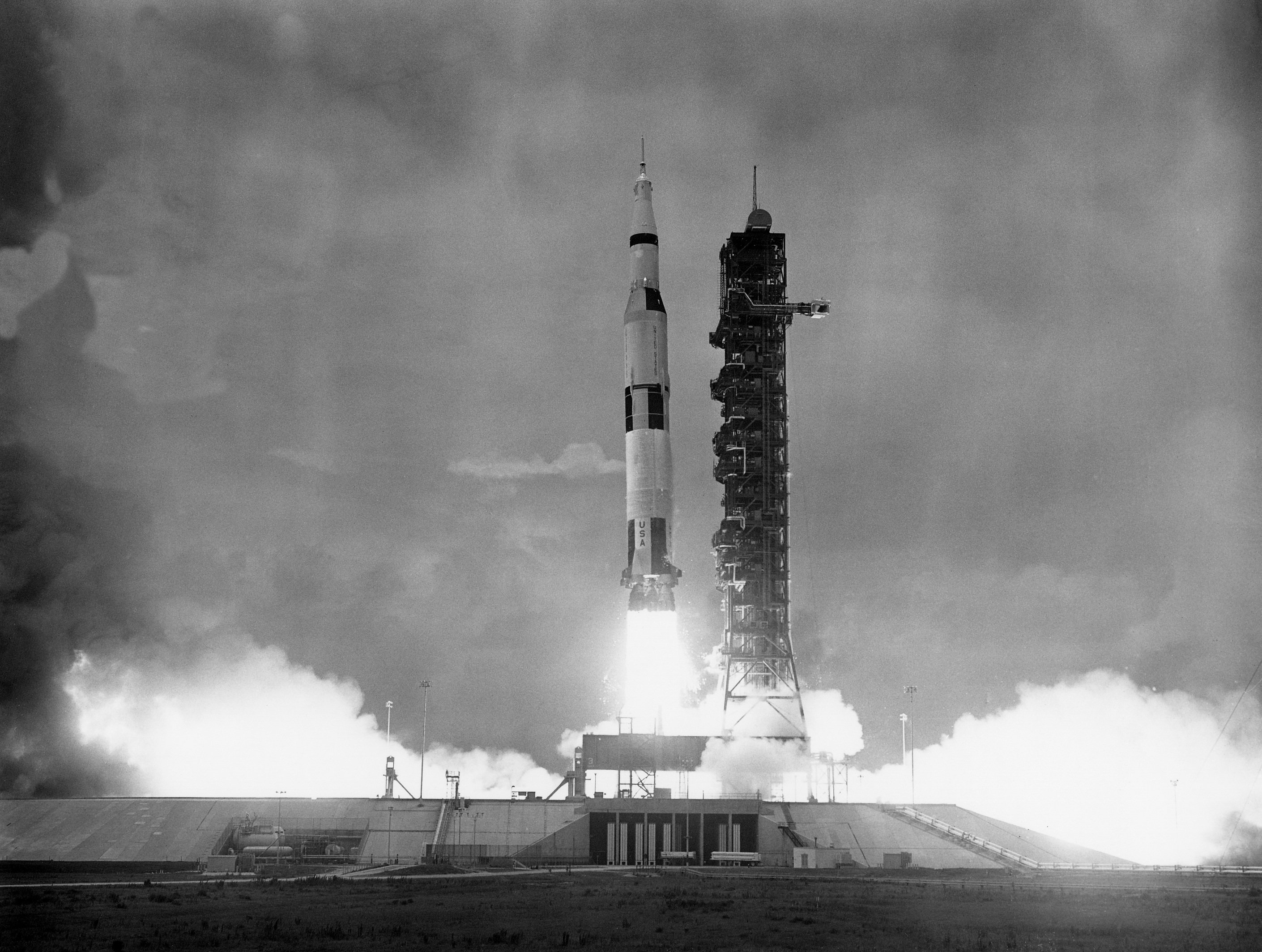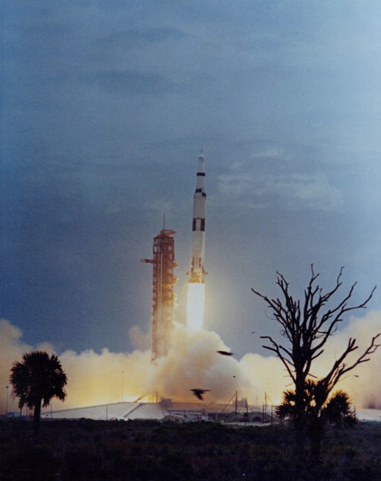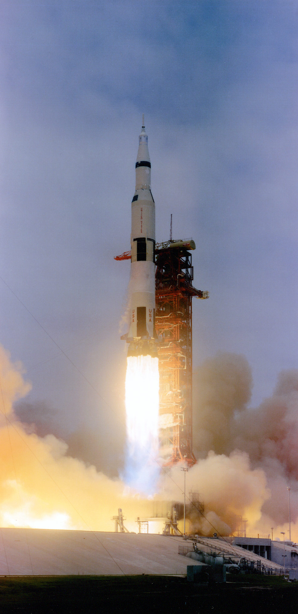 The Apollo 10 space vehicle is launched from Pad B, Launch Complex 39, Kennedy Space Center, at 12:49 p.m. (EDT), May 18, 1969.