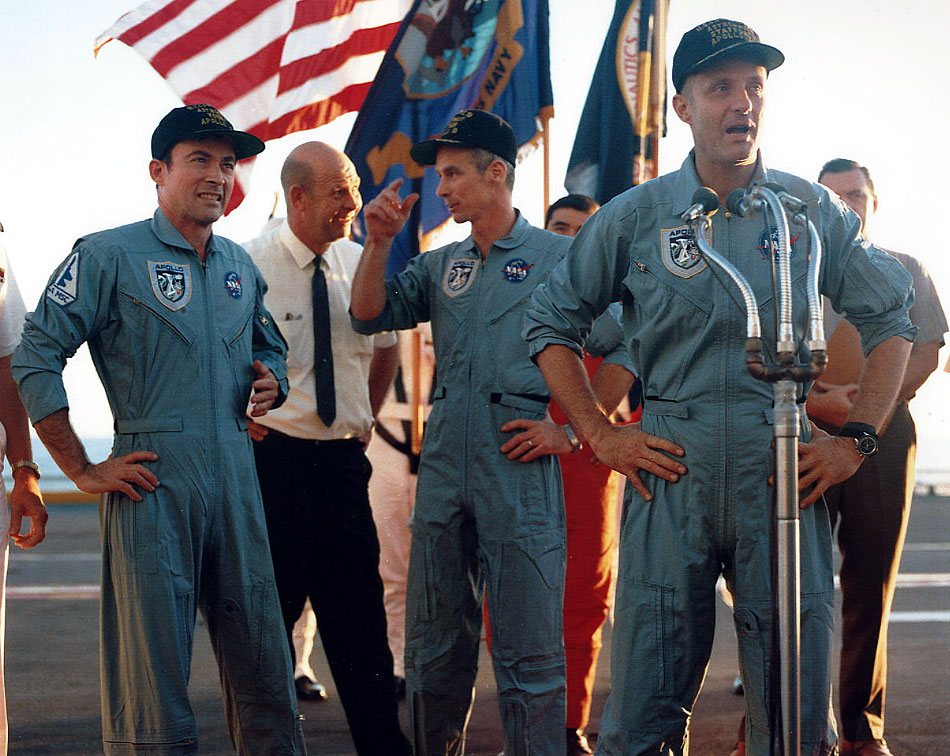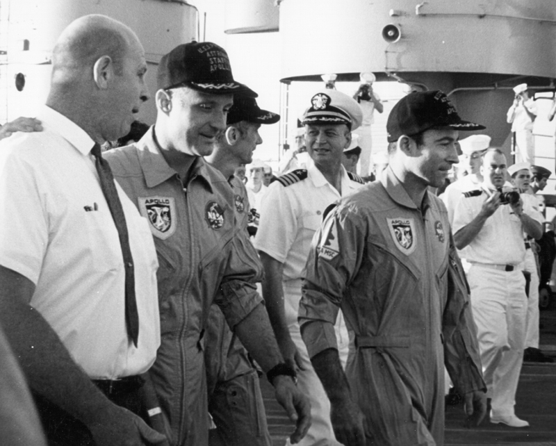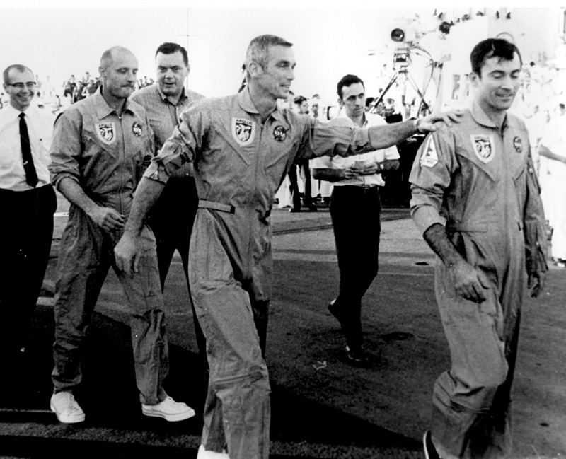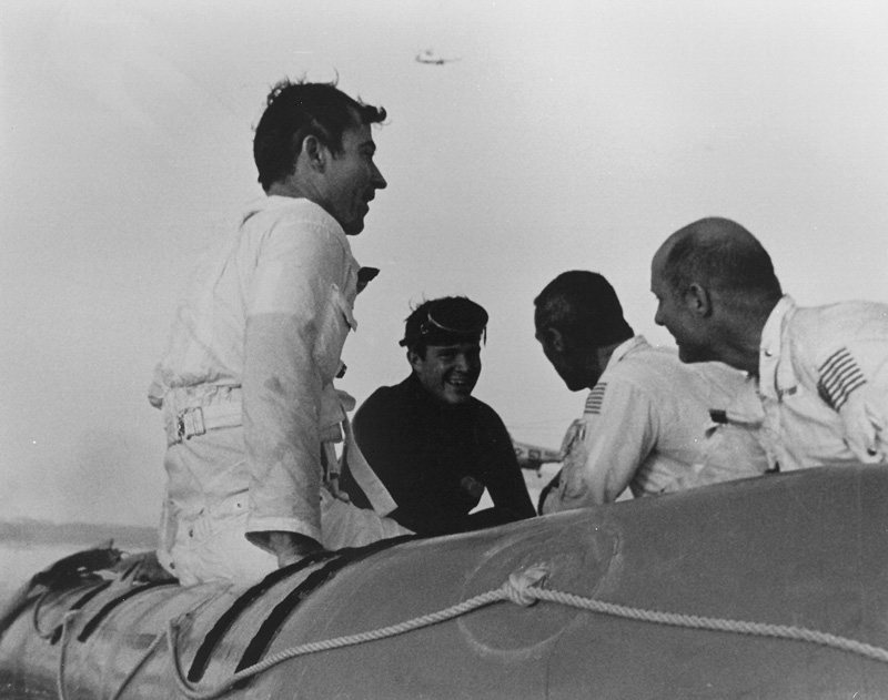 Crew just after arrival on the recovery aircraft carrier USS Hornet.