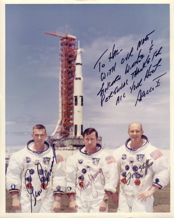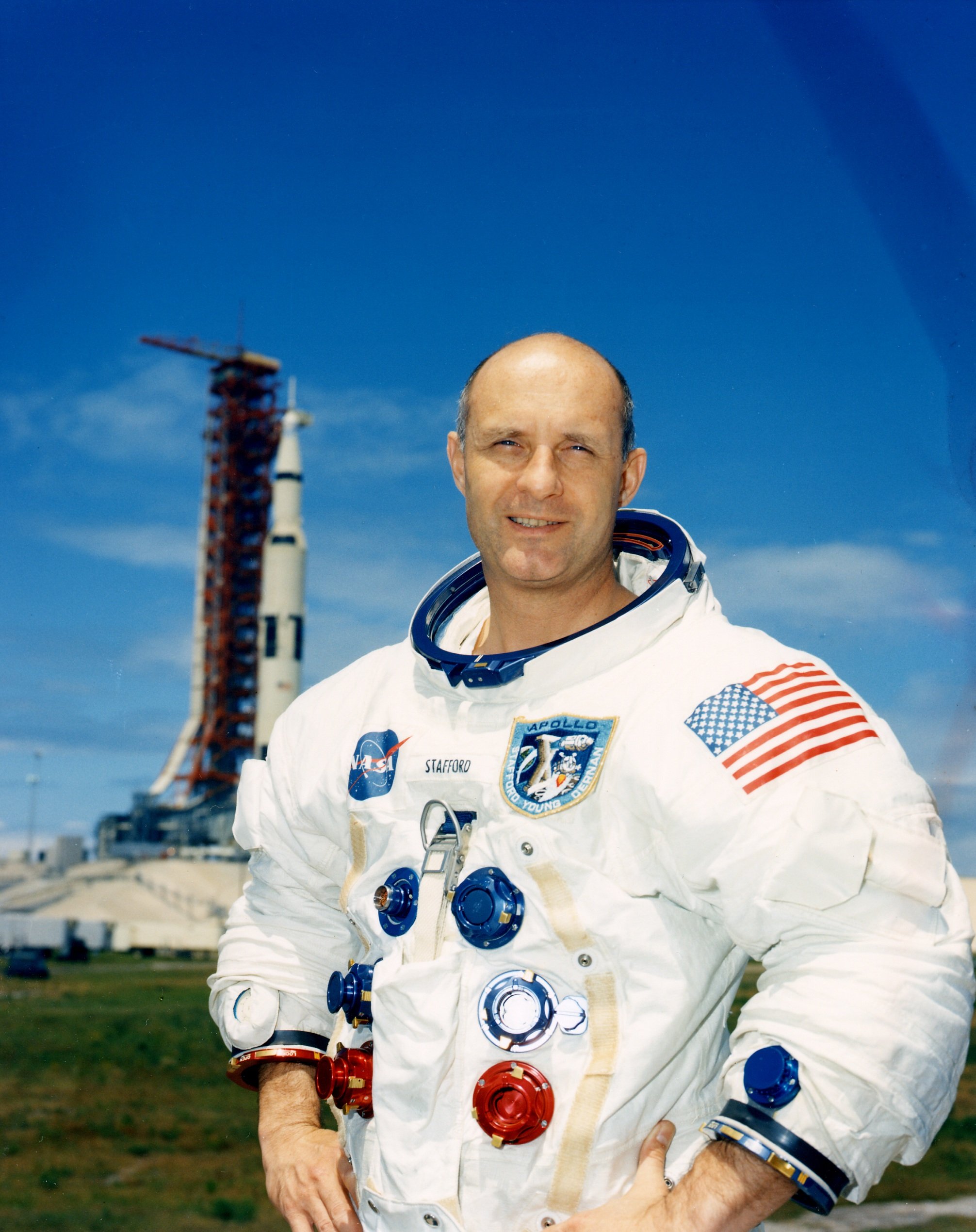 Official portrait of CDR Thomas Stafford in front of the Apollo 10 Saturn V at pad 39-B.