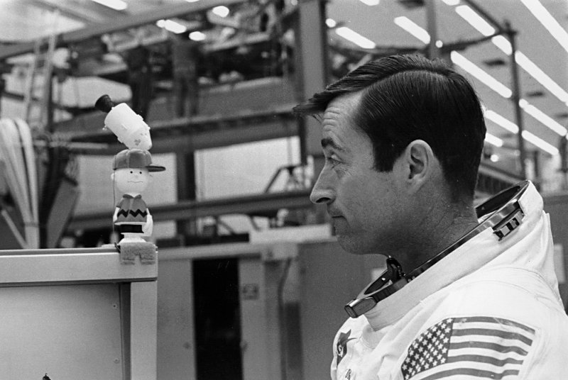 John Young grinning at the cartoon character 'Charlie Brown', complete with CSM.