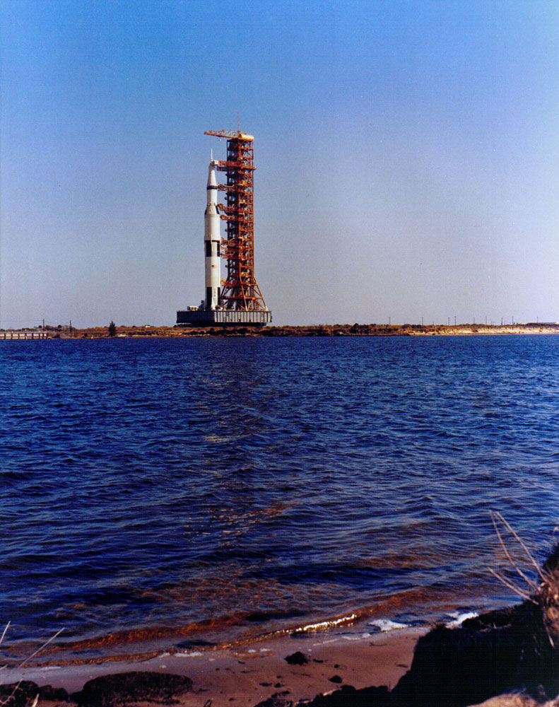 Apollo 10 Saturn V after clearing the tower. Photo taken from the MSS at its parked position.