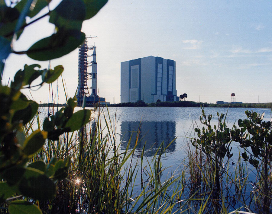 Saturn V enroute to pad 39-B as seen across the barge turning basin at KSC.