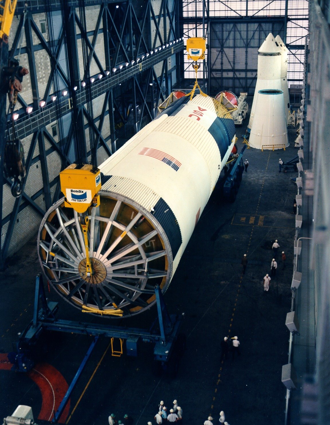 S-1C first stage is hoisted by crane in the transfer aisle of the VAB.