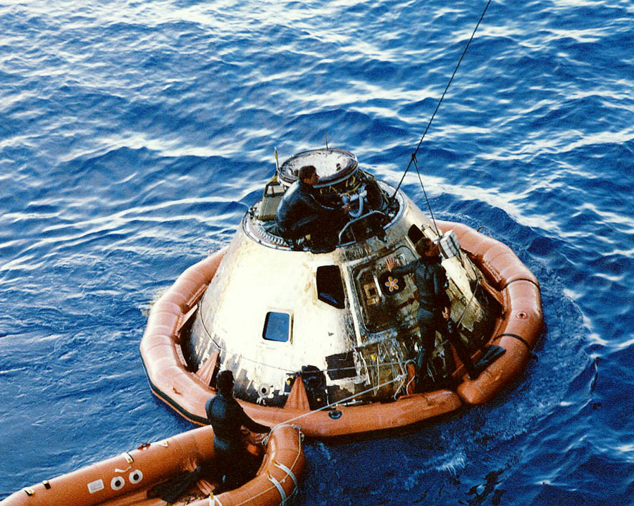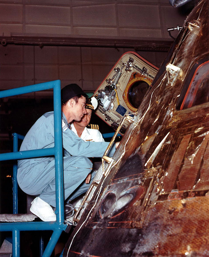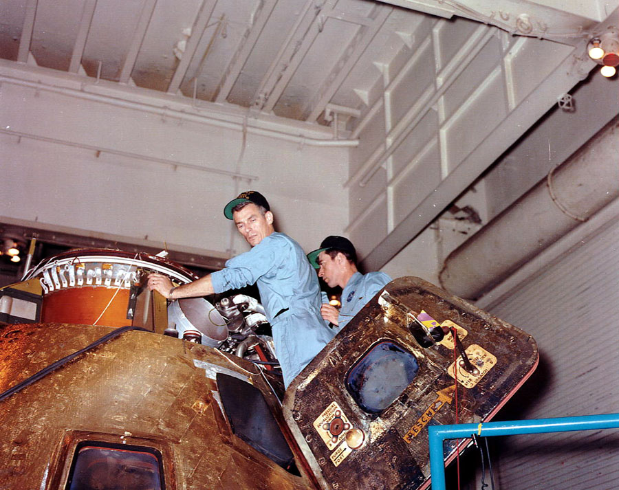 John Young inspects the recovered CM along with the Captain of the recovery carrier USS Hornet.