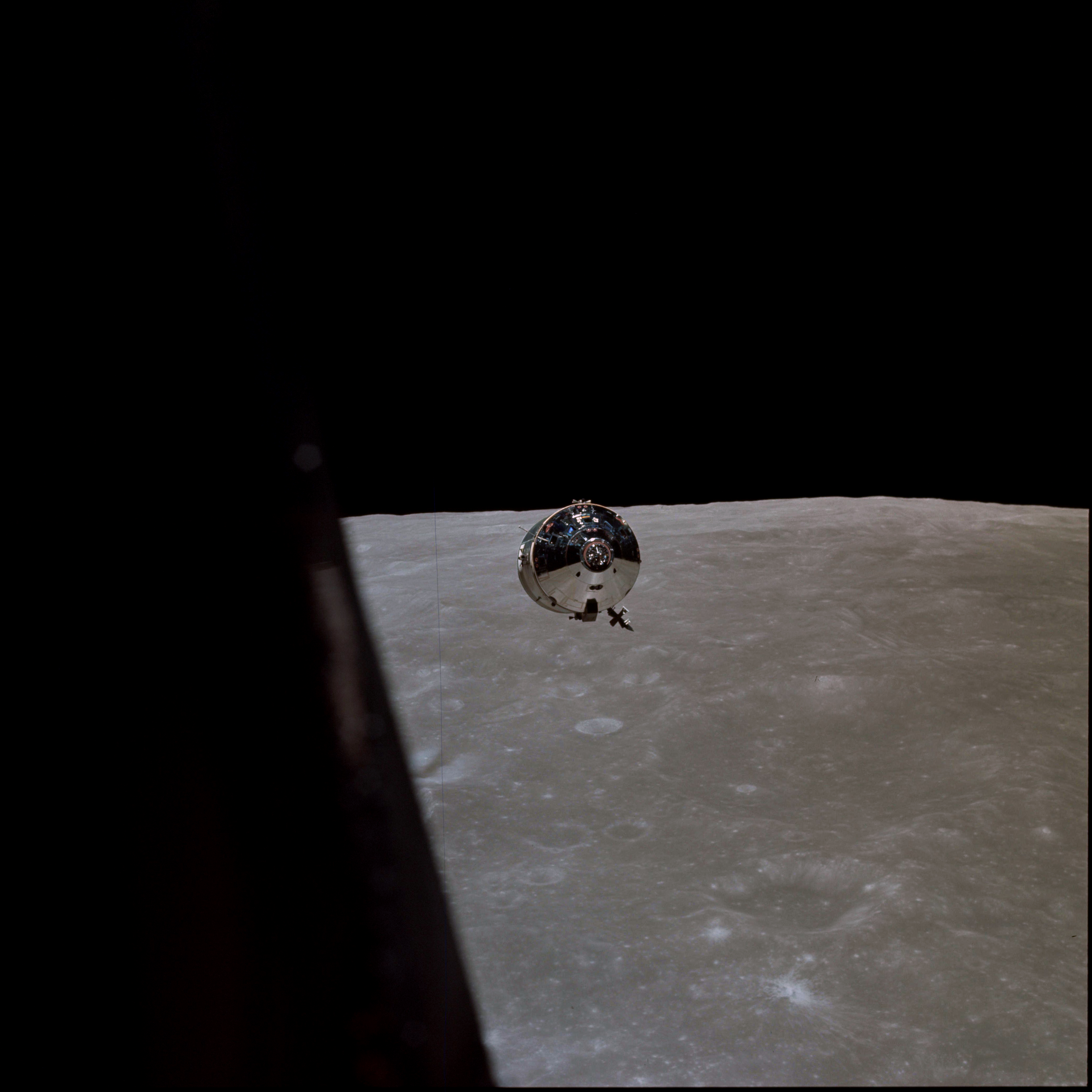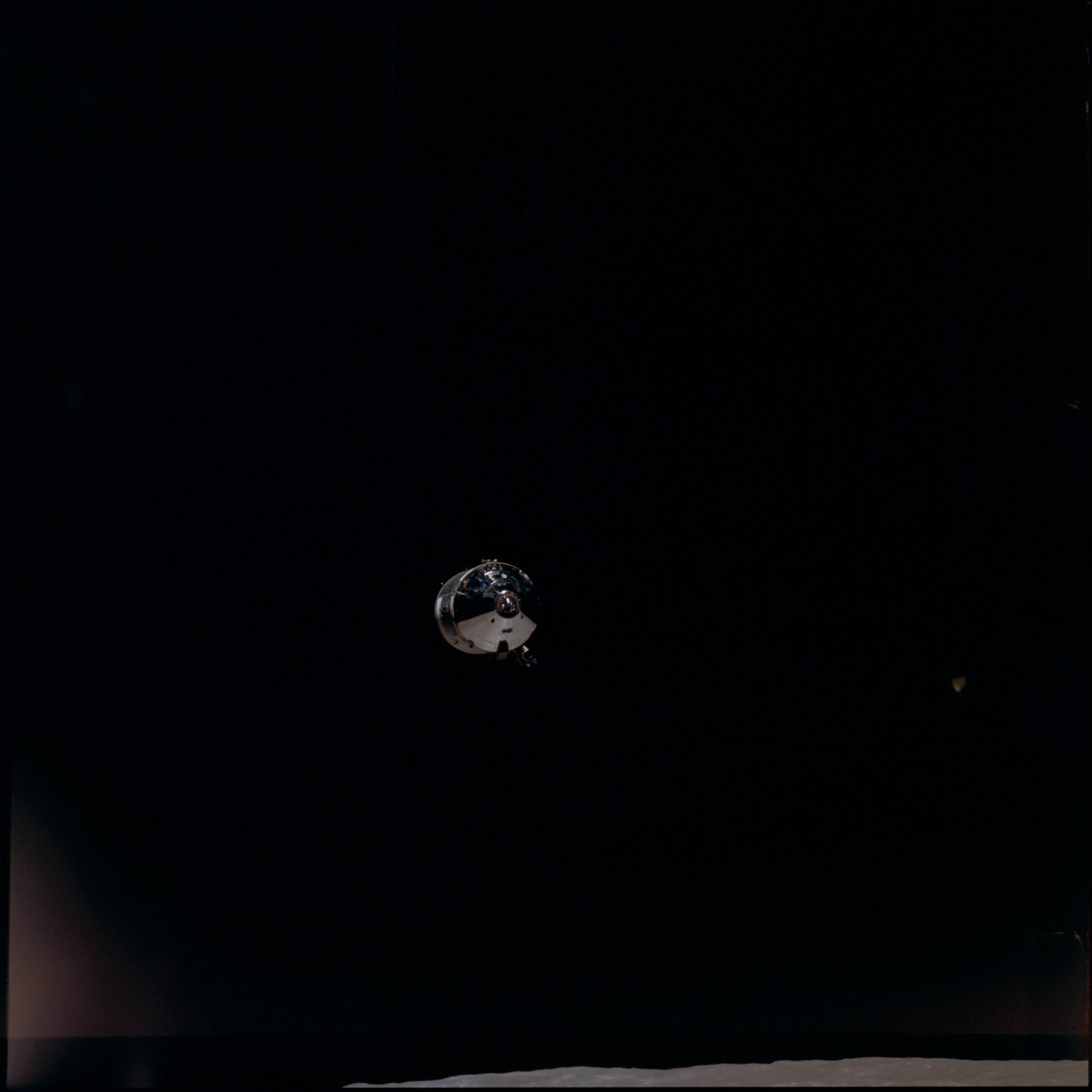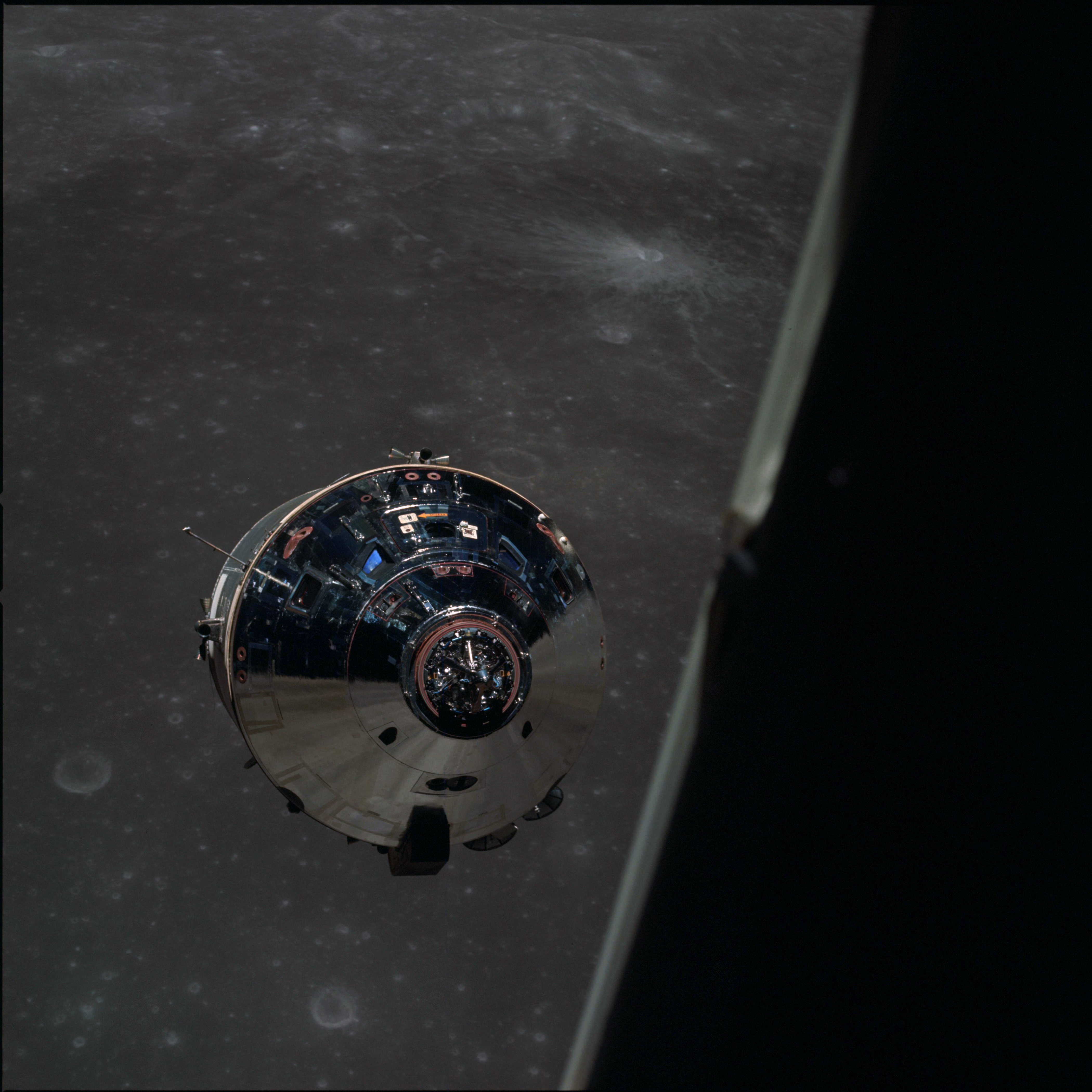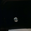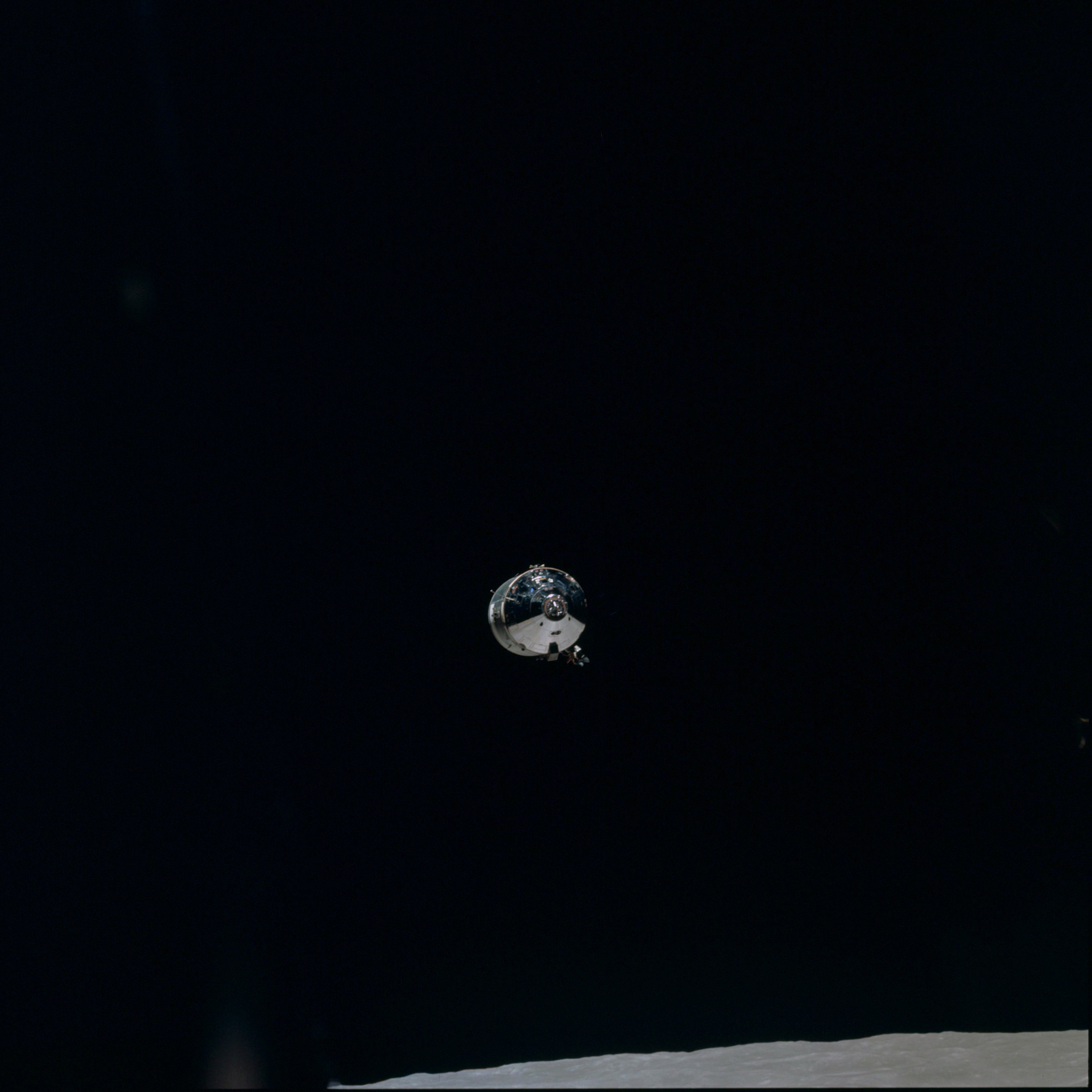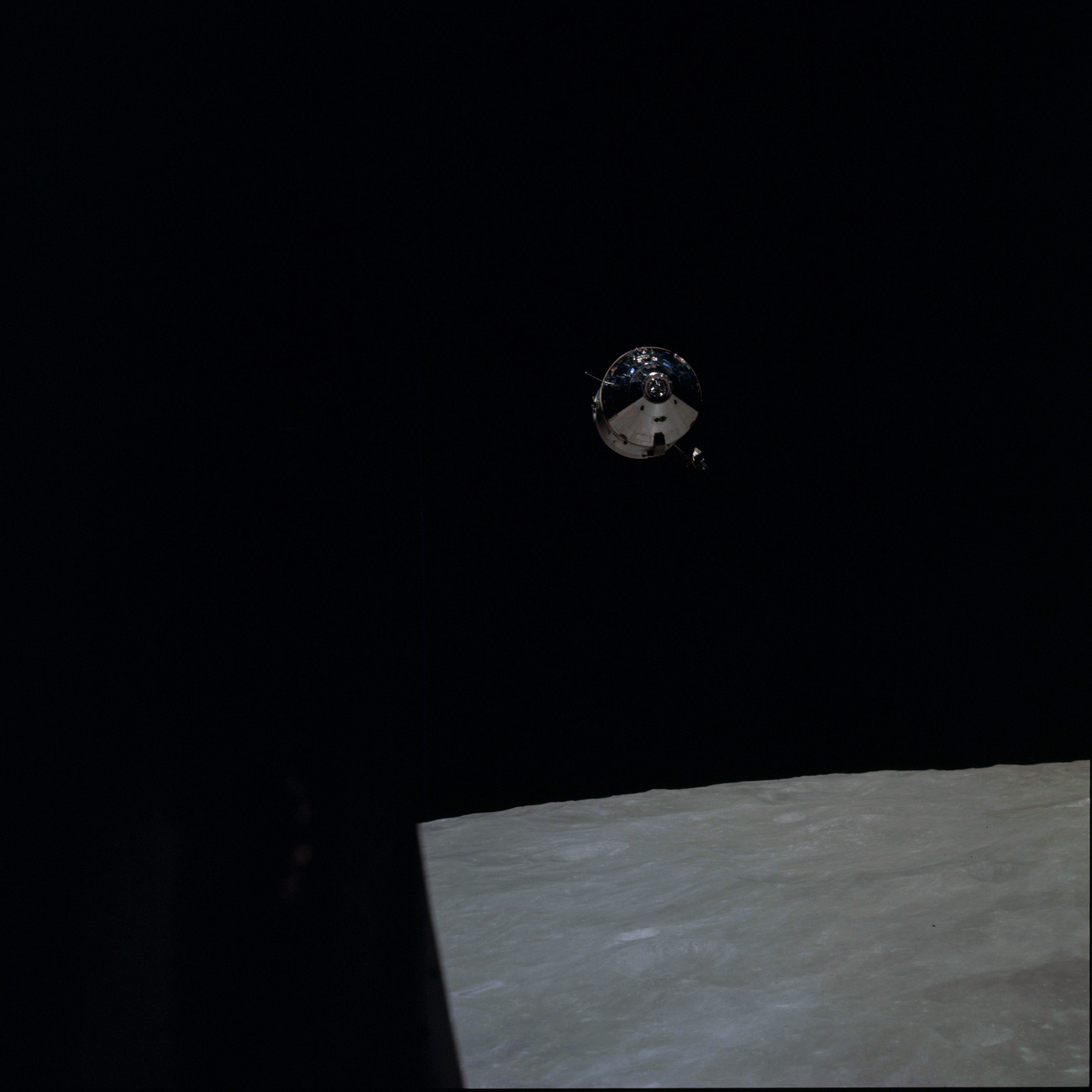 CSM Charlie Brown from LM Snoopy during rendezvous in lunar orbit.