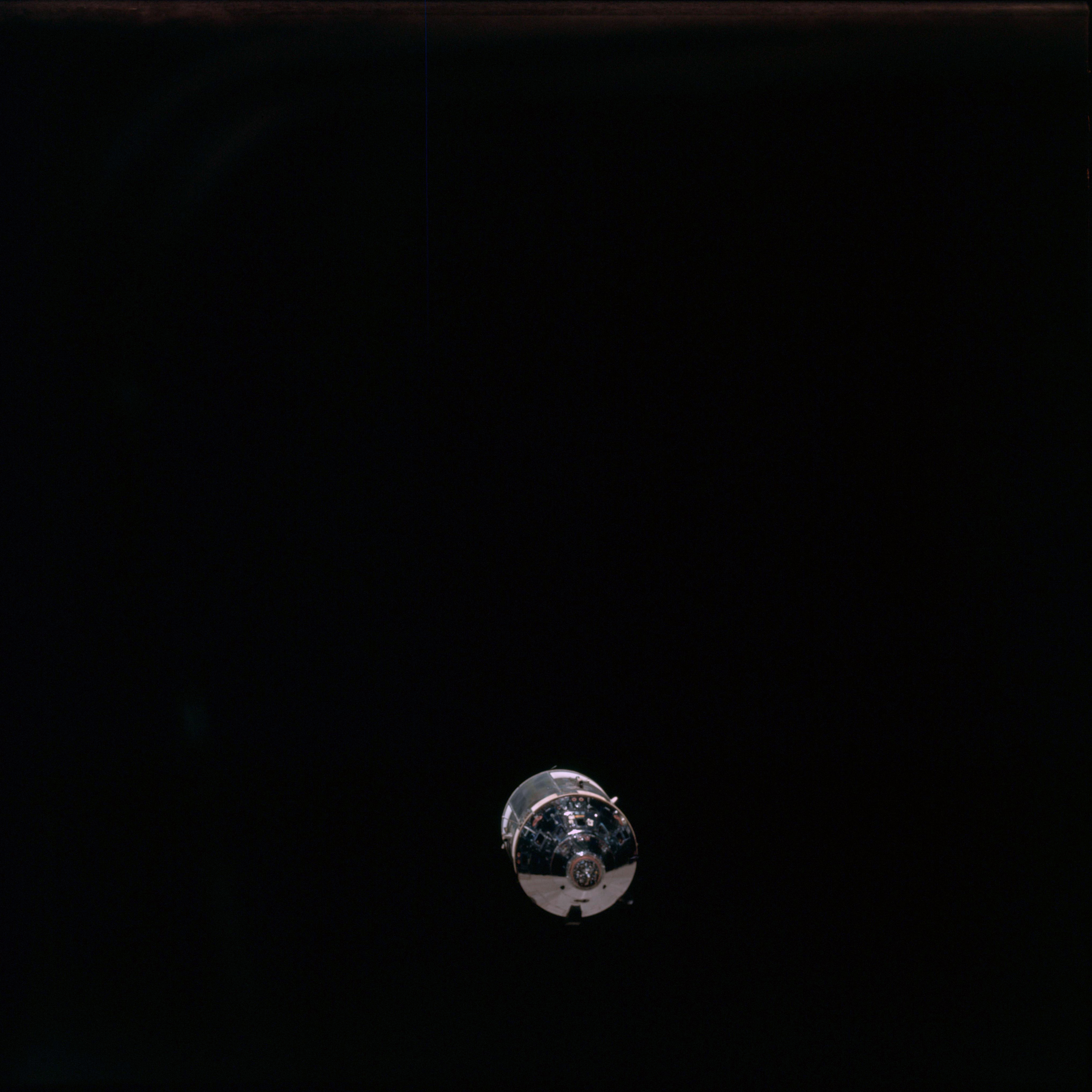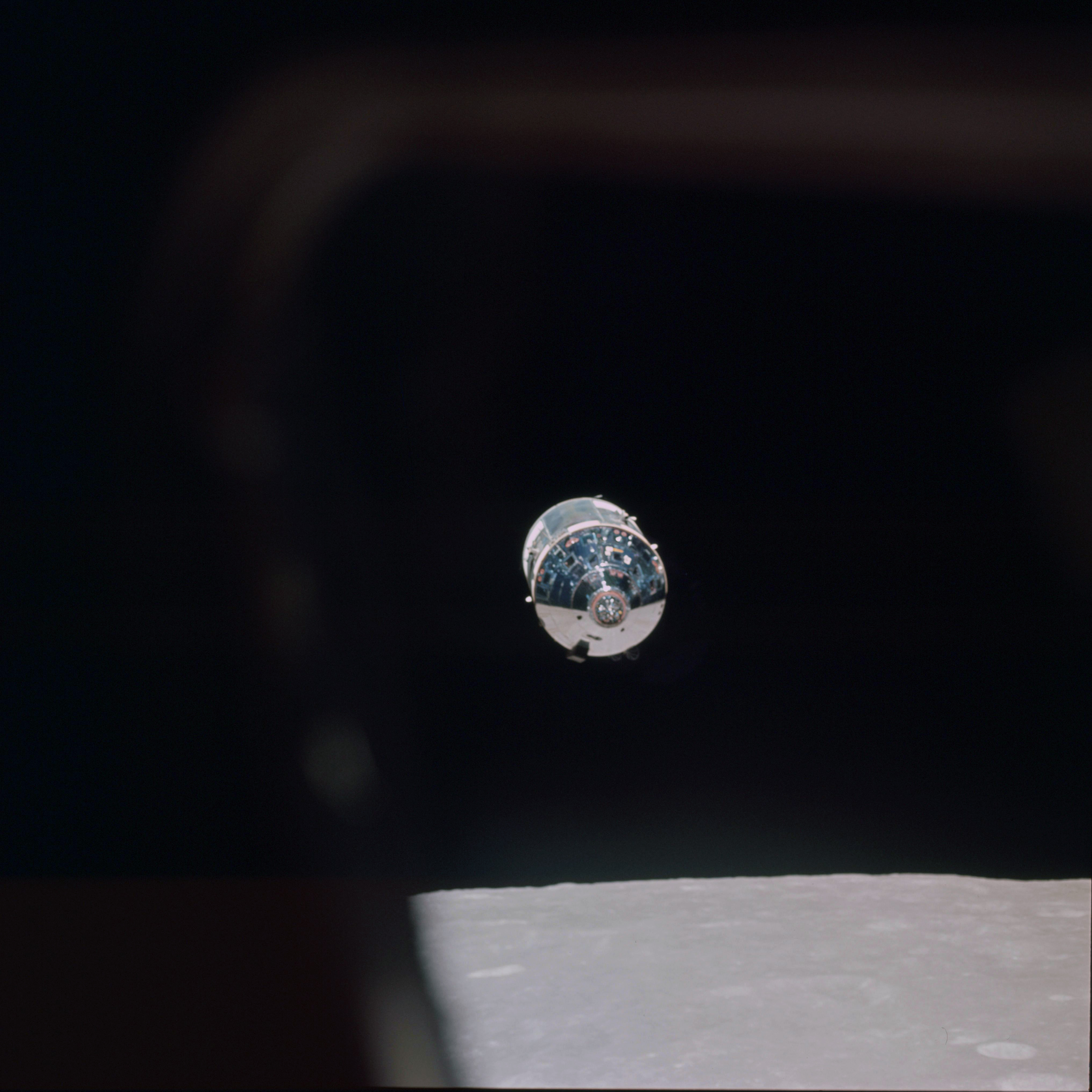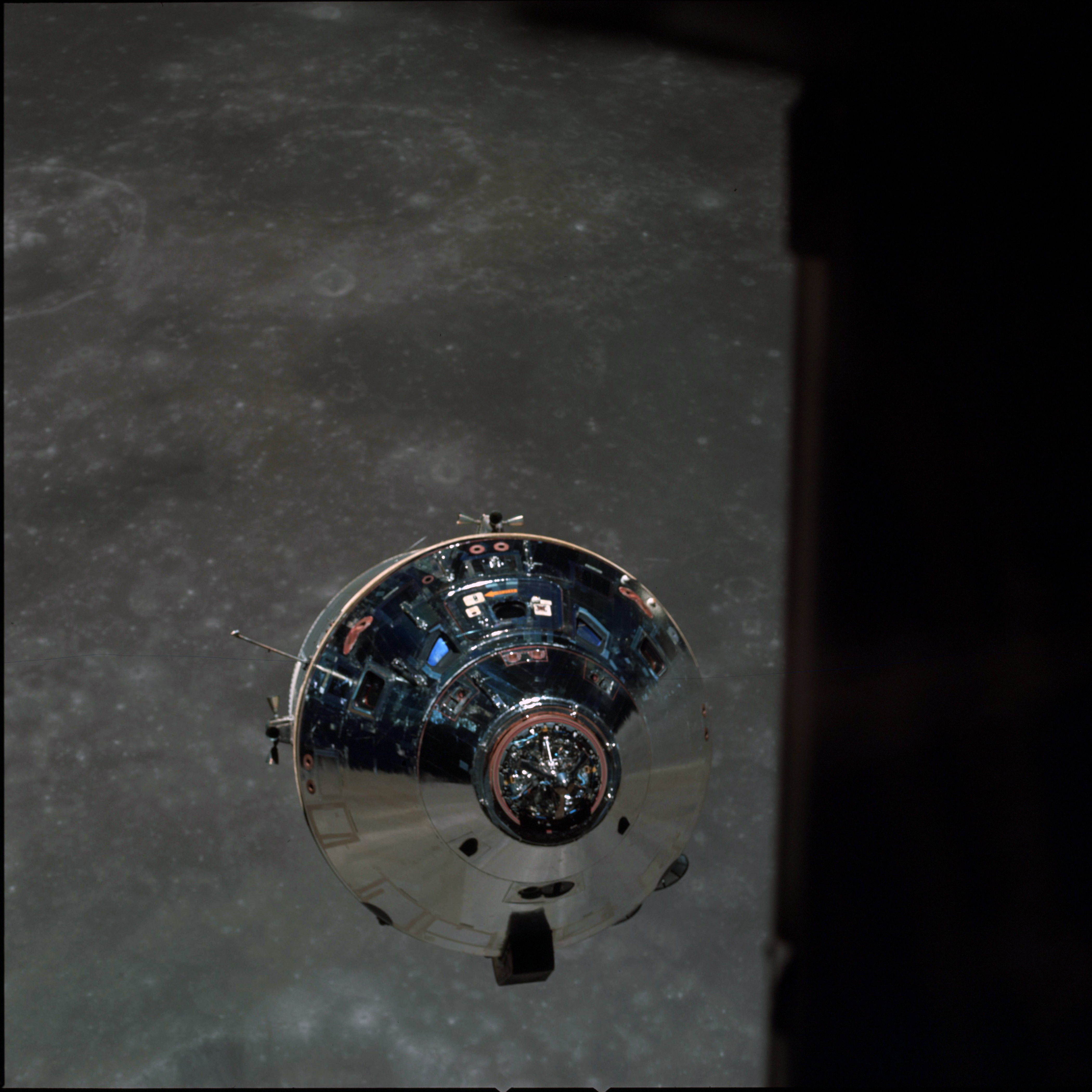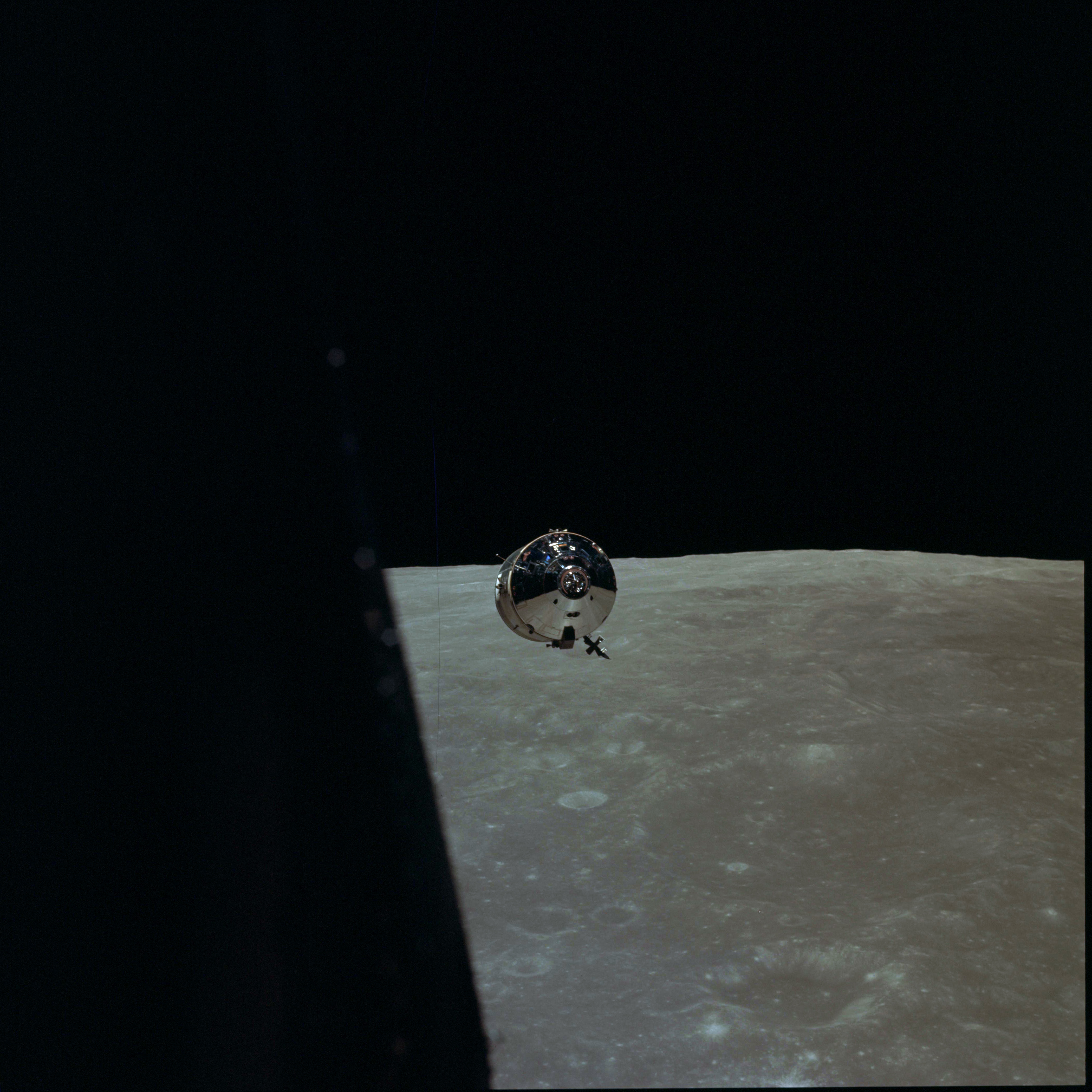 CSM Charlie Brown from LM Snoopy during rendezvous in lunar orbit.