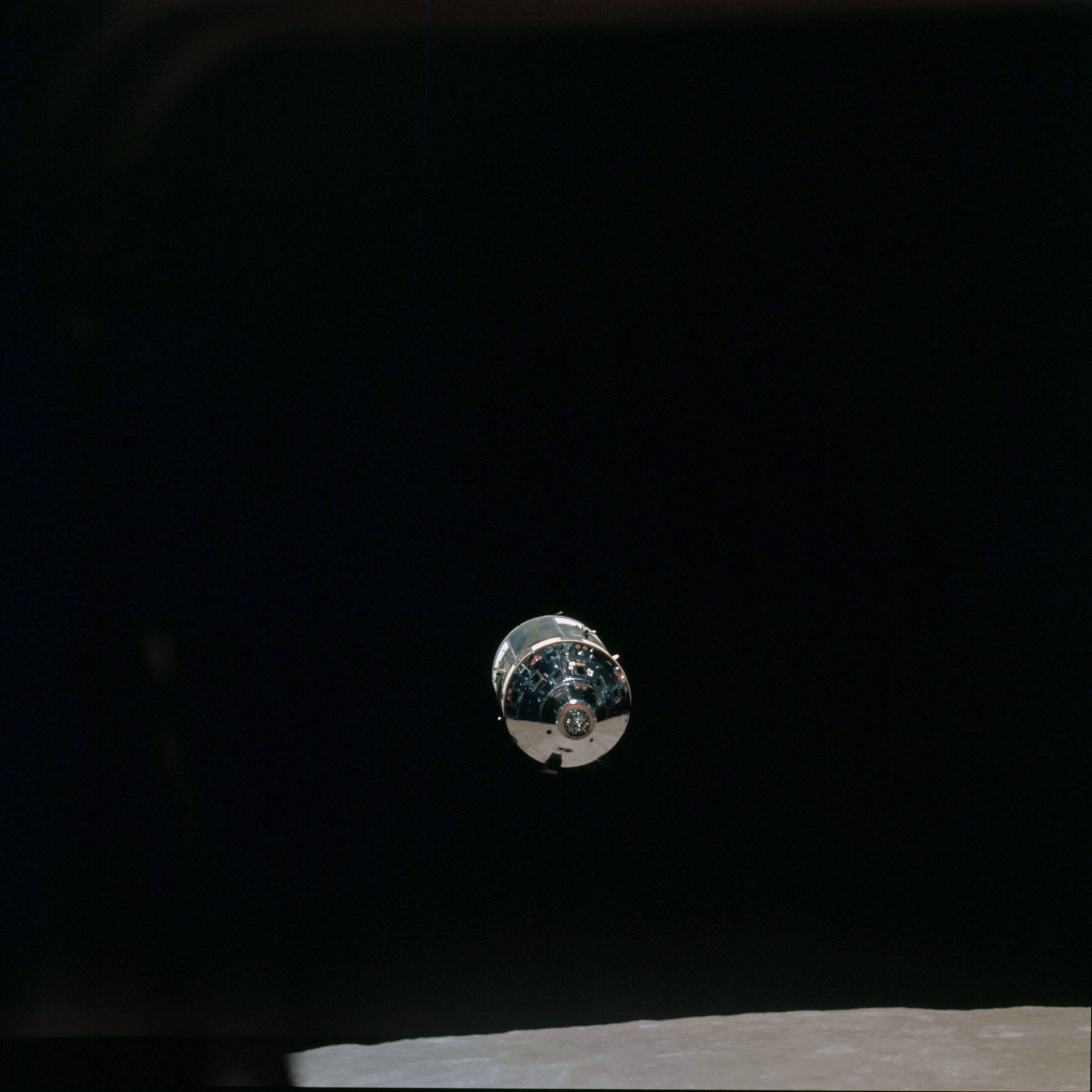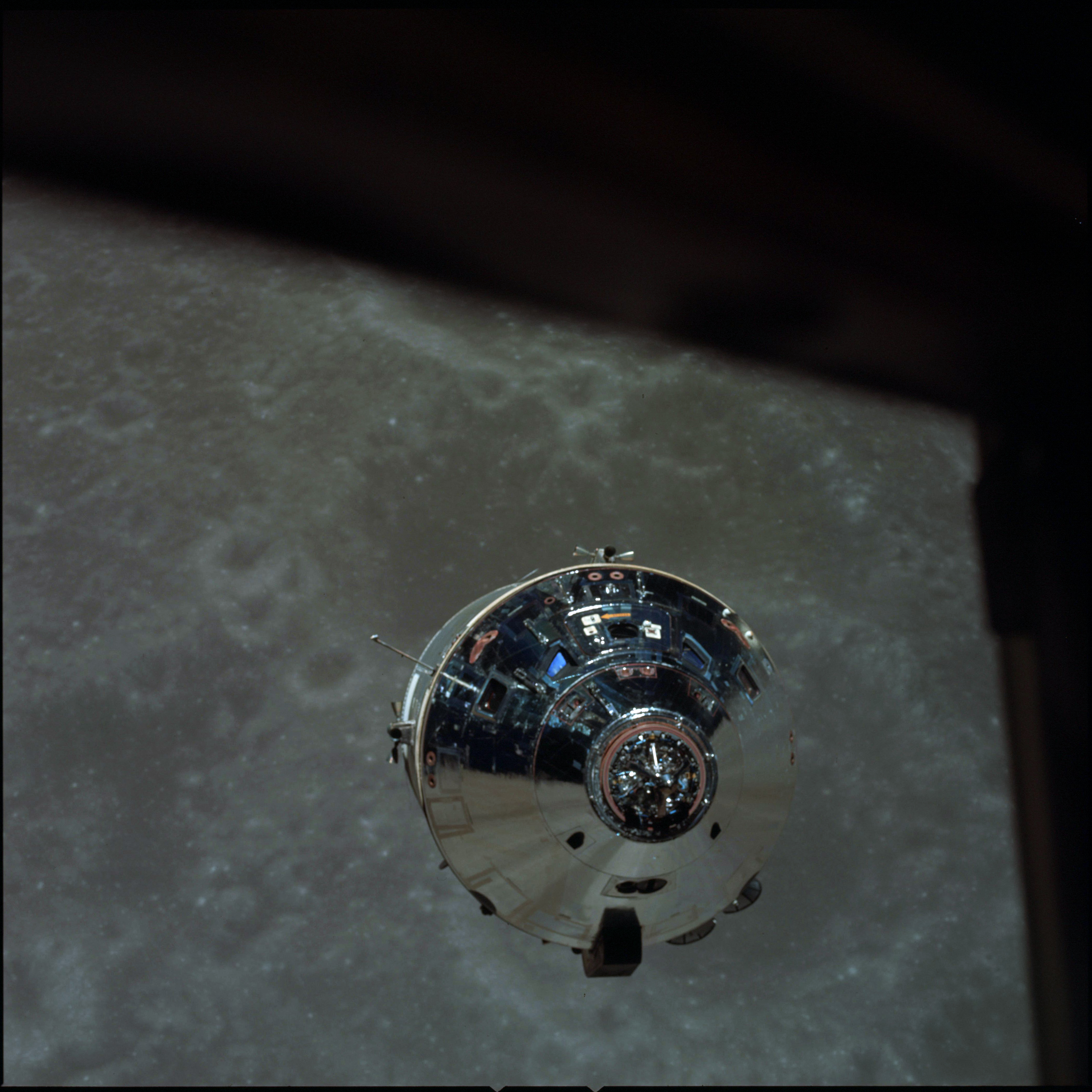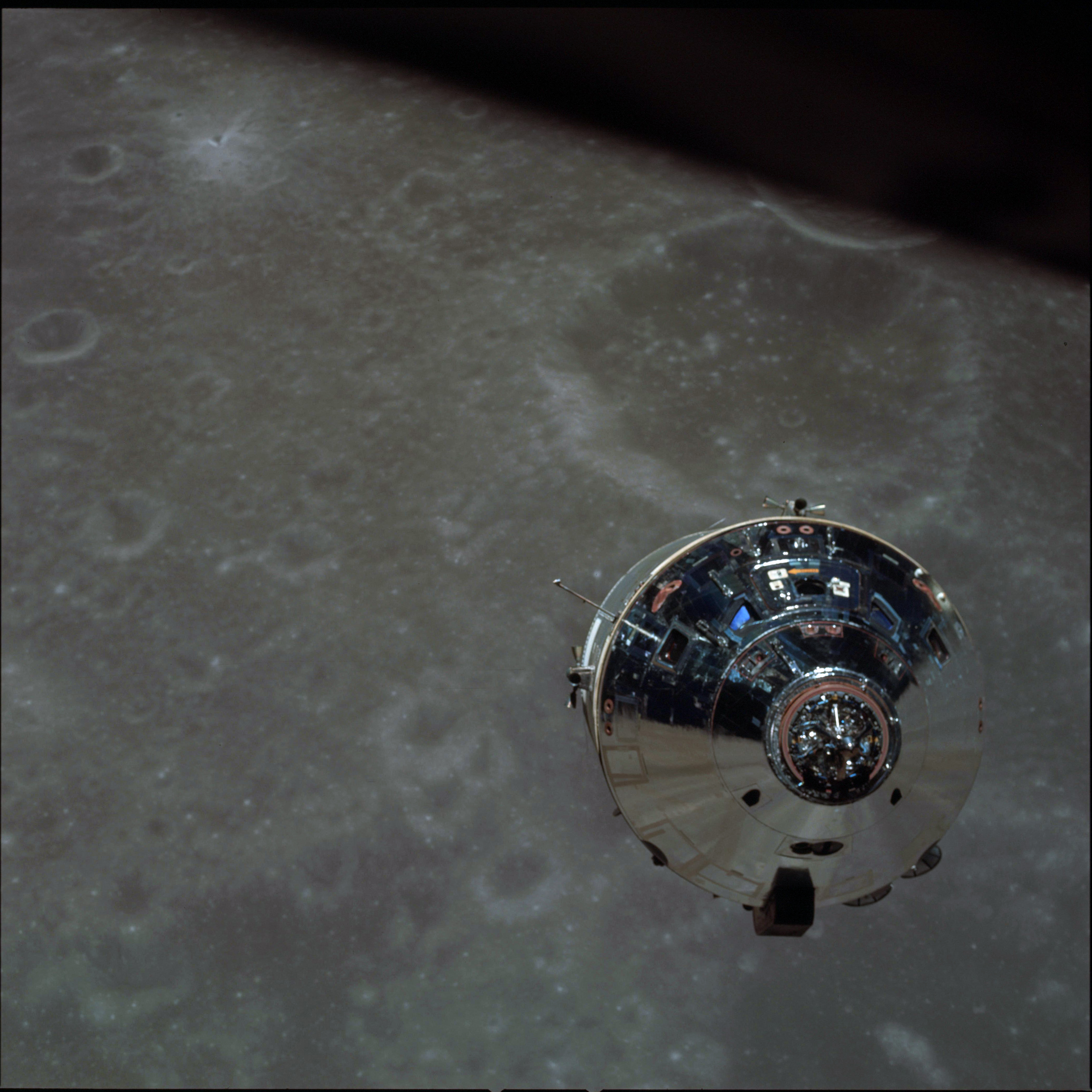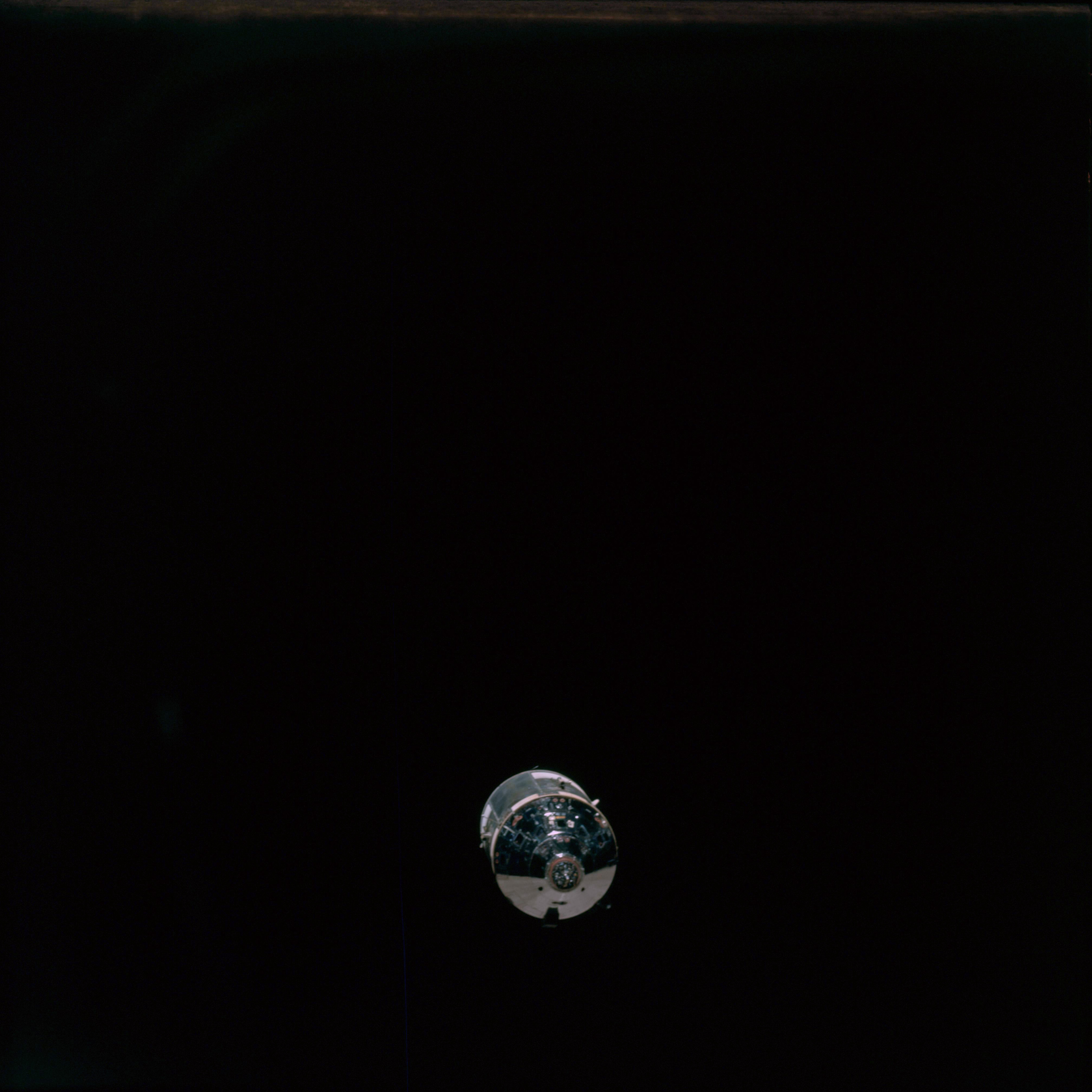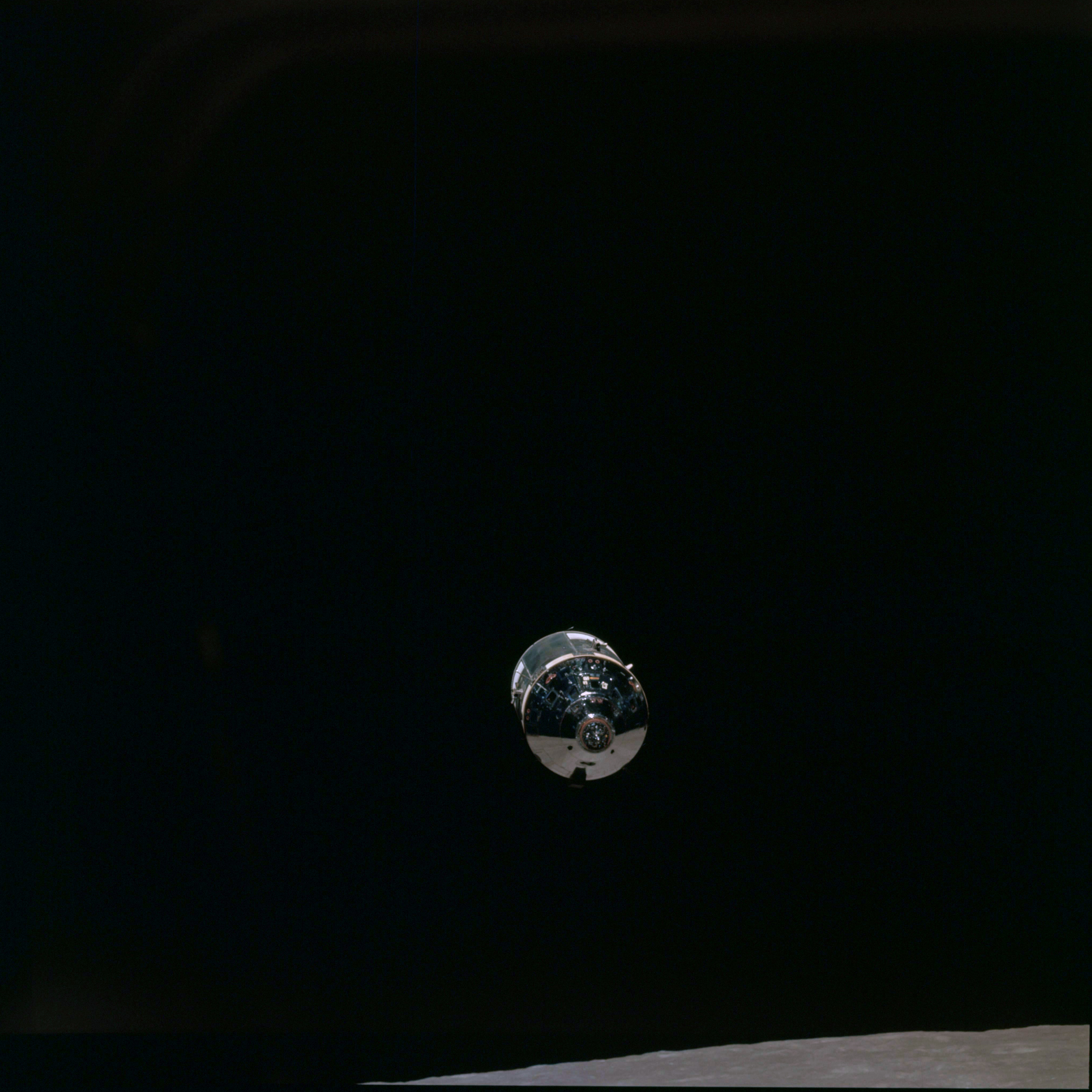 CSM Charlie Brown from LM Snoopy during rendezvous in lunar orbit.