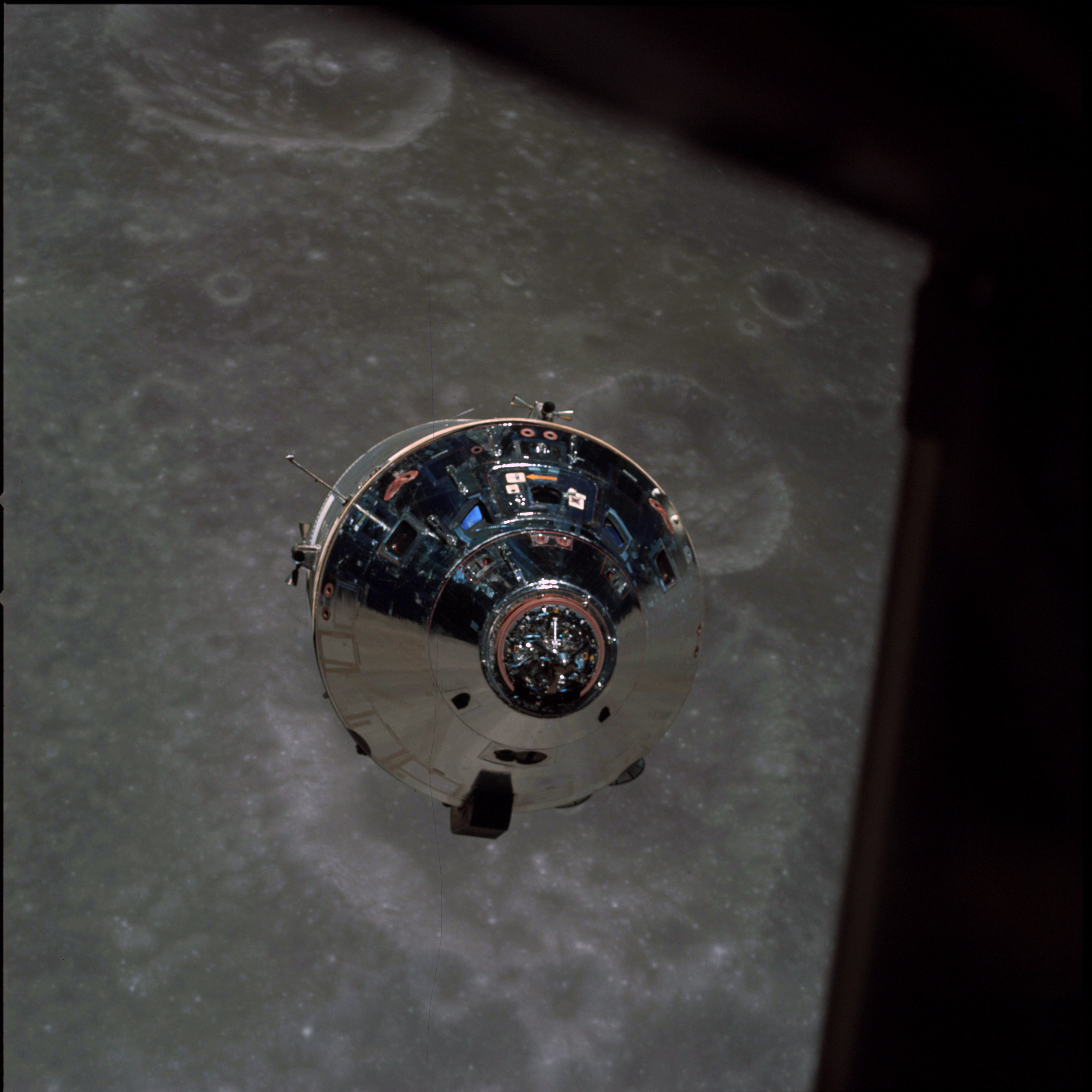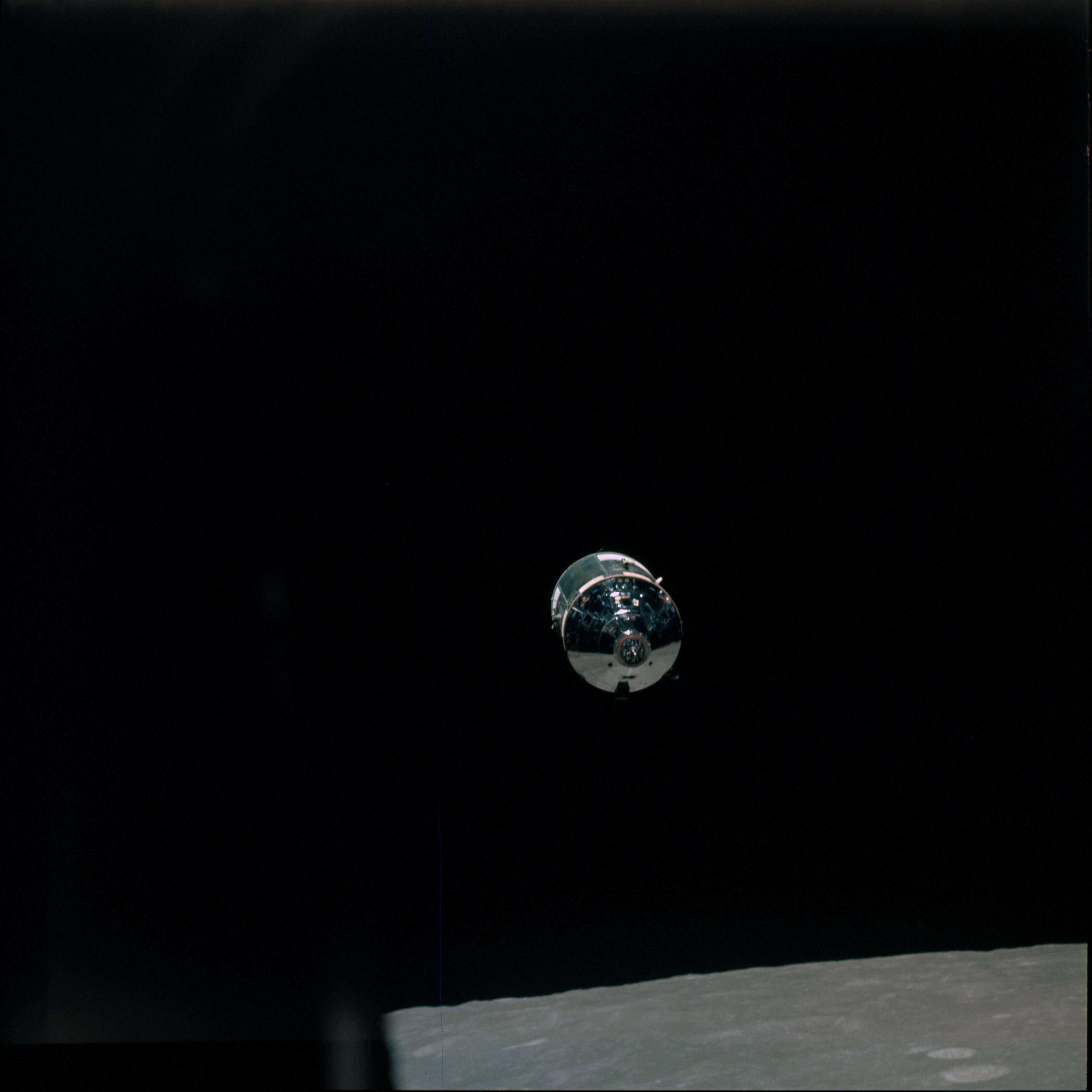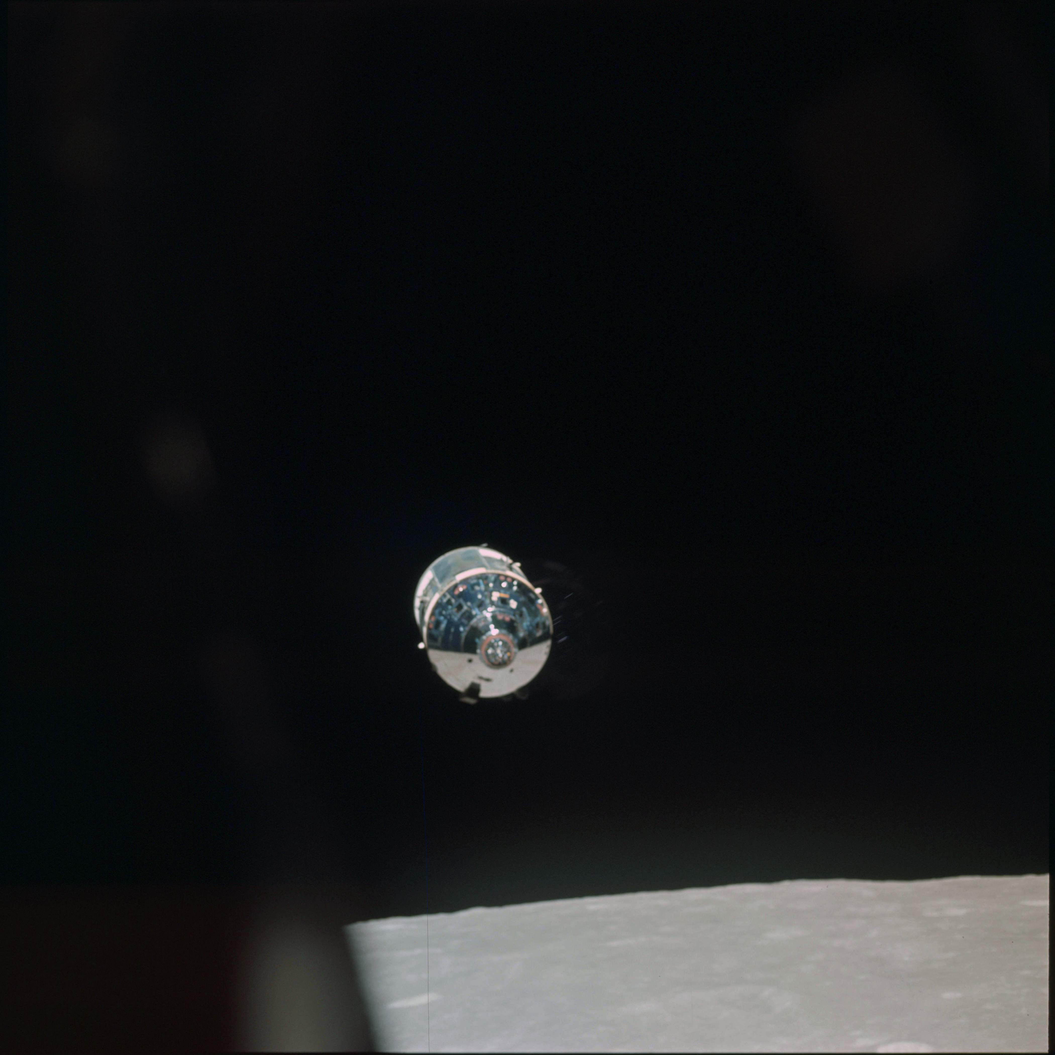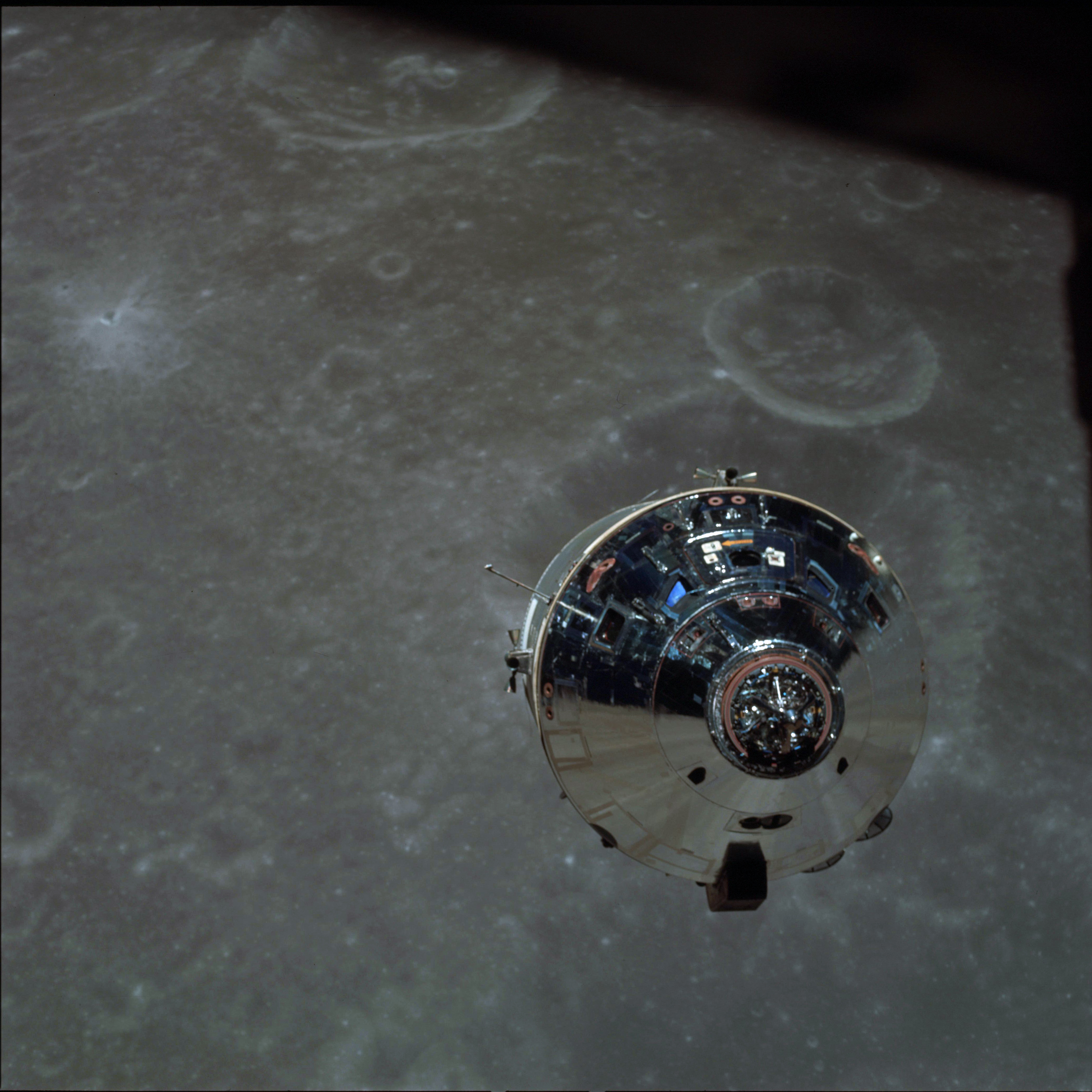 CSM Charlie Brown from LM Snoopy during rendezvous in lunar orbit.