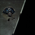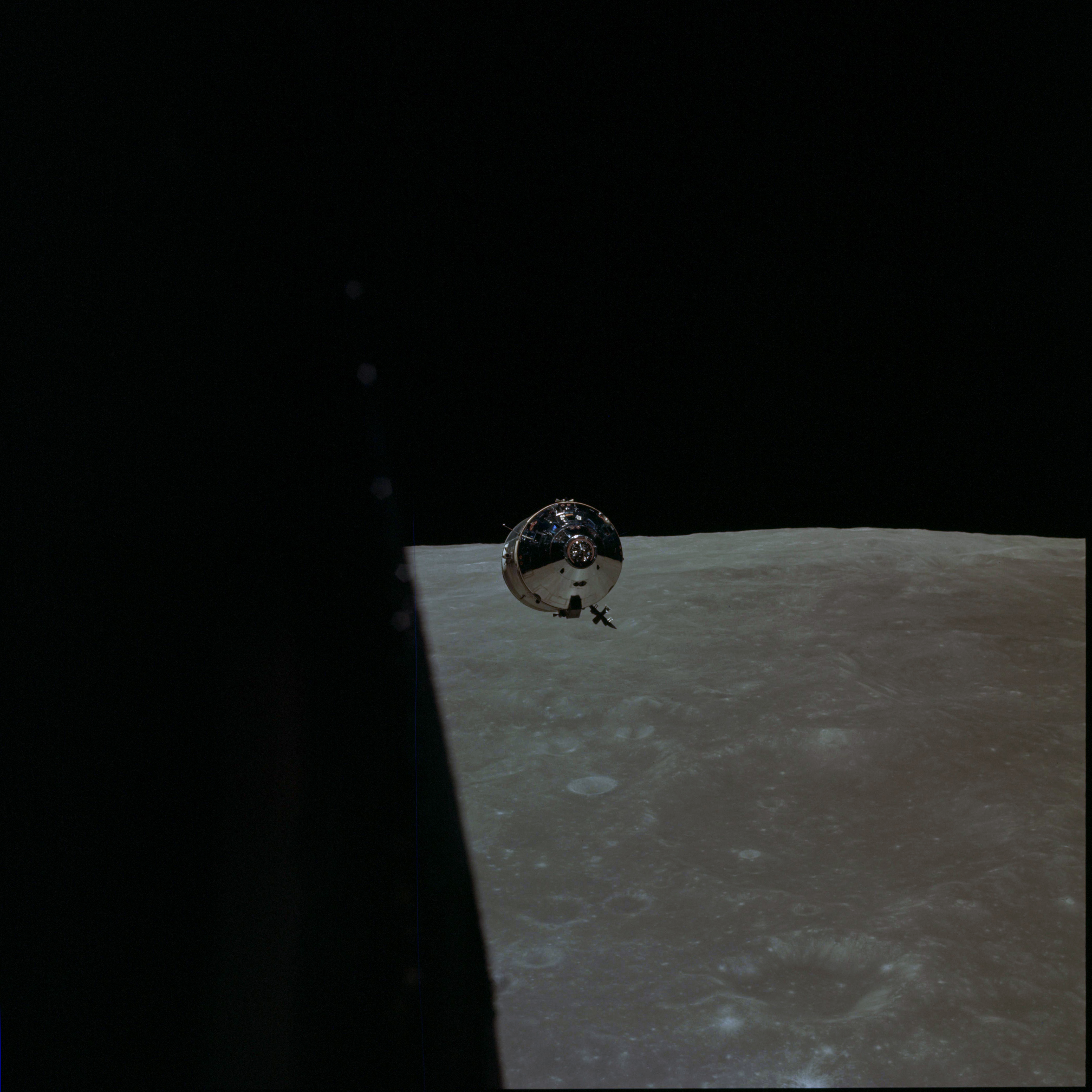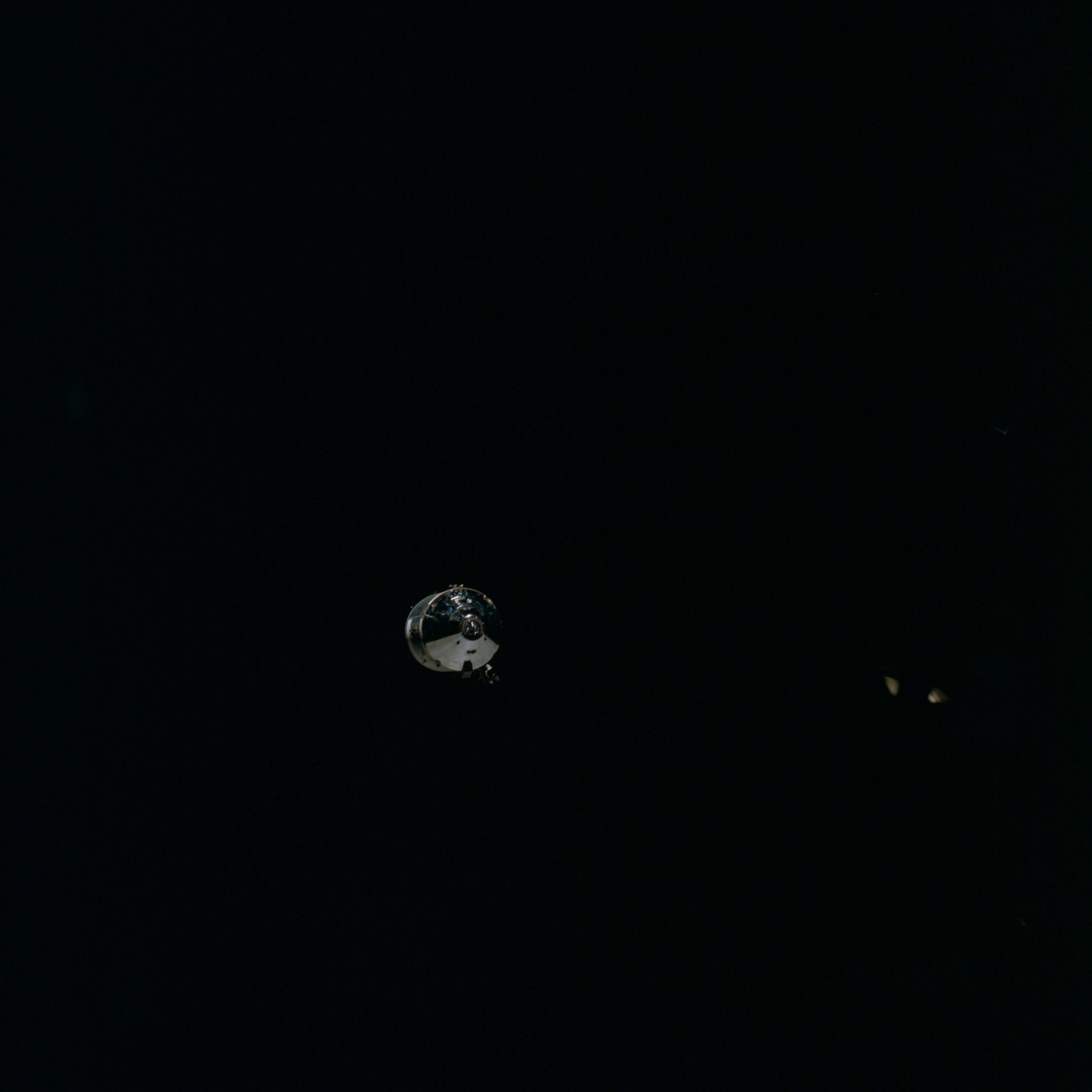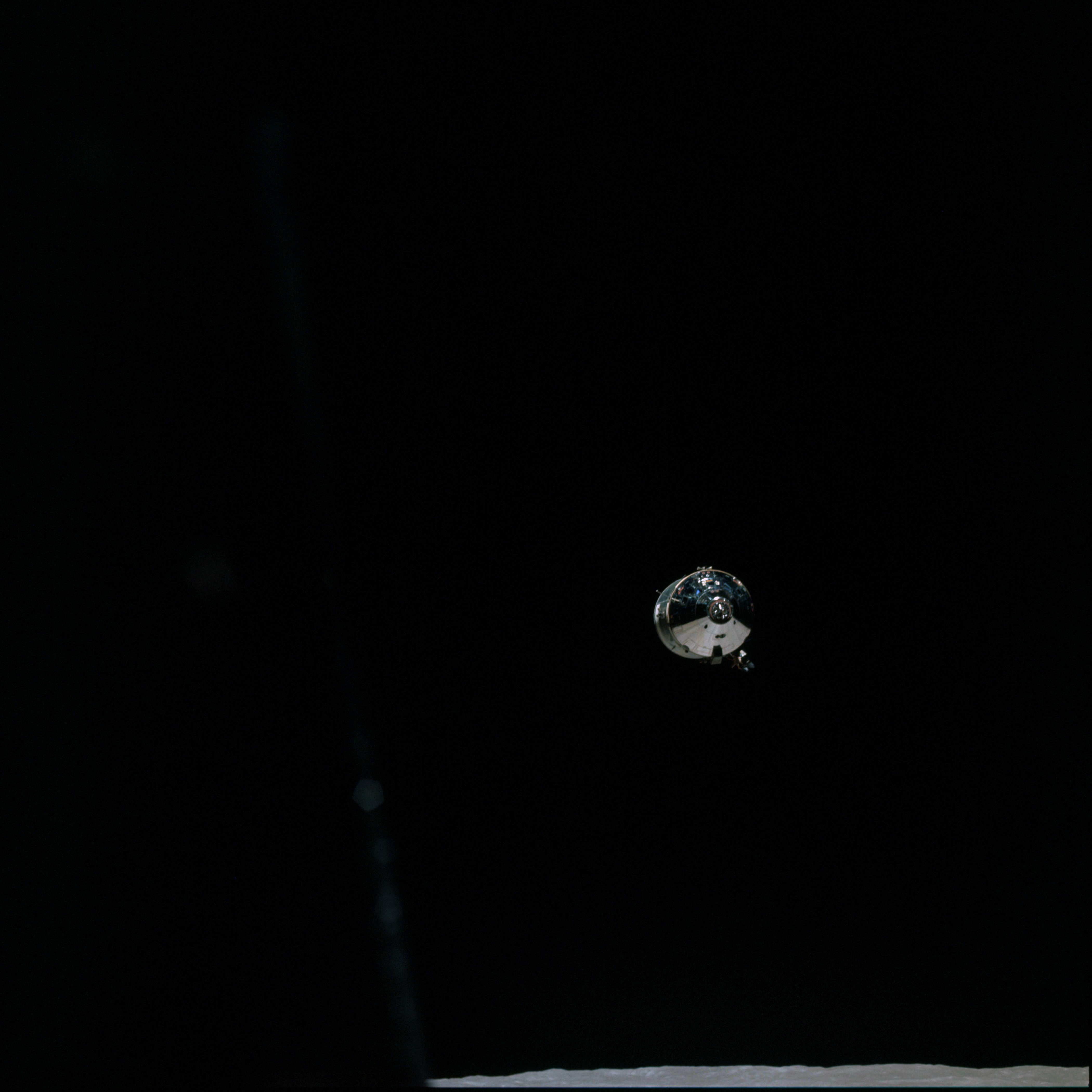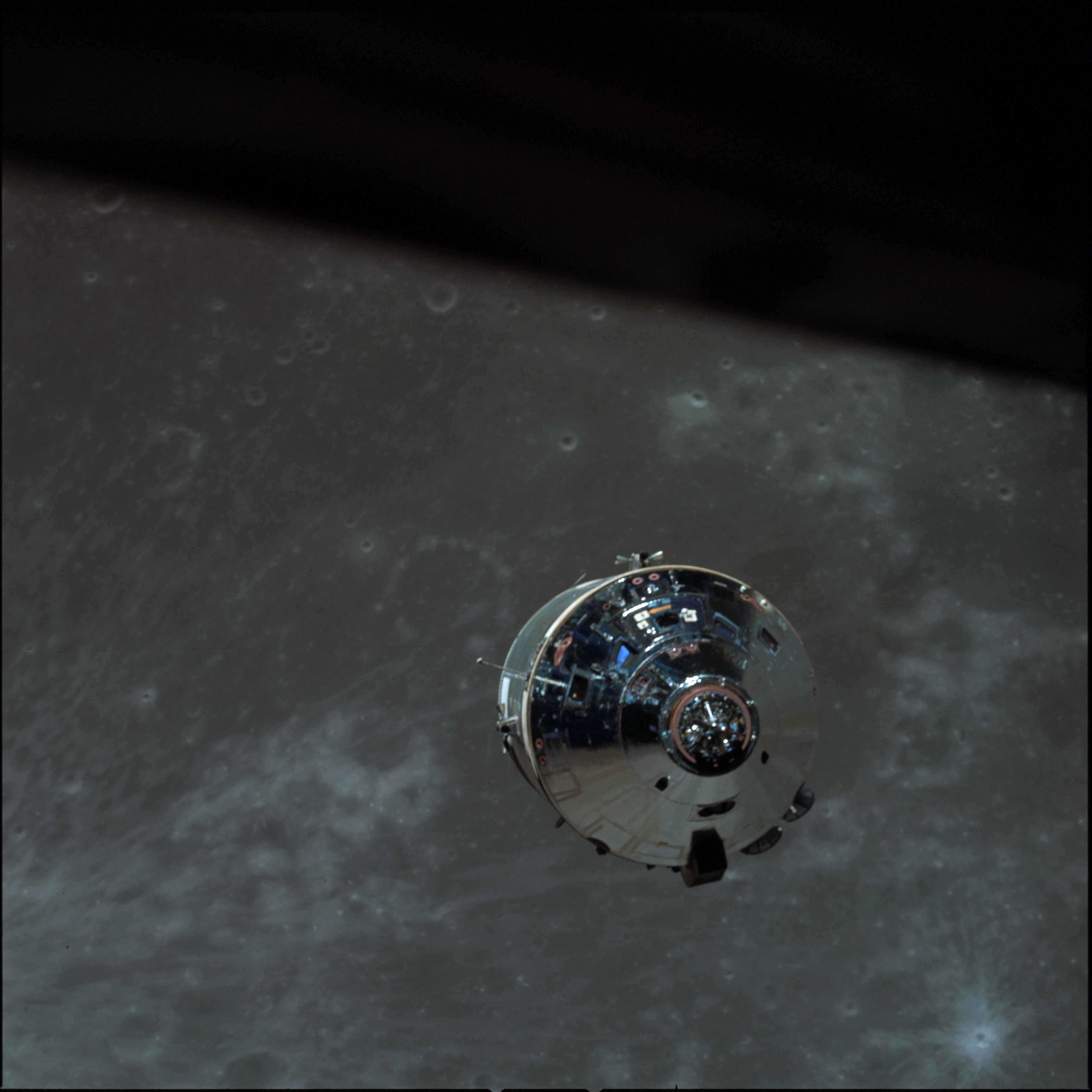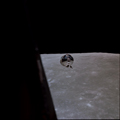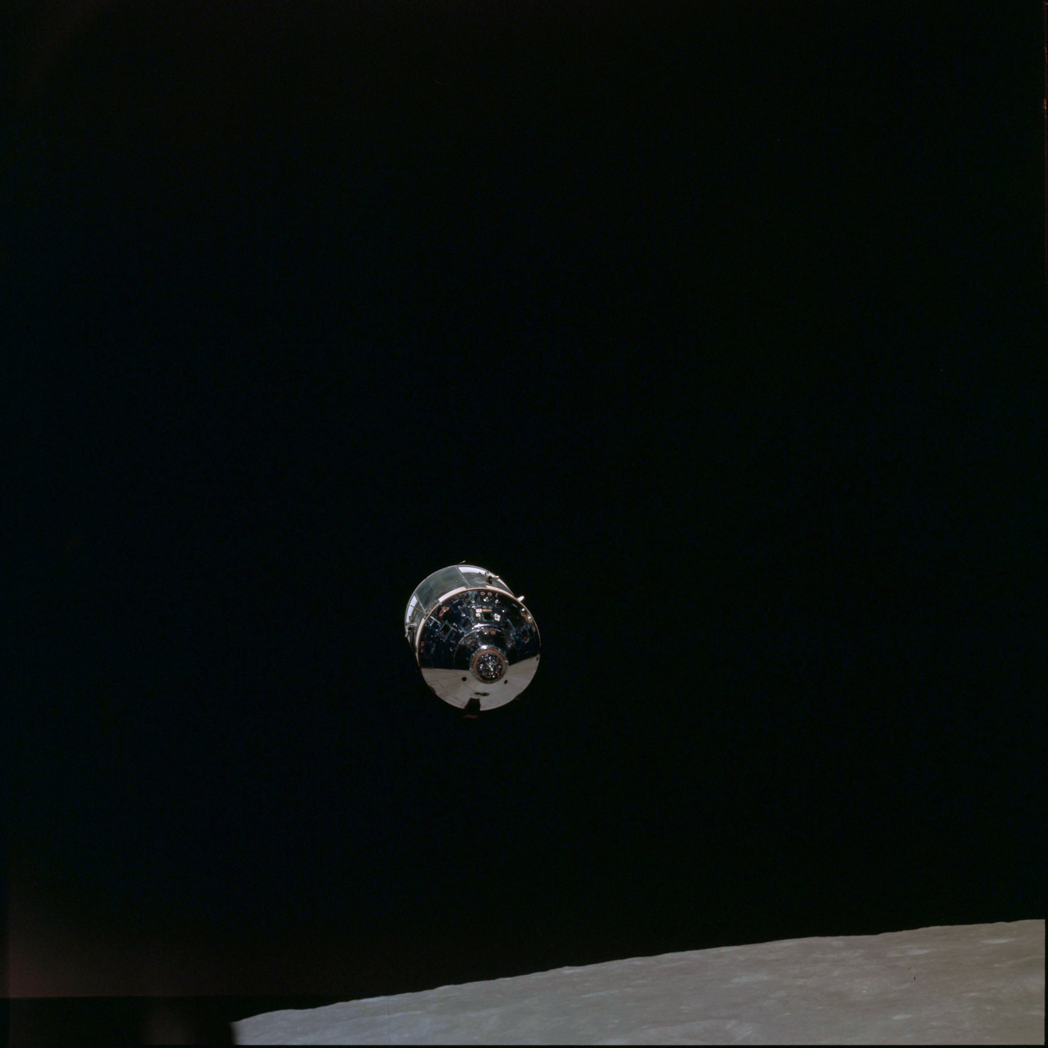 CSM Charlie Brown from LM Snoopy during rendezvous in lunar orbit.