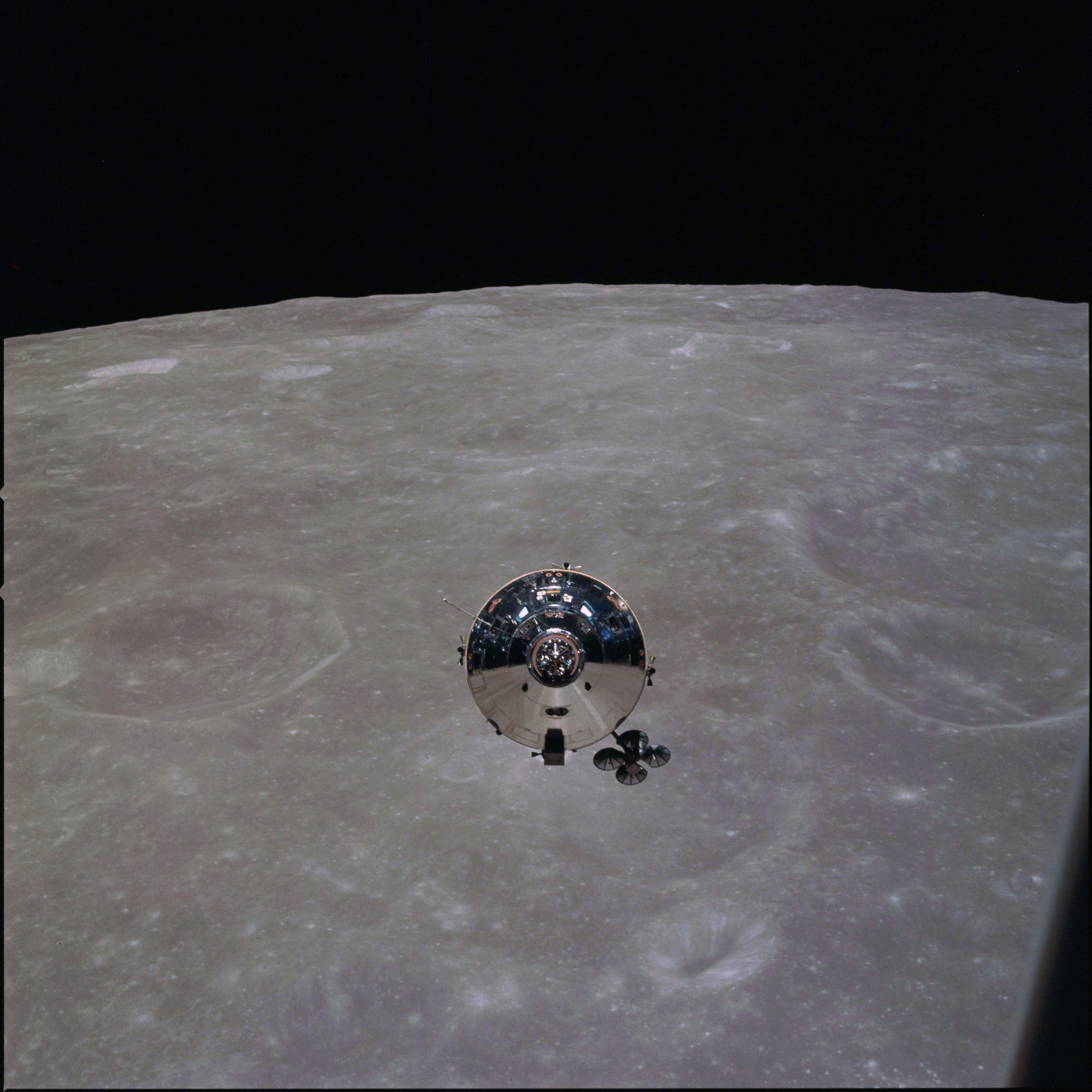 CSM Charlie Brown from LM Snoopy during rendezvous in lunar orbit. Bright craters Glazenap E, and beyond, F on lower right.