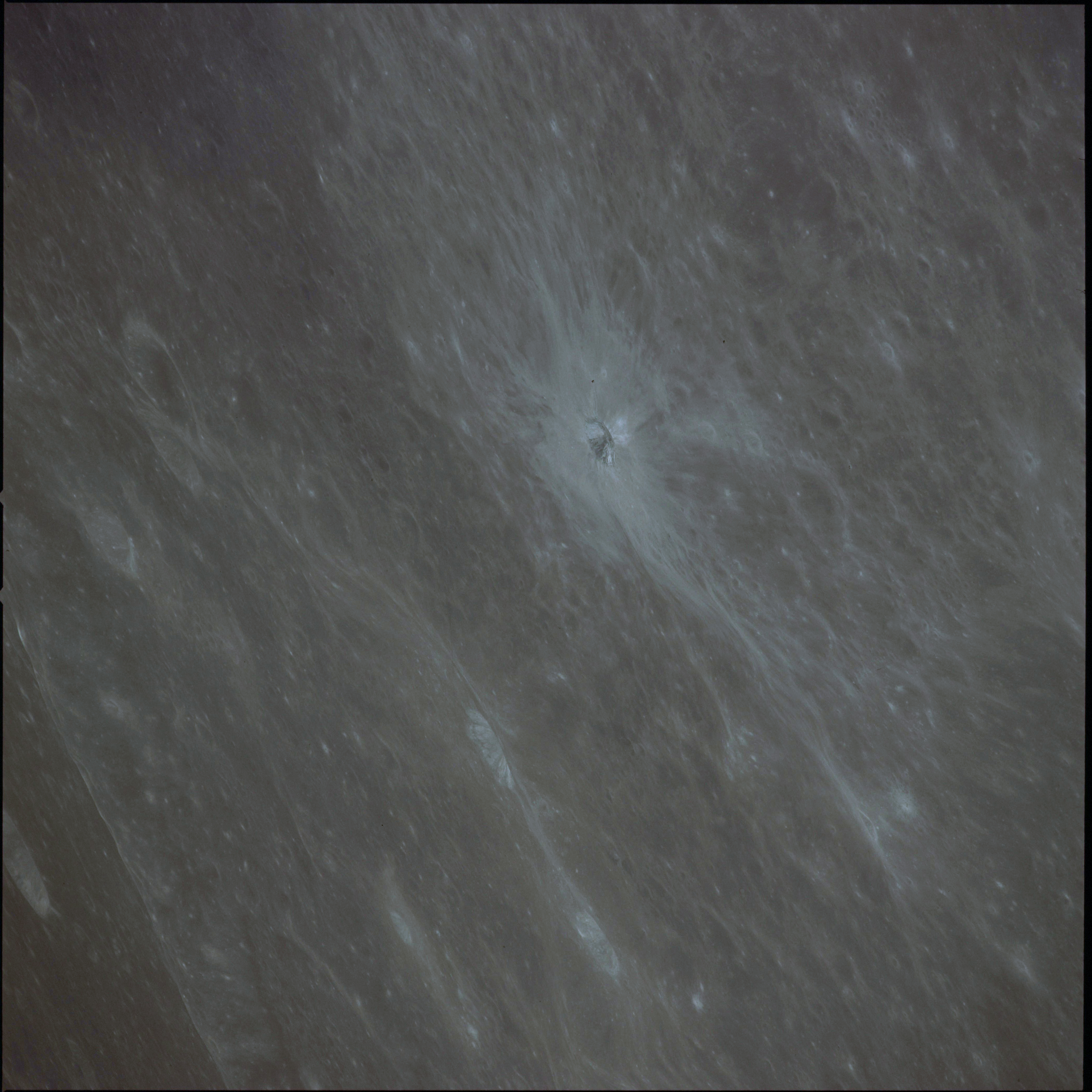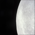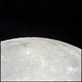CSM Charlie Brown from LM Snoopy during rendezvous in lunar orbit. Oblique over Tasso and Hugo.