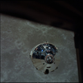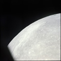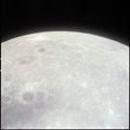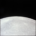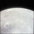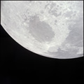 CSM Charlie Brown from LM Snoopy during rendezvous in lunar orbit. Crater Soddy Q just this side of bright crater.