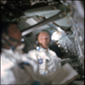 Out of focus view of John Young (with eye patch) and Eugene Cernan in the CM during the trans Earth coast. 80mm |