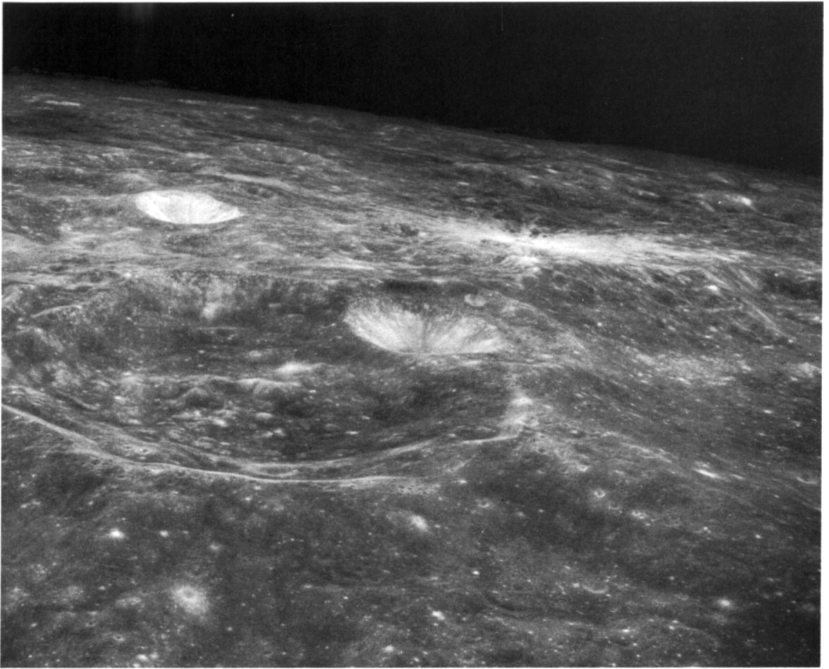 Mendeleev, Hartmann, Green & Moissan. Target of opportunity 30. 80mm. 136.4° E, 3.5° N. Rev 13. Taken by Eugene Cernan. |