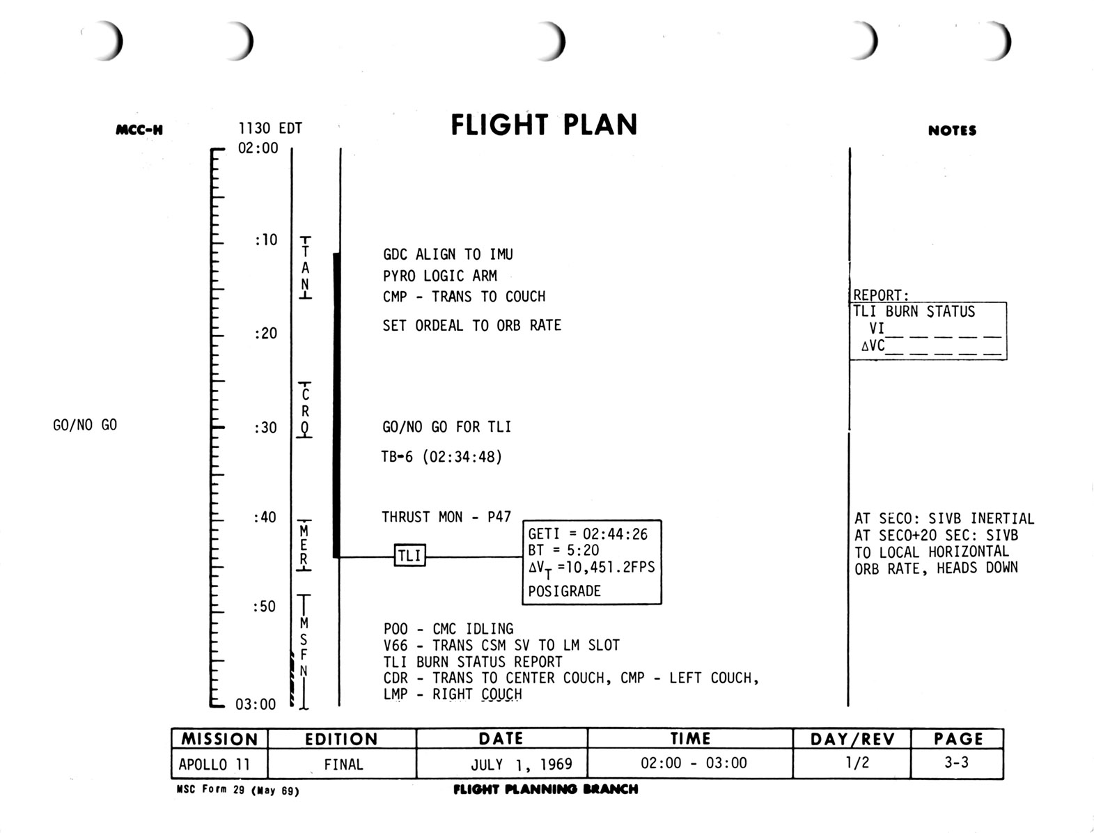 The Flight Plan presented here is not identical to that used on board but there are likely to be very few differences. These pages were derived from a PDF of a scan of the Flight Plan that was sent to the Honeysuckle Creek Tracking Station in Australia few days prior to the flight. The PDF was created by Colin Mackellar for the honeysucklecreek.net website and can be downloaded here.