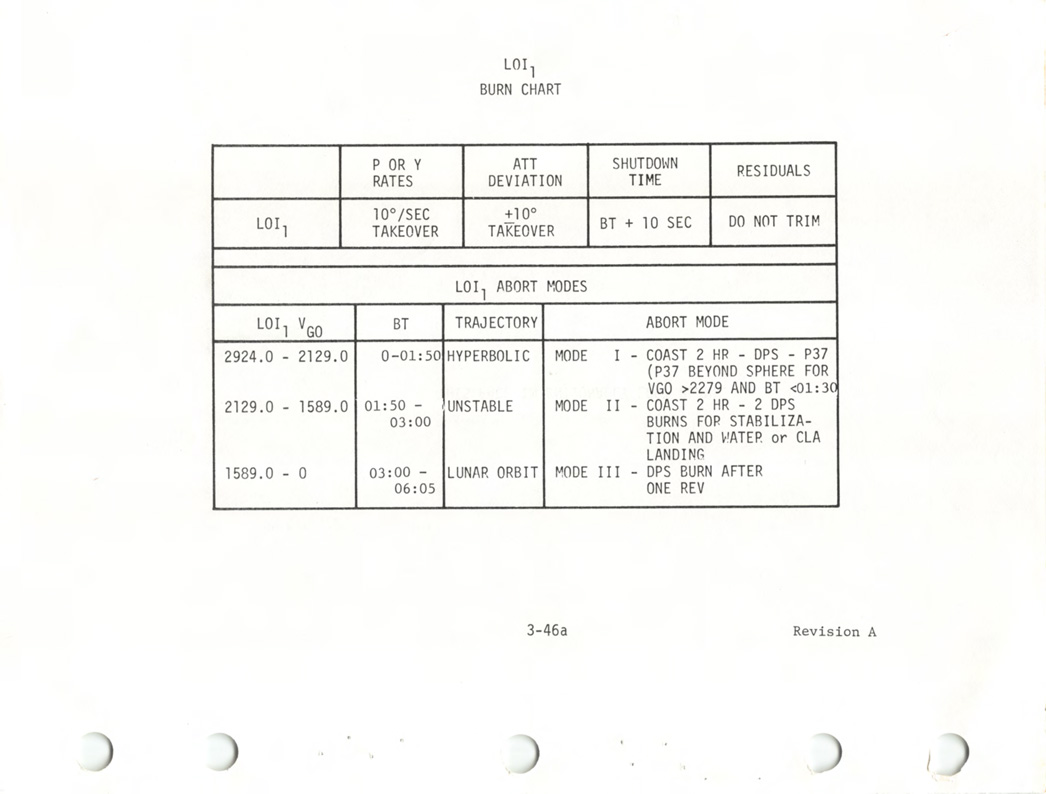 It was likely that the engine on the S-IVB stage would slightly under- or over-perform and this time was only a guide. The goal was to achieve a certain velocity. However, in case the S-IVB failed to automatically shut down, the crew had guide notes in the Flight Plan that told them when to force a manual shutdown. Page 3-2a (below) carried a table of actions that the crew should take if the TLI burn were to go awry. One item told them that if the burn were to continue for 6 seconds beyond the time given in the PAD, they should manually shut it down.