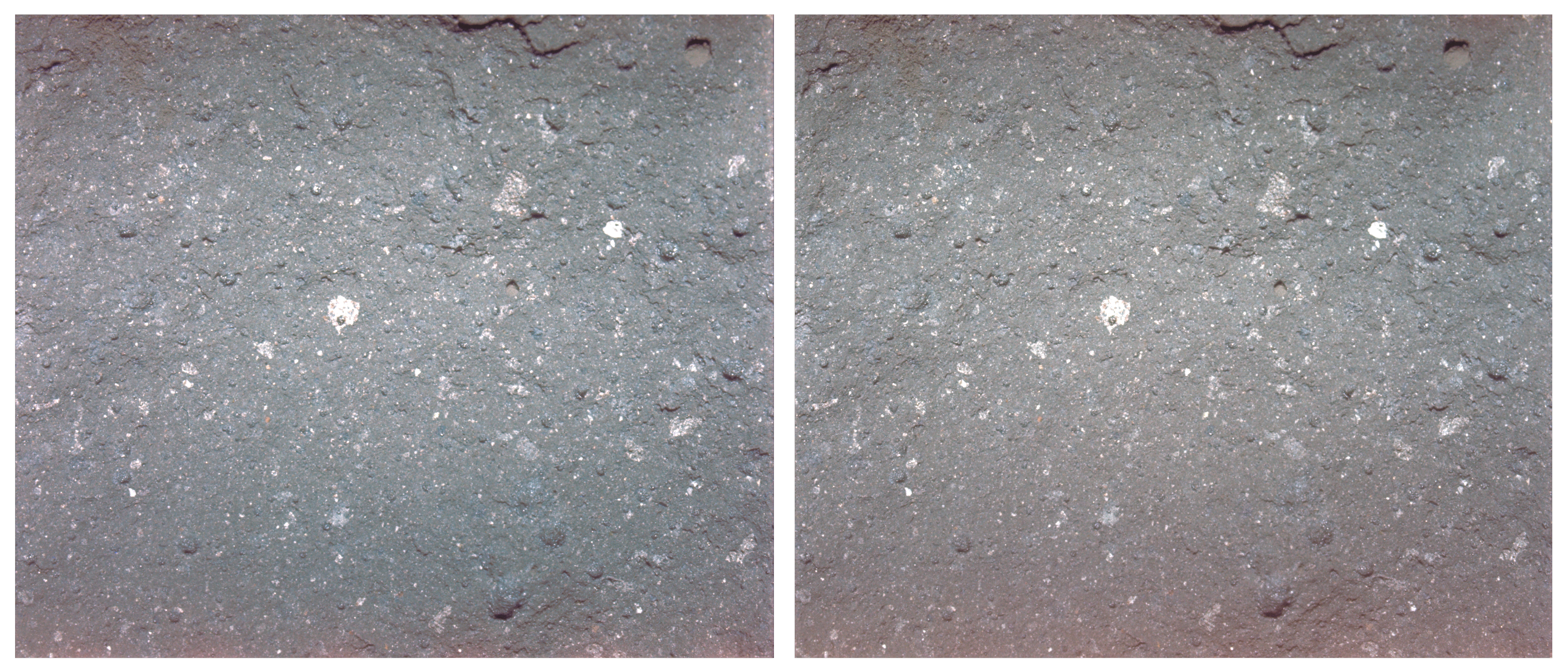 AS11-45-6710 Browse or print resolution. Stereo image of lunar surface. Surface of lunar rock with embedded 20-mm clast. The surface has many small pits from micrometeoriod impact. Approx field of view is 72 mm by 83 mm. Image credit: NASA/JSC/ASU |
