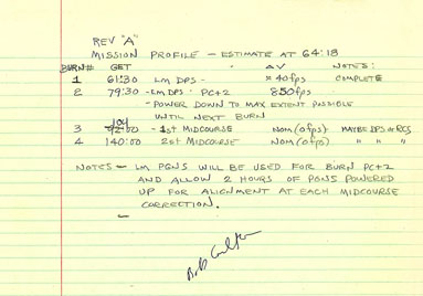 Handwritten notes on the burns required to get the crew home, timed to around this hour by the document.