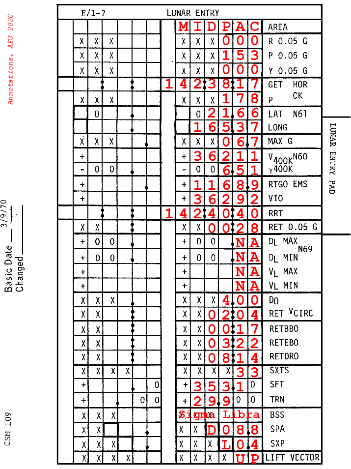 138:40:25 Lovell: Okay, Joe. Standing by to copy the entry PAD.