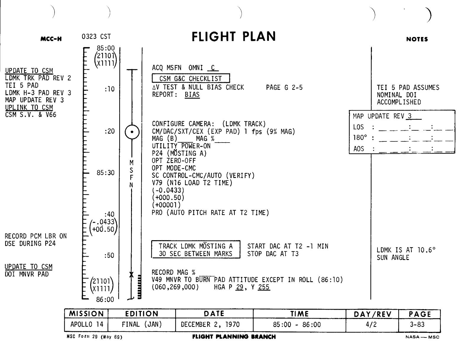 084:29:57 Roosa (onboard): No, what this is, is - we'll maneuver - we won't - Yes. We won't be torquing the vehicle to waste gas. This will just be a look at our landmark for a similar-type approach for tracking after Sep tomorrow, for the landing, and from the low altitude. Give me a hack at acquisition time. Even though on the actual tracking, you torque your spacecraft at 2 degrees per second. [Garble] will become a problem. Okay. Here's the Hycon for the top - topo.