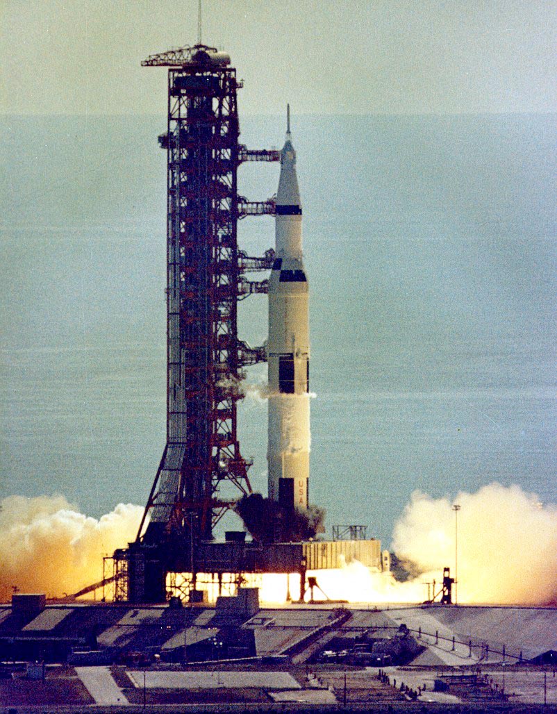 NASA image KSC-71PC-543 shows the vehicle on the pad as the engines build up to their full thrust.