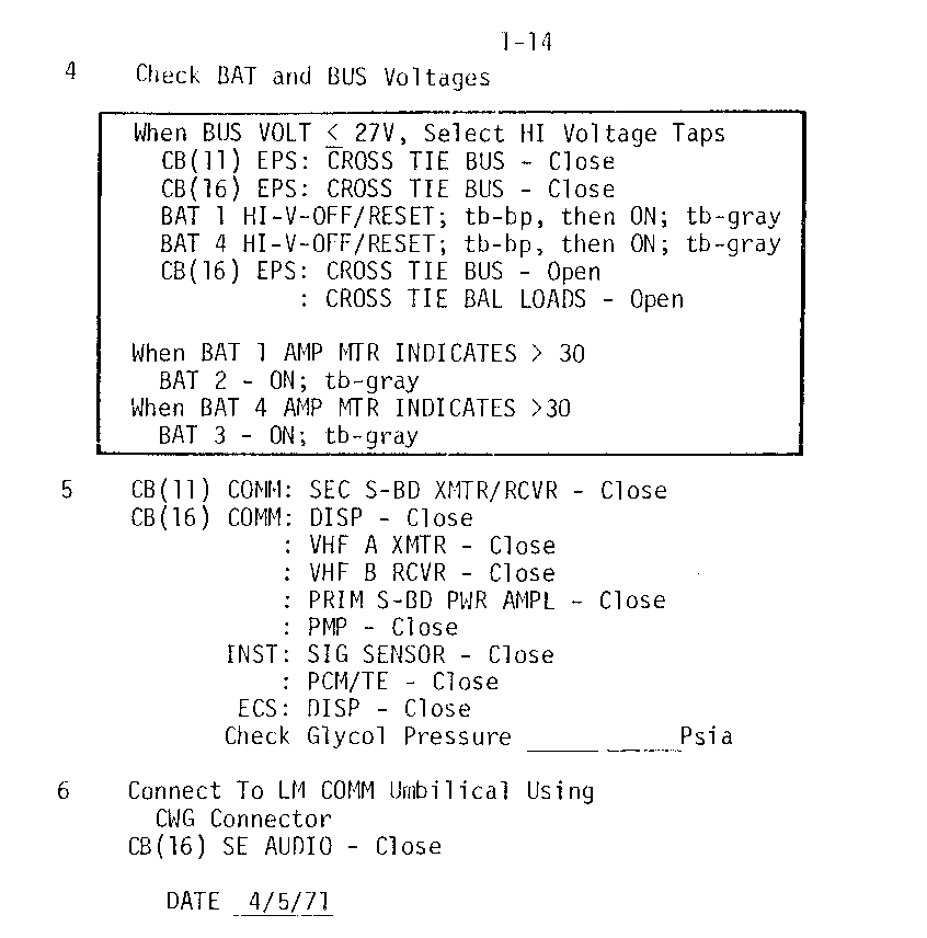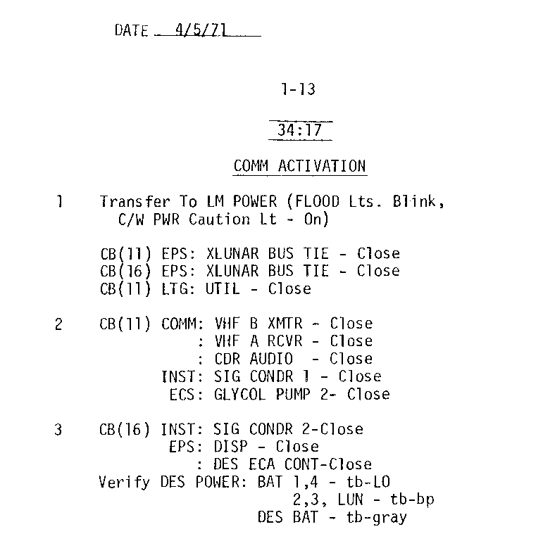 049:43:43 Allen: That's correct, and you're to start that checklist from the beginning. And at 57 plus 00, you move the CSM PTC procedures to completion of our LM battery checkout. And I guess that's an item for Al. [Long Pause.]