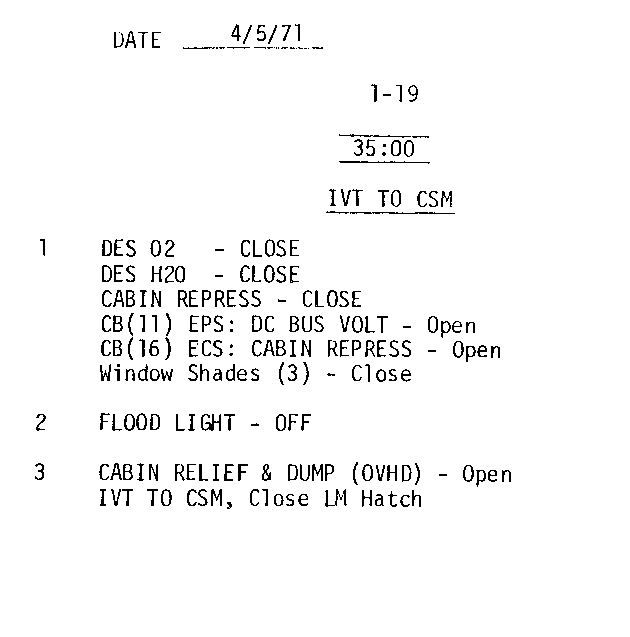 049:42:59 Allen: Roger, Jim. At 56 plus 50, start "CSM Systems Checklist, IVT to LM," and this is an item that's moved up from 57:20, by the way. [Long pause.]