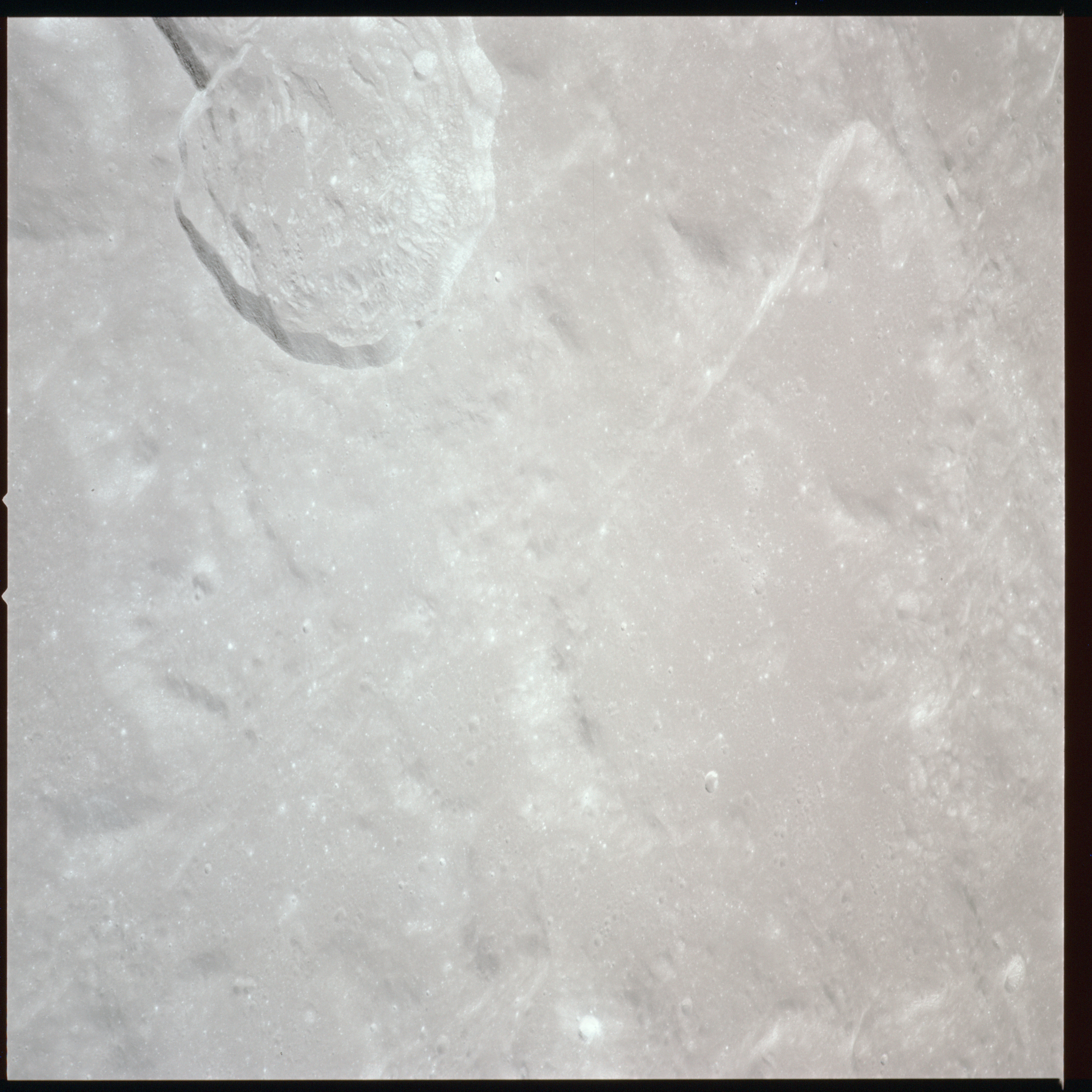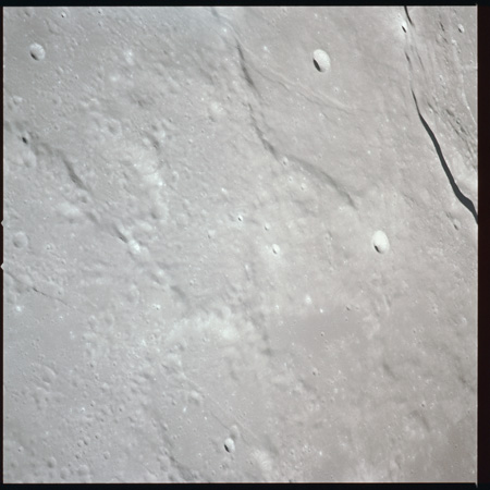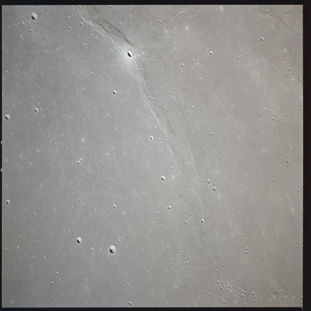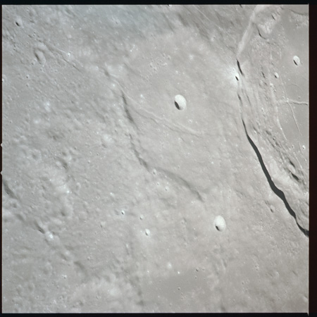 079:23:11 Scott: Houston, 15, we're coming up to Serenitatis, and it really looks like an ocean. The landforms, as we approach, are very rugged, very highly cratered, rounded, and we get to the shoreline and we see a few wrinkle ridges that have smoothed out. And we can see, on the far side, on the horizon, the mountains which pick up again on the western side of Serenitatis.