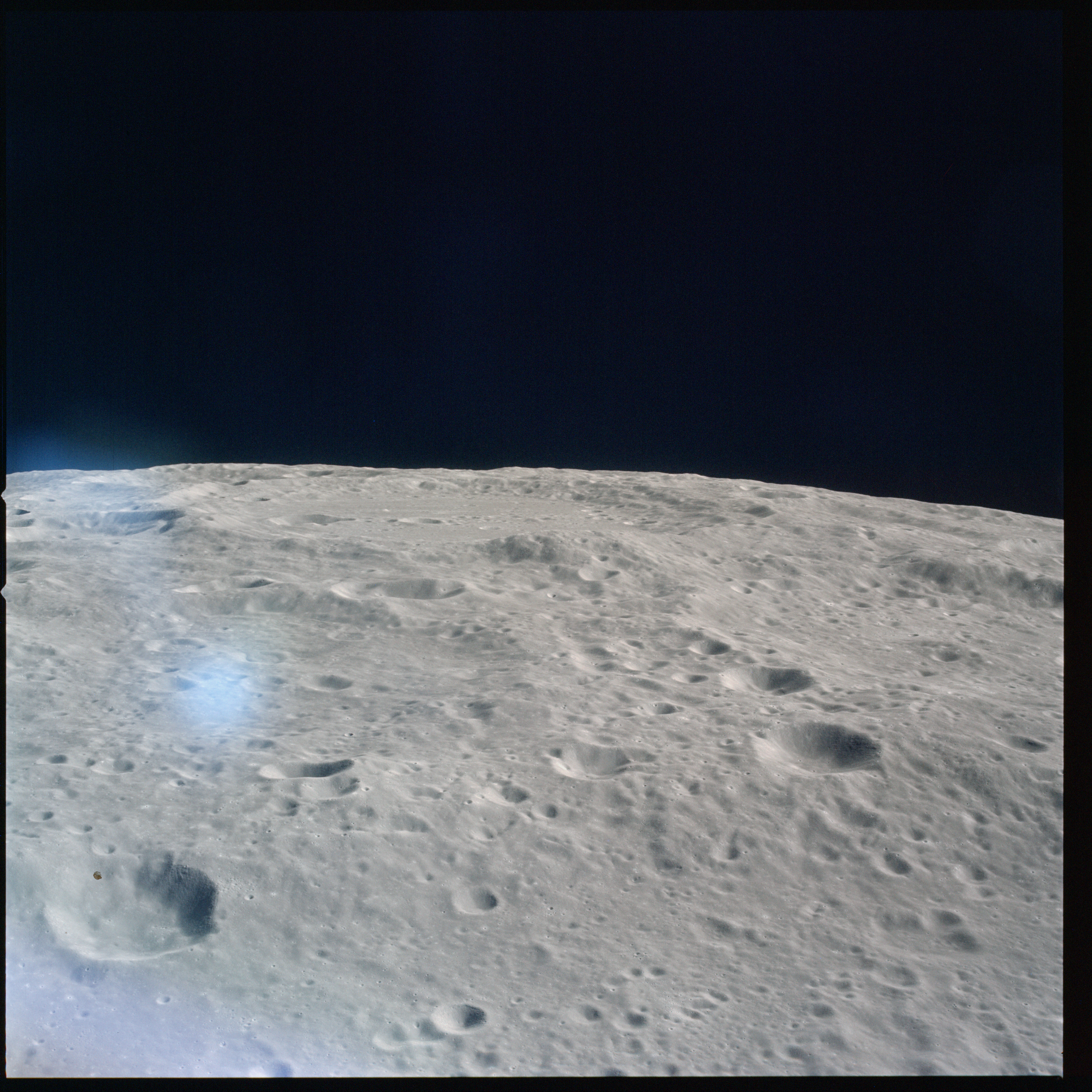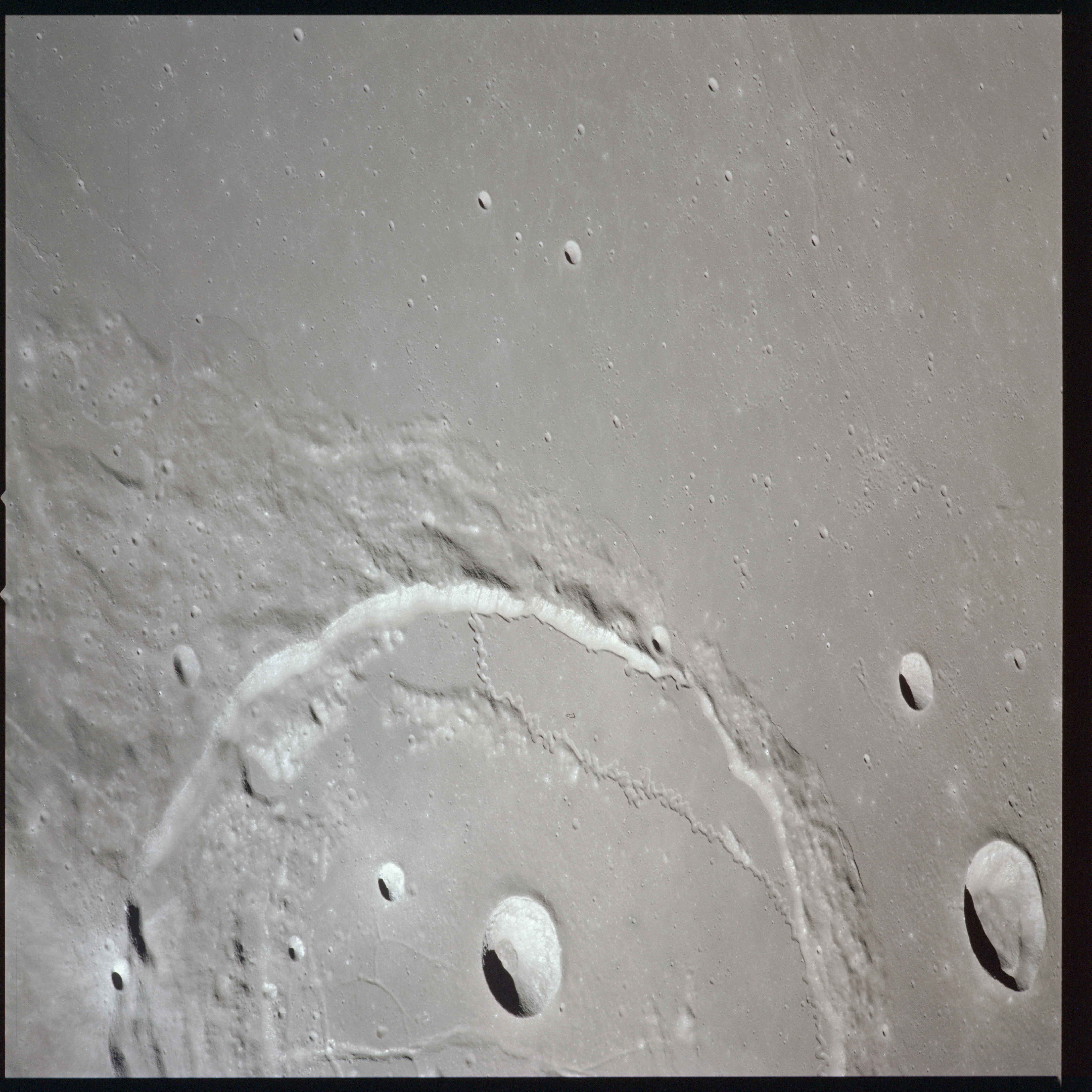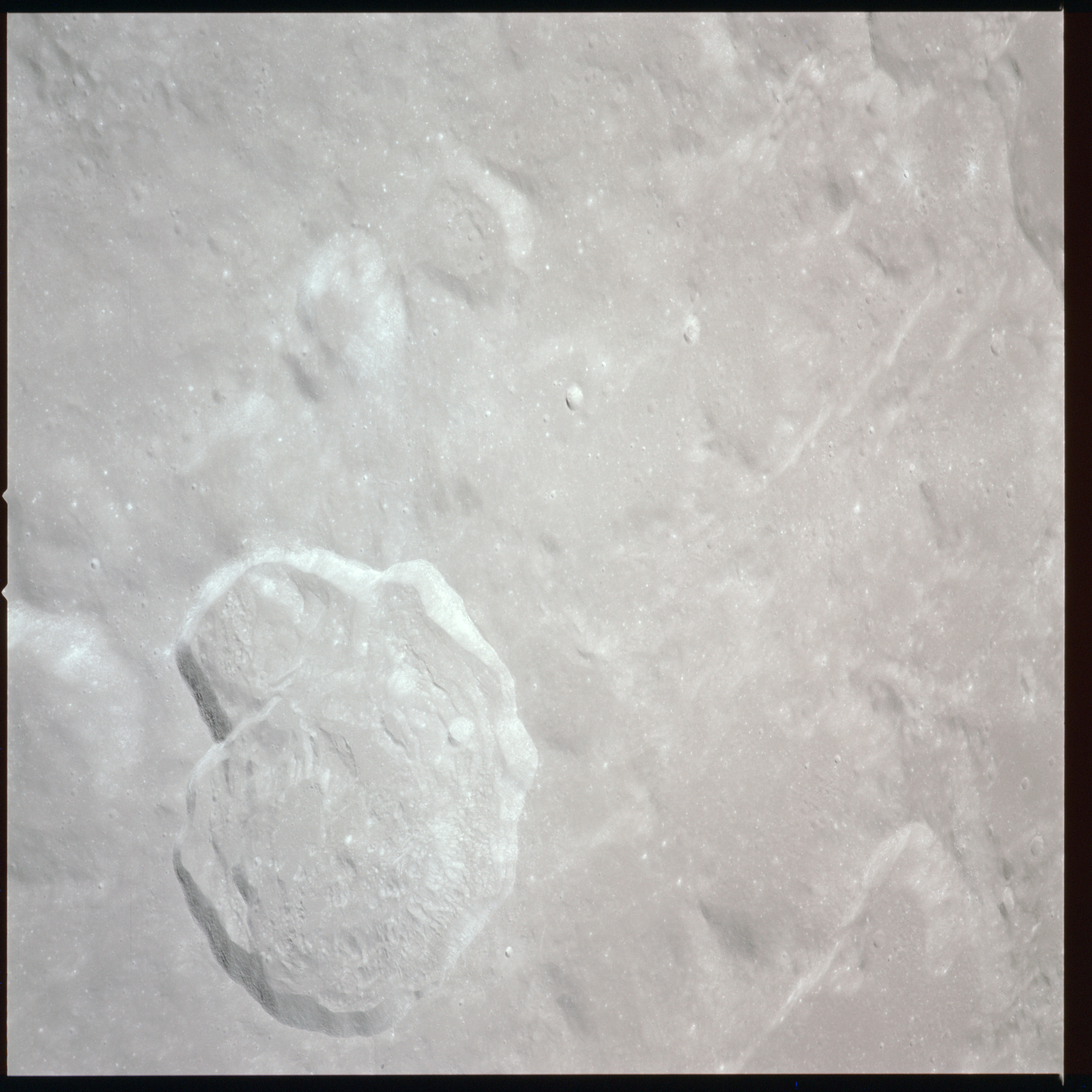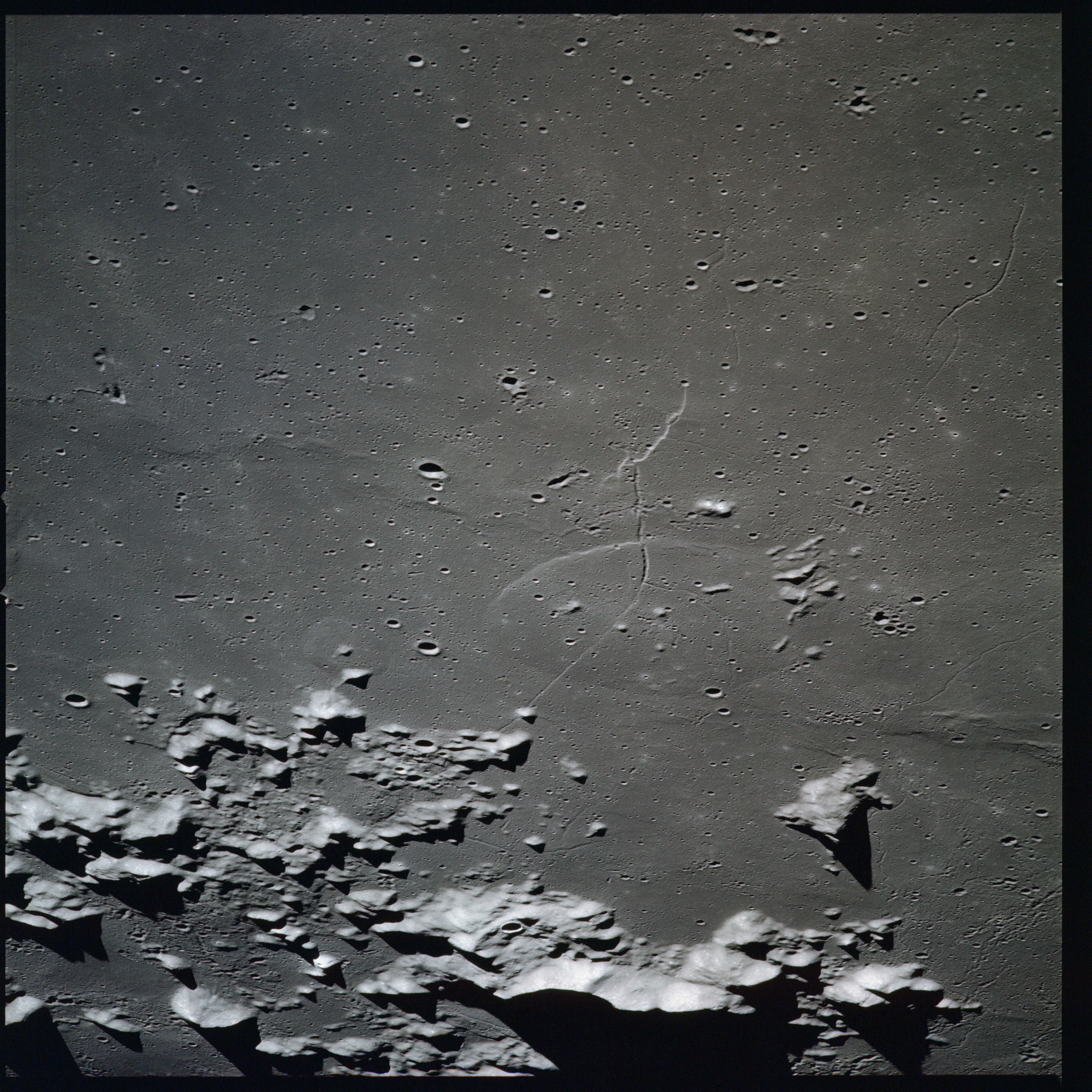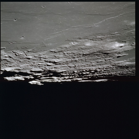 Apollo 15's current elliptical orbit has its low point over the Moon's far-side. Therefore, as they come towards their 315-km high point, or apocynthion, they can view across the entire width of Mare Serenitatis in one eyeful. Below them are the Montes Taurus which form the eastern rim of the Serenitatis basin while looking to the west, they can see Montes Haemus, the southwest range, and Montes Caucasus, the northwest range.