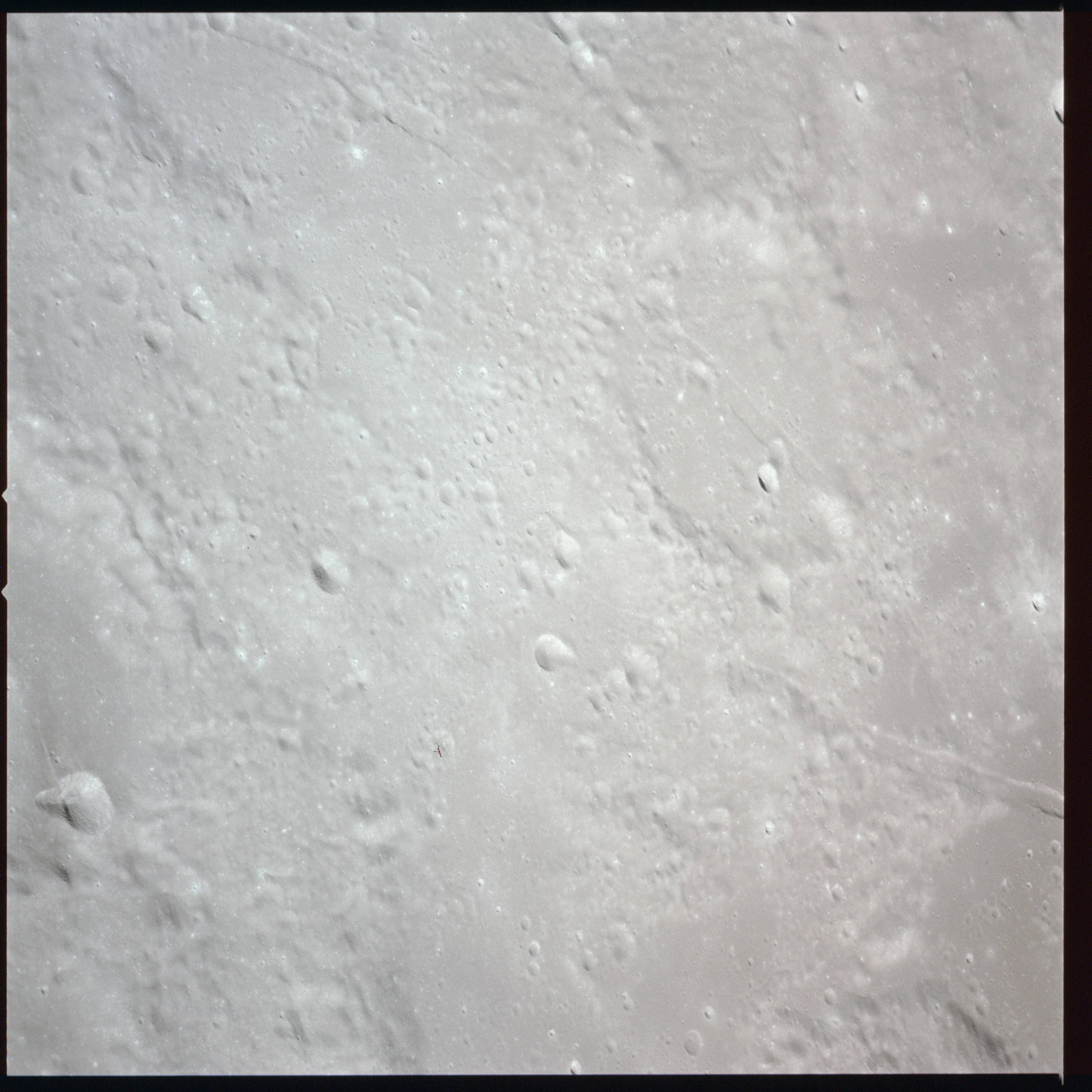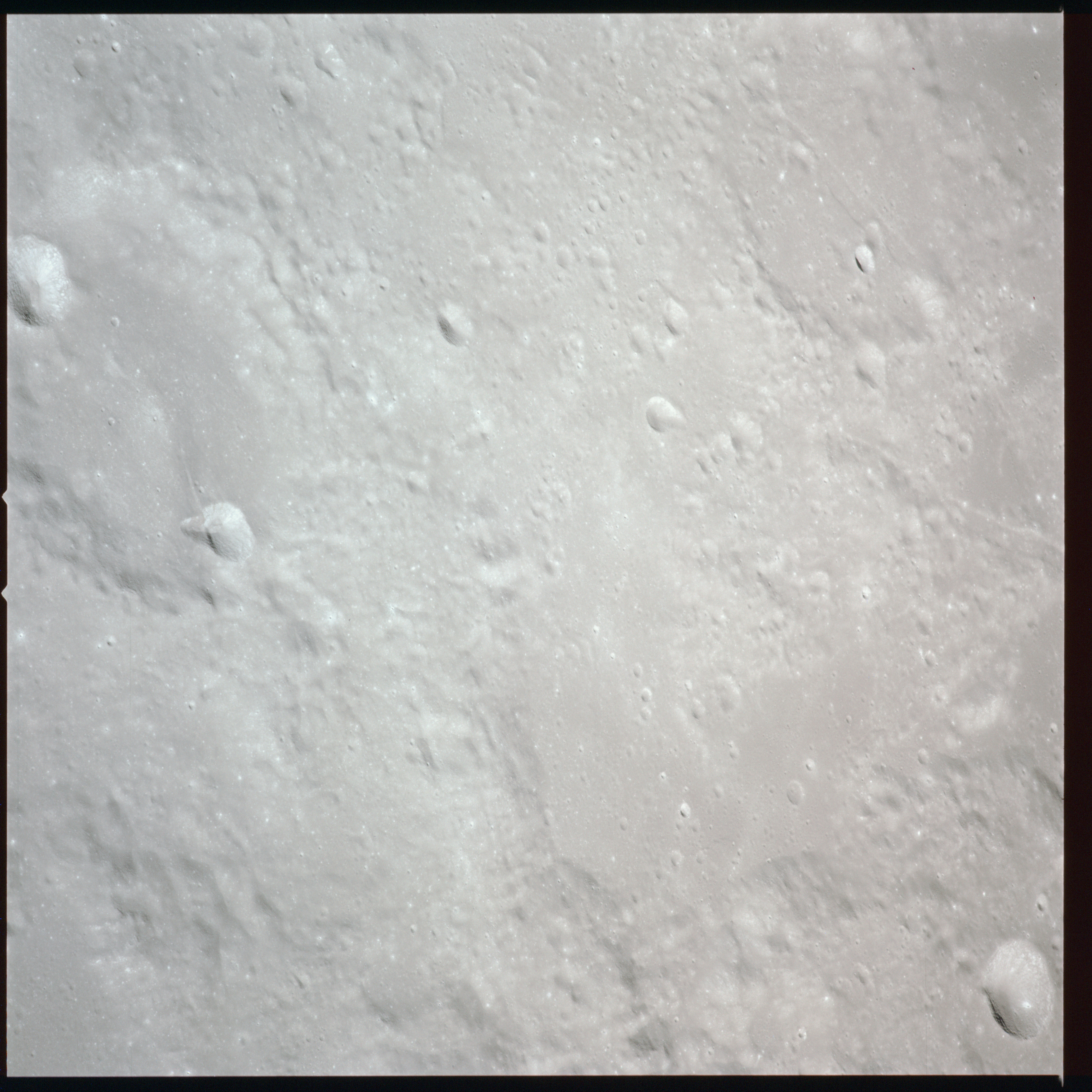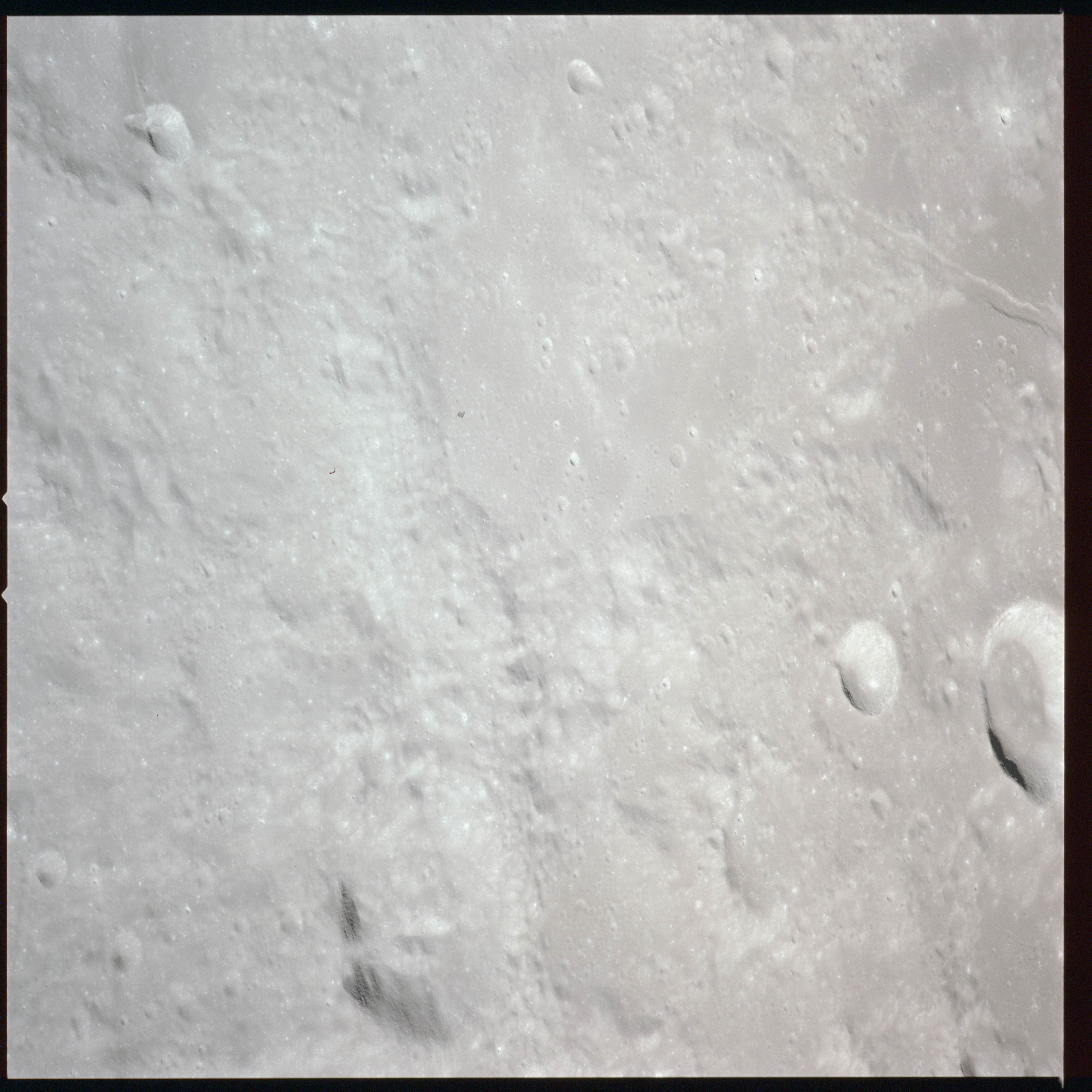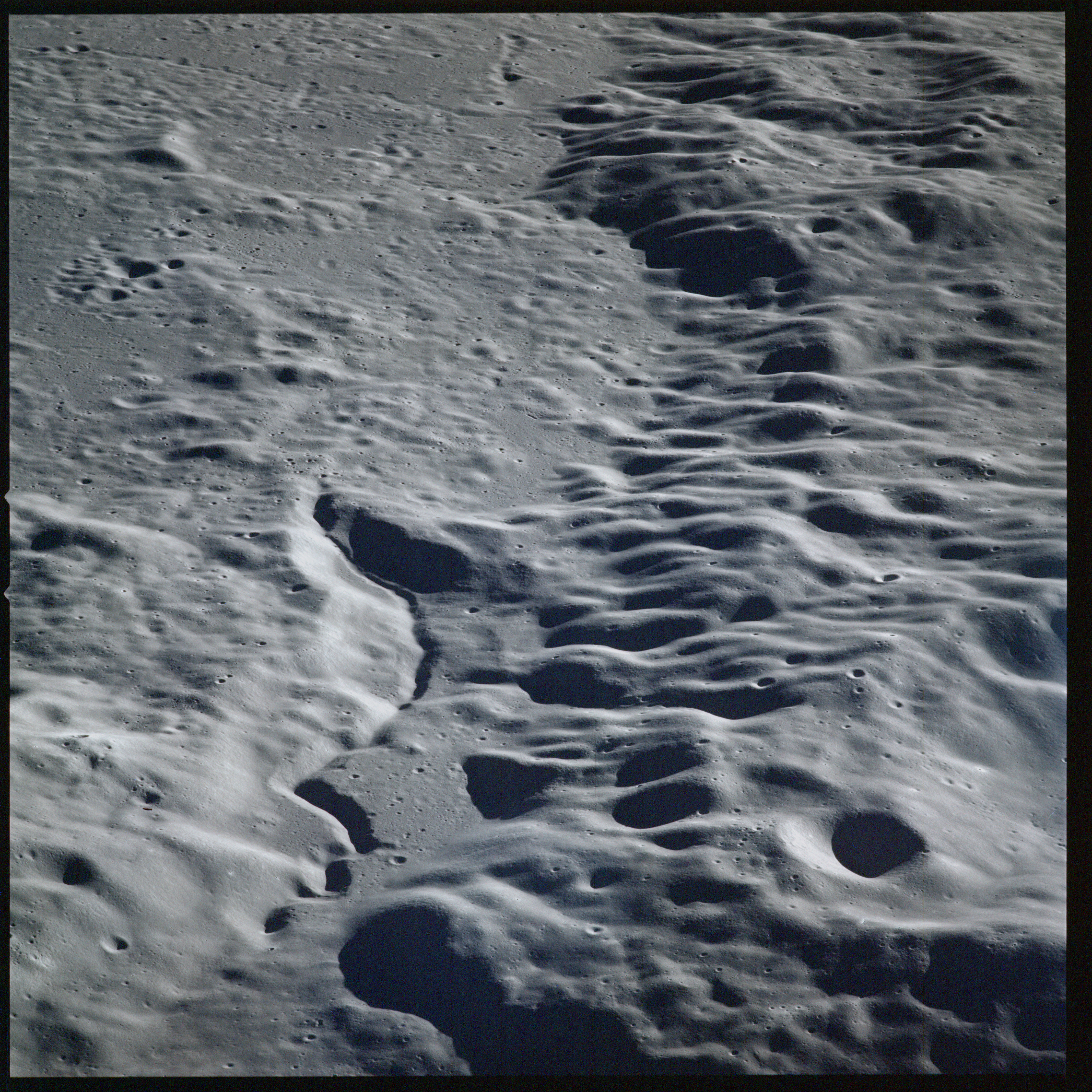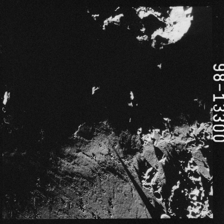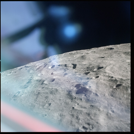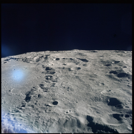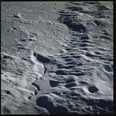 Relief, especially craters and hills, appears jagged and extreme, suggesting that excessive study of the terminator from Earth-based telescopes is responsible for the mistaken, pre-Apollo notion that the Moon would be a very rough place to explore.