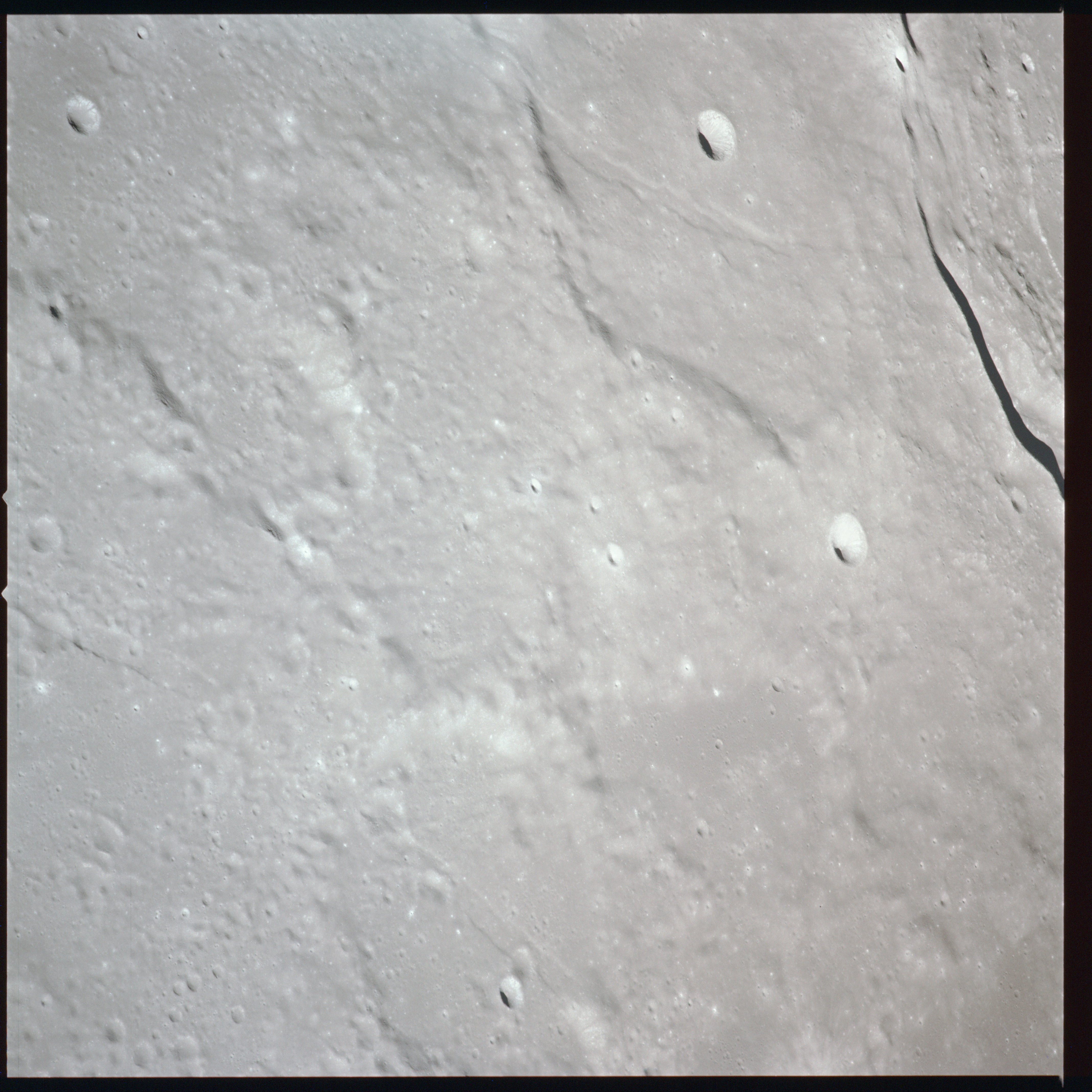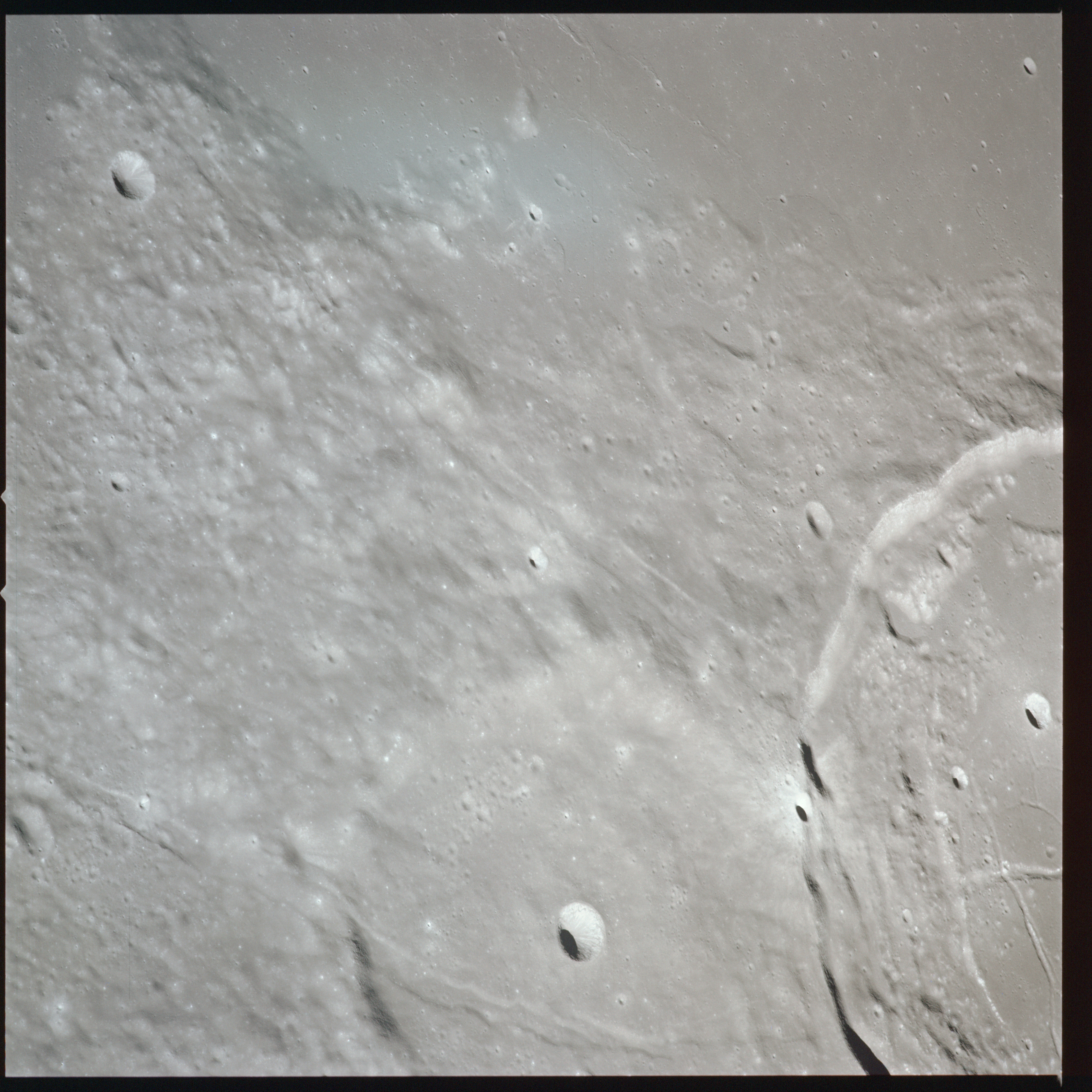 Between Mare Crisium and Mare Serenitatis (Sea of Serenity) lies a large, heavily battered region which is currently north of the spacecraft's position. AS15-91-12351 to 12360 show various landmarks in this area. As the Sun is high in the sky over these areas, there is little relief shown in these photographs.