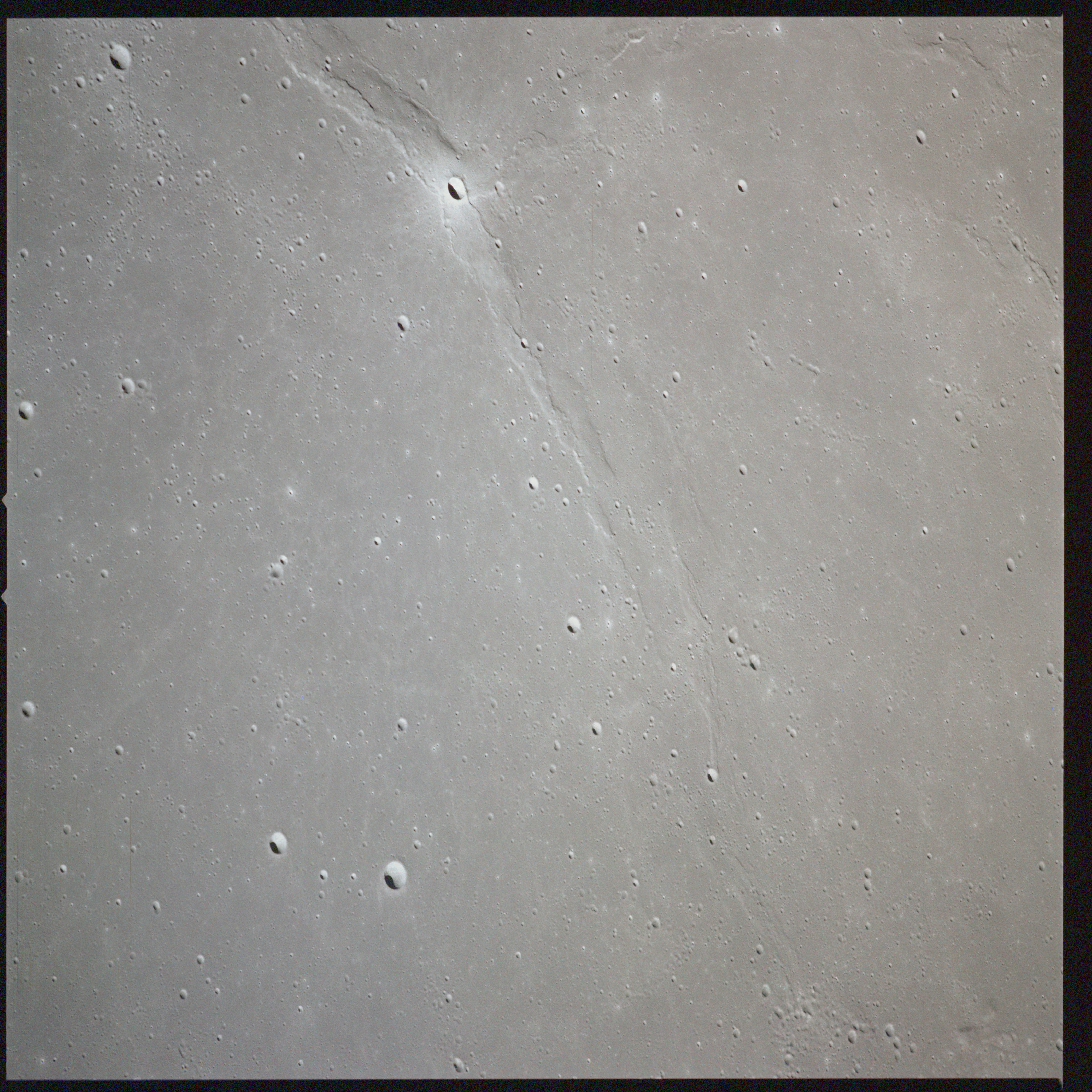 AS15-91-12360 - Lunar surface, dimly showing a system of graben rilles, dropped floor valleys caused by extensional forces, which lead to the fractured pair of craters, Chacornac and Posidonius at the eastern shore of Mare Serenitatis. These rilles are arcuate, lying roughly parallel to the rim of the Serenitatis basin. - Image by NASA/Johnson Space Center.