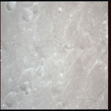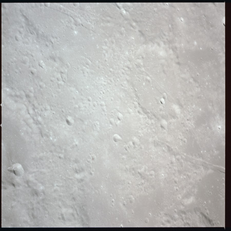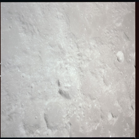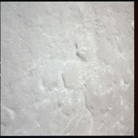 079:13:57 Scott: And Houston. We're over Mare Crisium at the present time, and the sights are really striking. I guess some of the interesting things we've noted is the variation in albedo from white to dark gray with many variations of gray in between. And many times, this albedo change appears without any significant change in topography, other than perhaps a - a mountain ridge or a chain or a wrinkle ridge or something, but there are many vari - variations in the albedo all over the surface. I guess our general consensus is that it's gray. We haven't noticed any brown yet.