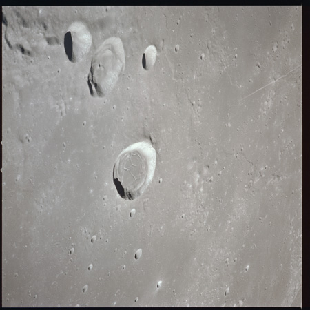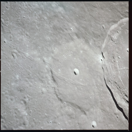 079:16:43 Worden: Karl, this is Al. I'd have to say pretty much what Dave's been saying. You might be interested to know that we're coming up over Peirce right now, and just about to hit the west rim of Mare Crisium, and kind of looking forward to taking a look at Proclus as we get up a little bit closer here. There are a couple of craters just to the north - northeast corner, and we'll pin point those a little better for you later. A very, very small crater that looks like it's had some dark material slide down into the crater, the eastern wall of the inside of the crater has some very dark material in it, and at - at this Sun angle, it doesn't appear that it's shadow.