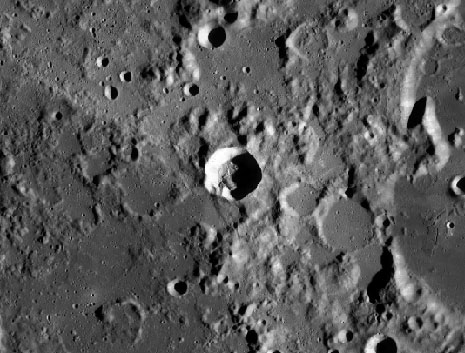 This is an Earth-based view of Proclus. Its rim is polygonal rather than circular and its remarkable ray system displays a 120° excluded zone to the west bounded by two prominent rays. A notch in the crater's rim at the apex of the excluded zone is opposed by another dominant ray sweeping across Mare Crisium.