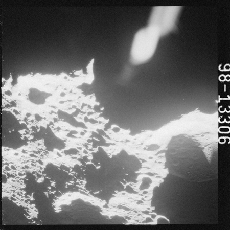 Apollo 15 is nearing the Hadley landing site within the Apennine range. These mountains are experiencing lunar dawn.