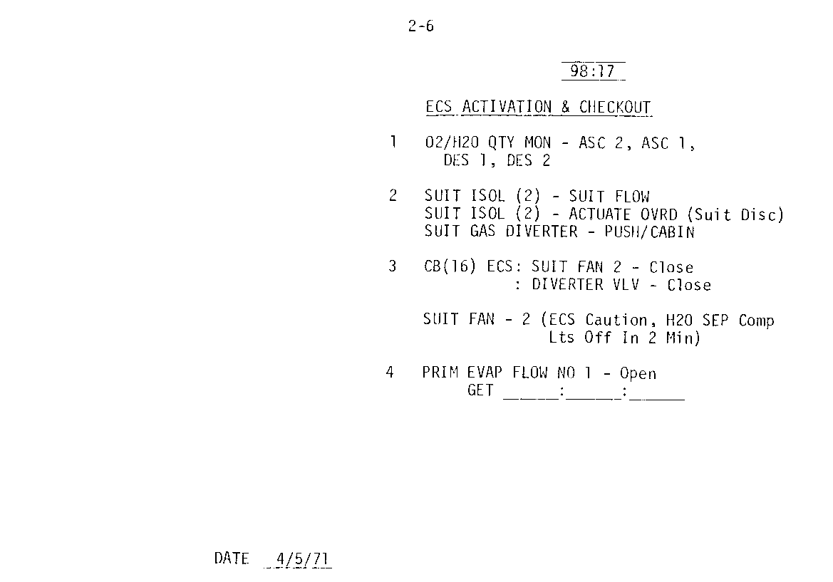 095:13:29 Parker: Roger, Jim. The P30 PAD. Purpose, DOI trim, RCS/G&N; 38264; Noun 48 is NA; 095:56:42.50; plus 0003.1, the last two Noun 88s [means Noun 81s] are 0; 180, 104, 359; Noun 44 is 0059.4, plus 0009.6; 0003.1, 0:20, 0003.1; 30, 192.8, 11.1 the rest of the PAD is NA. GDC Align stars are Vega and Deneb, roll, pitch and yaw are 288, 340, 346. It's a 4-jet RCS burn and we do not want to trim any retrograde residual, so any extra burn you get in that direction, we will not trim. Over. [Pause.]