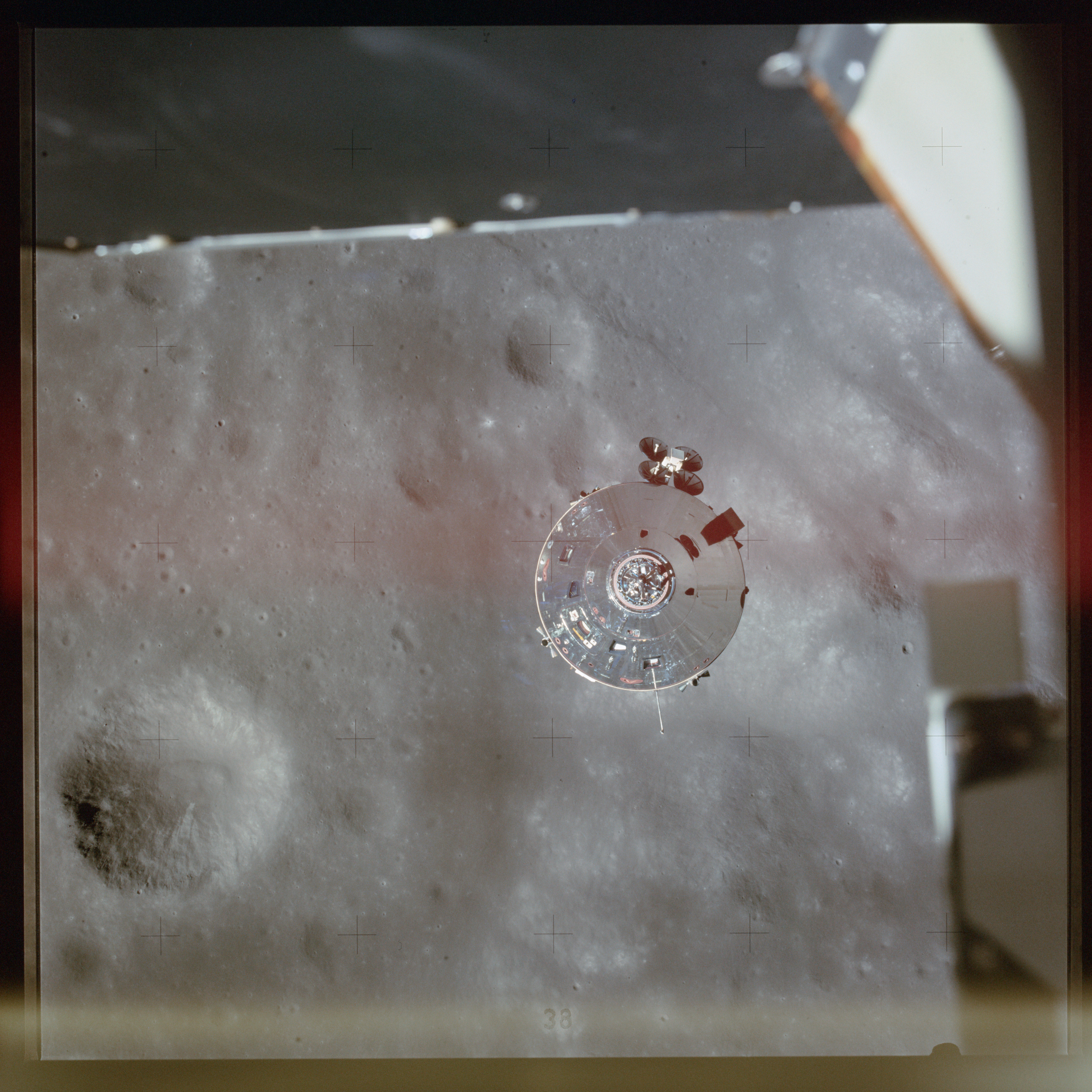 It is possible to work out the distance to the CSM from these photos. We know the lens focal length (60 mm), we have crosses from the Reseau plate which are marked at precisely 10-mm intervals, allowing us to accurately measure the size of the whole Hasselblad frame (52.58 mm). Using photo software we can measure the number of pixels for these and for the image of the CSM itself. We also know the diameter of the CSM (154 inches or 391 cm).