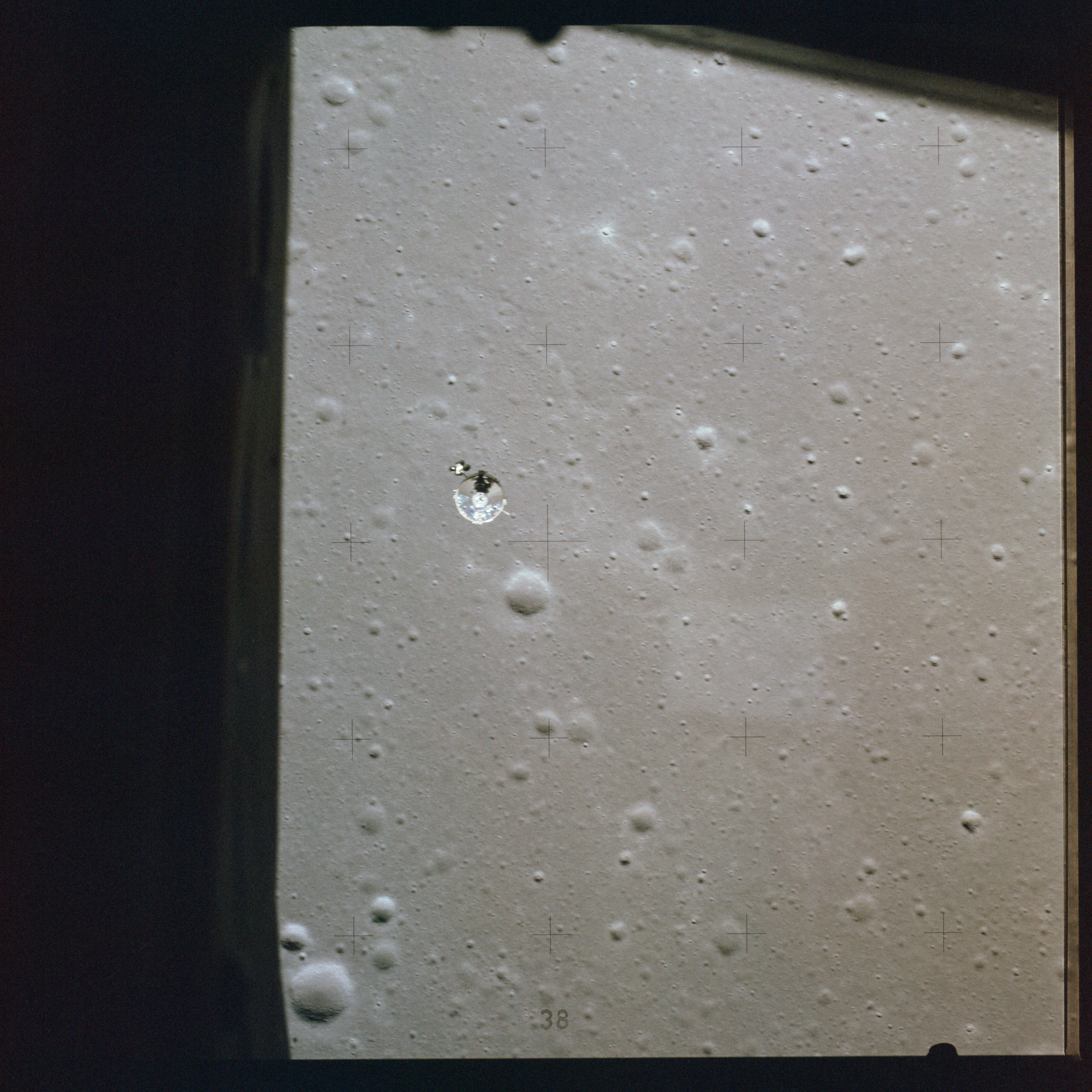 Five photographs are taken from the LM showing Endeavour set against the Moon below. The first two are taken as they pass the eastern shore of Mare Serenitatis.