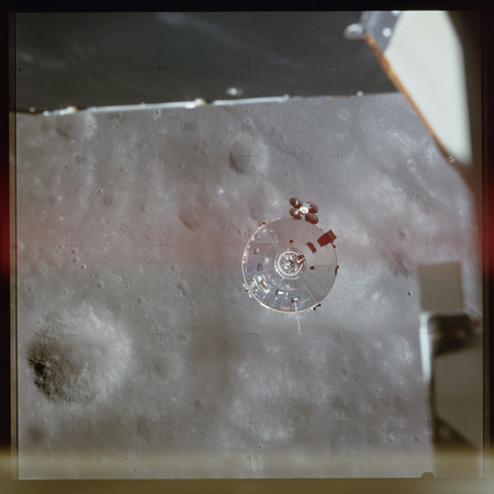 As the two spacecraft slowly separate, both movie and still cameras are covering the event. Al has a 16 mm DAC running in the CM using magazine B.