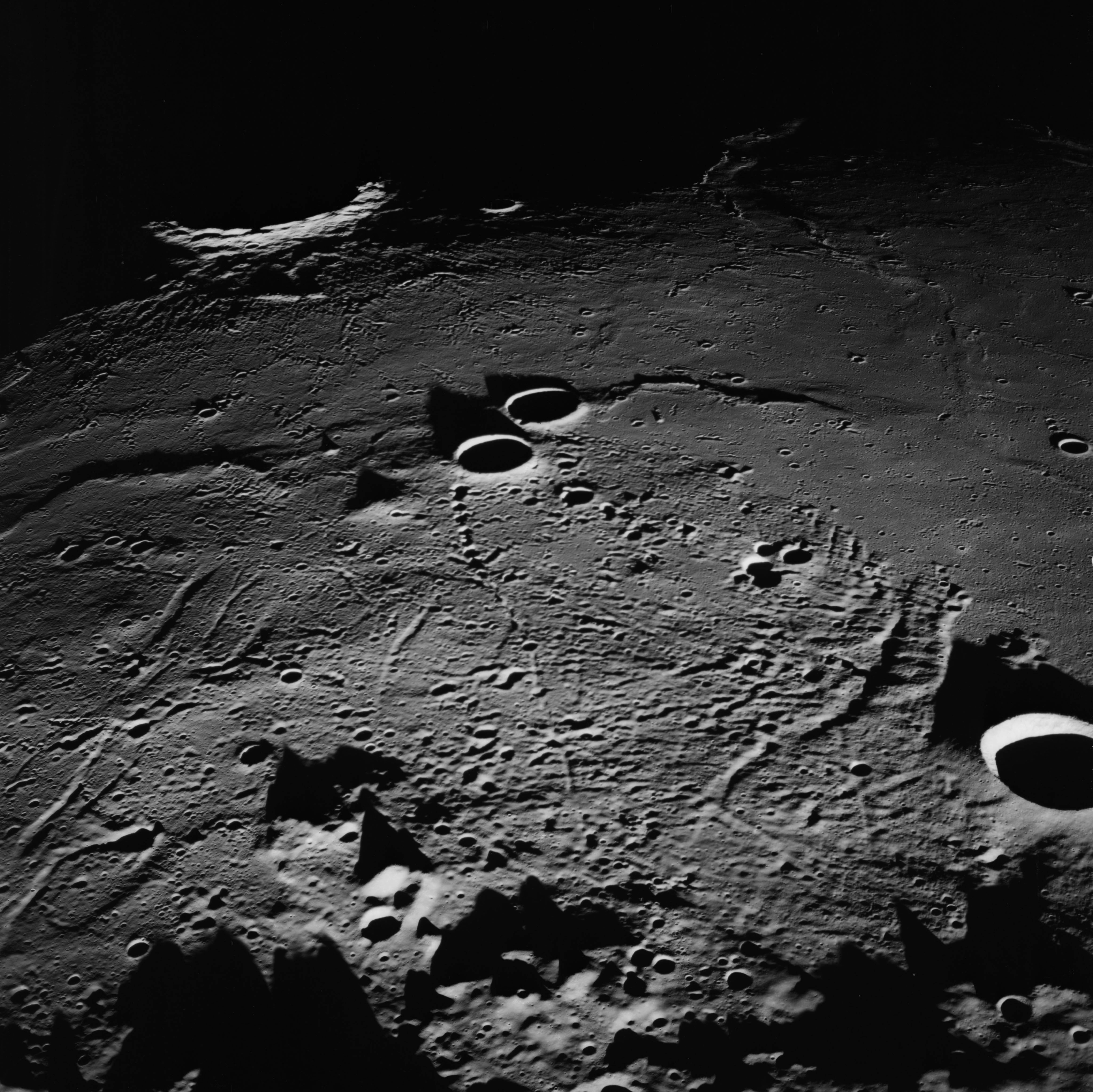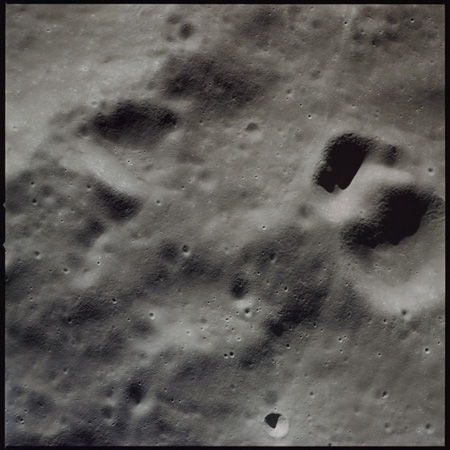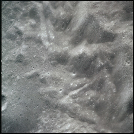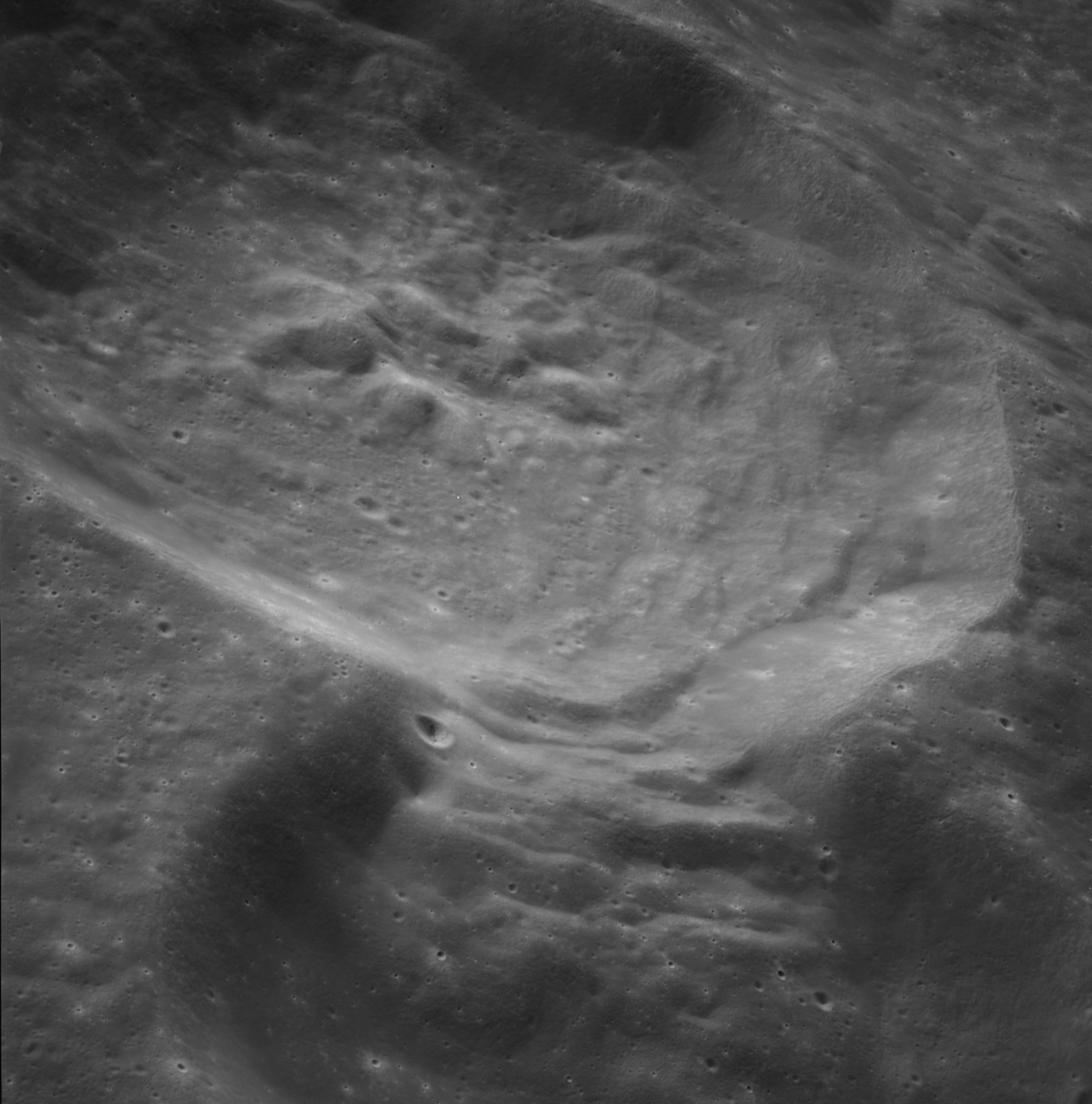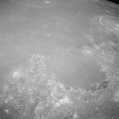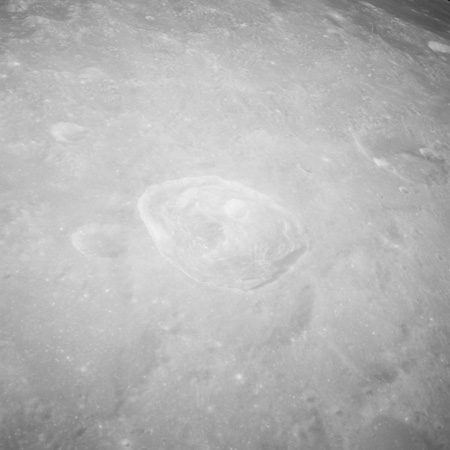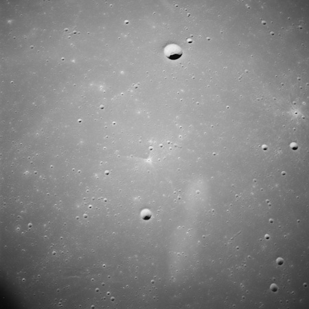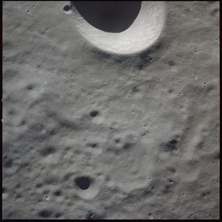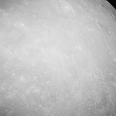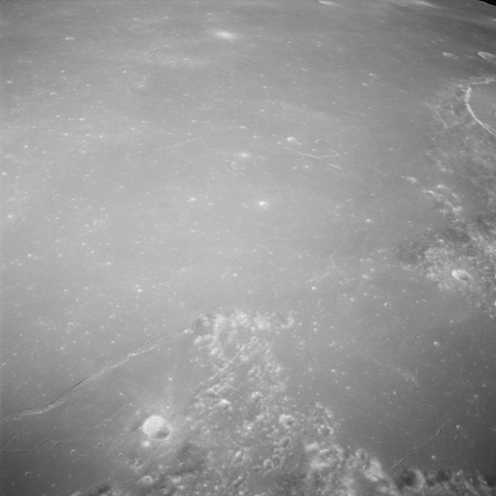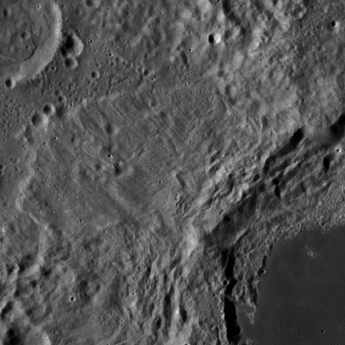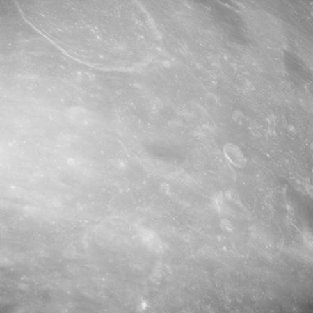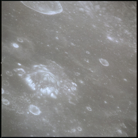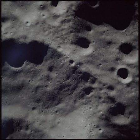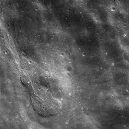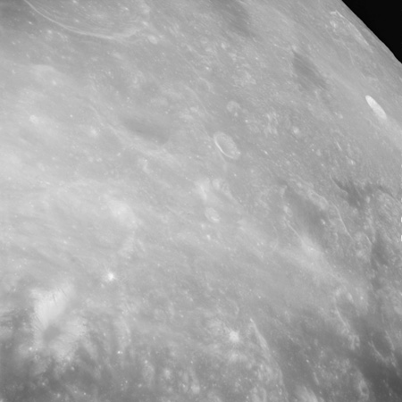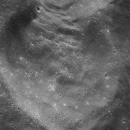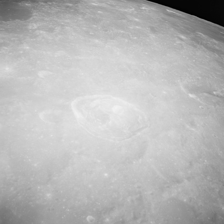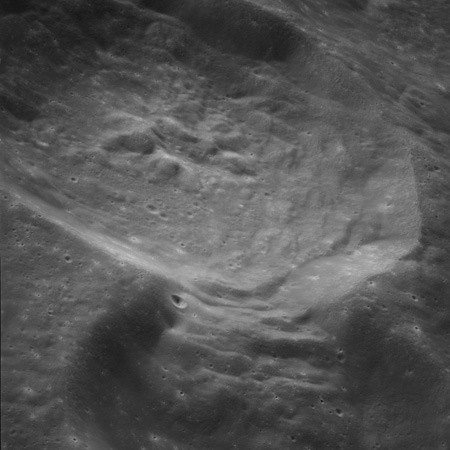 Of particular note in the last four images is the radial "sculpture"; evidence of the outrushing sheet of ejecta from the impact which carved long furrows in the ground. These are smaller scale examples of similar landforms seen around the Imbrium basin on the front side, particularly around Mare Vaporum, which are traces of the tremendous effect the formation of the Imbrium Basin had on the Moon's surface. The correct interpretation of the origin of sculpture would prove to be crucial to understanding the history of the Moon's features. For vertical context, this is a more recent image from the Lunar Reconnaissance Orbiter.