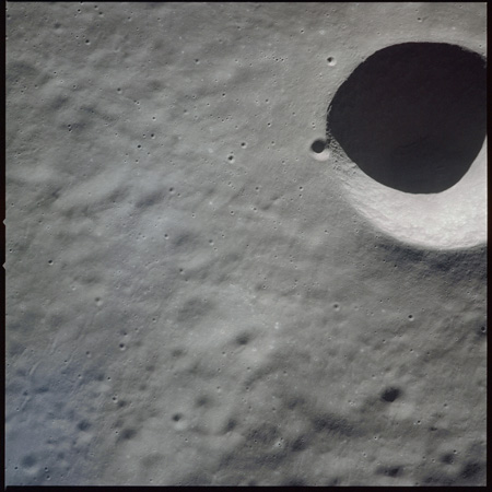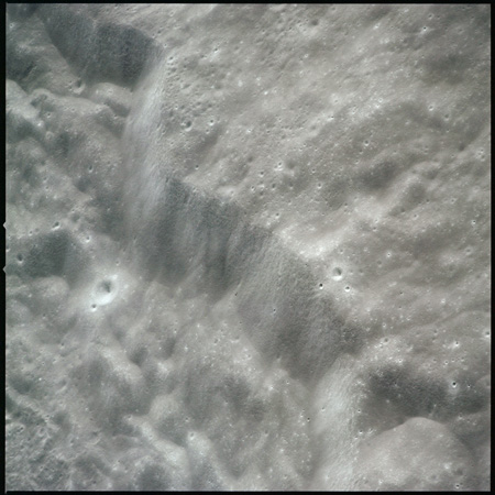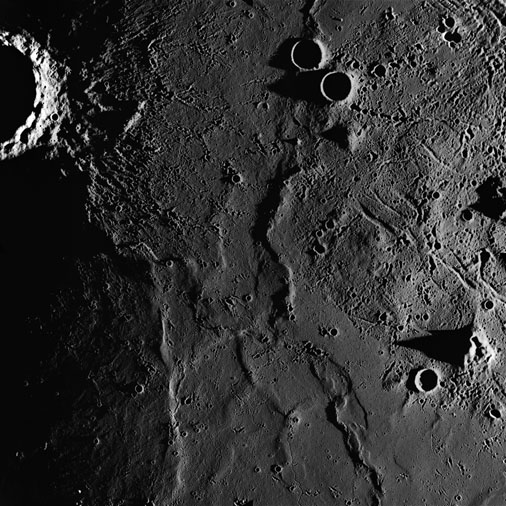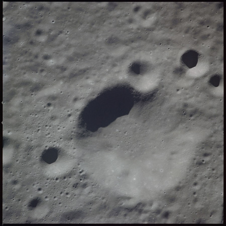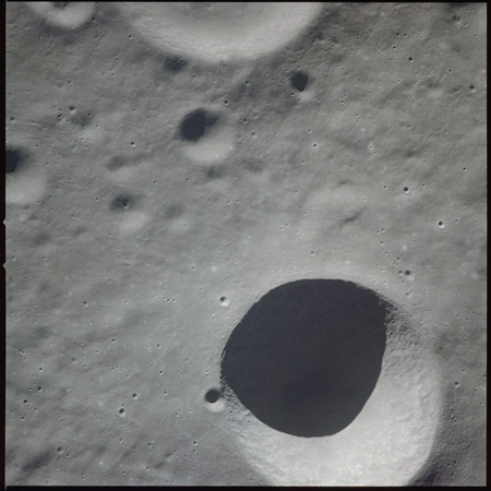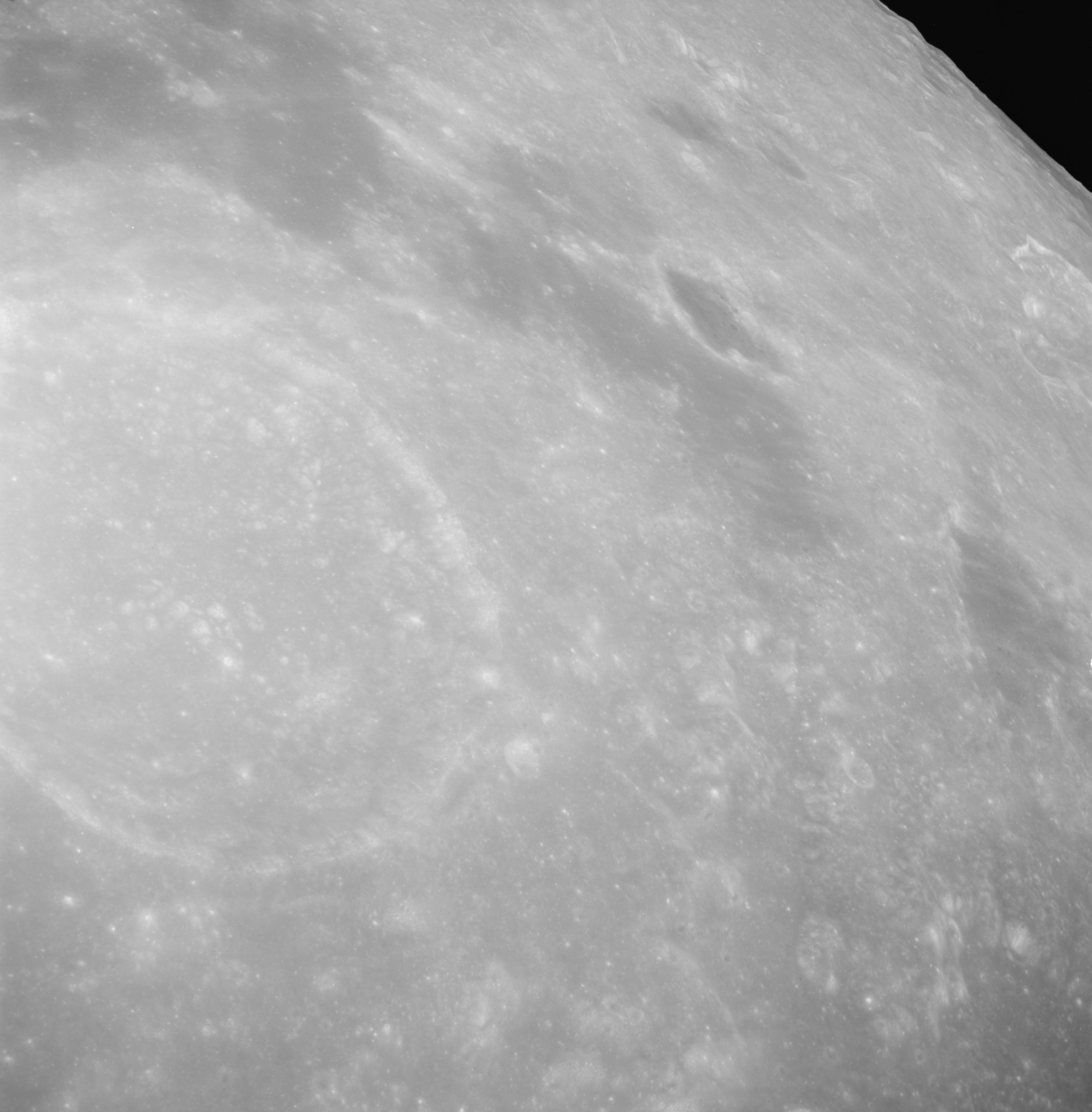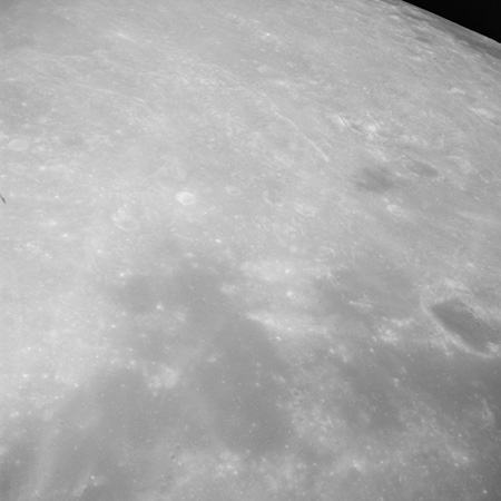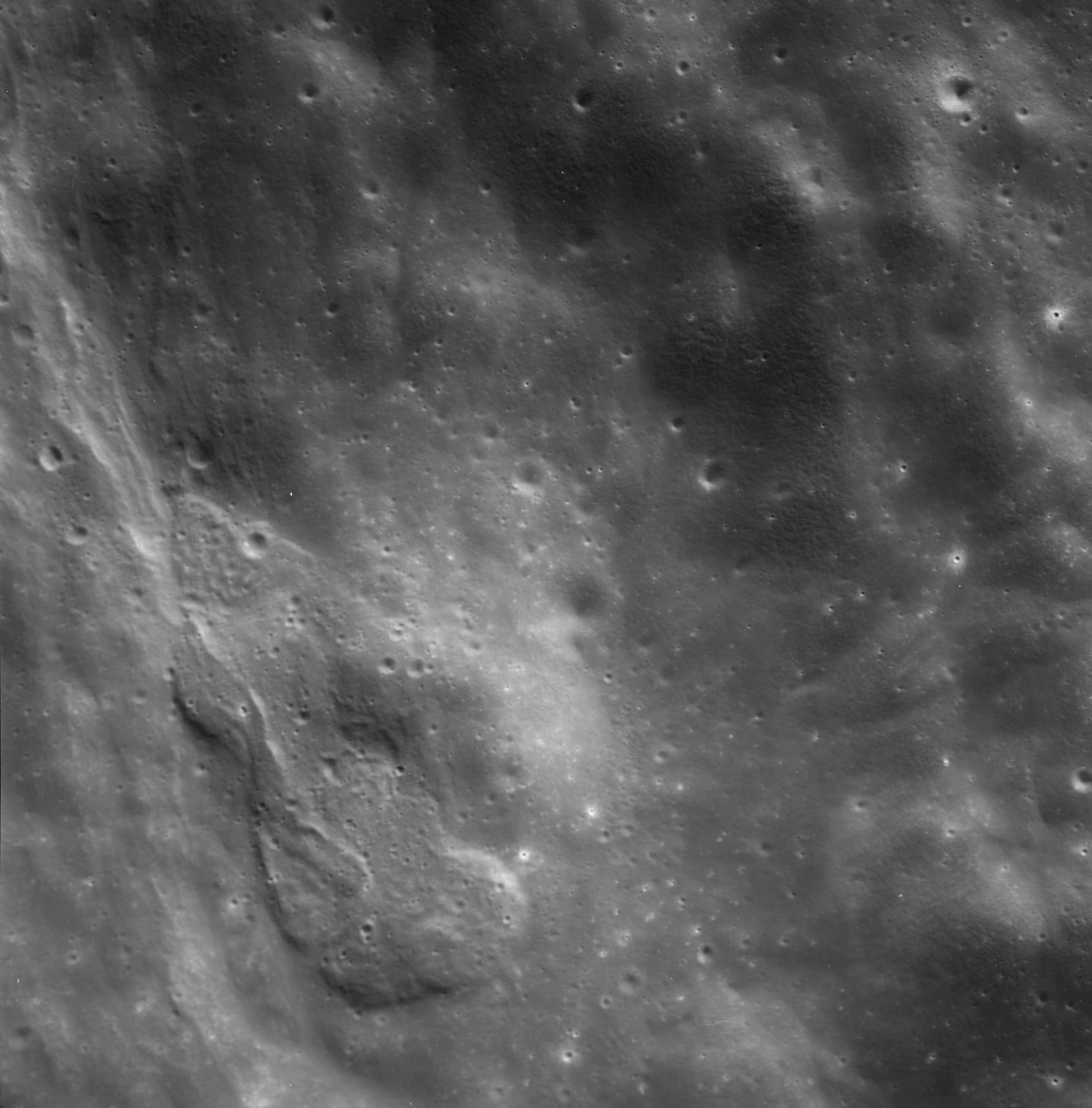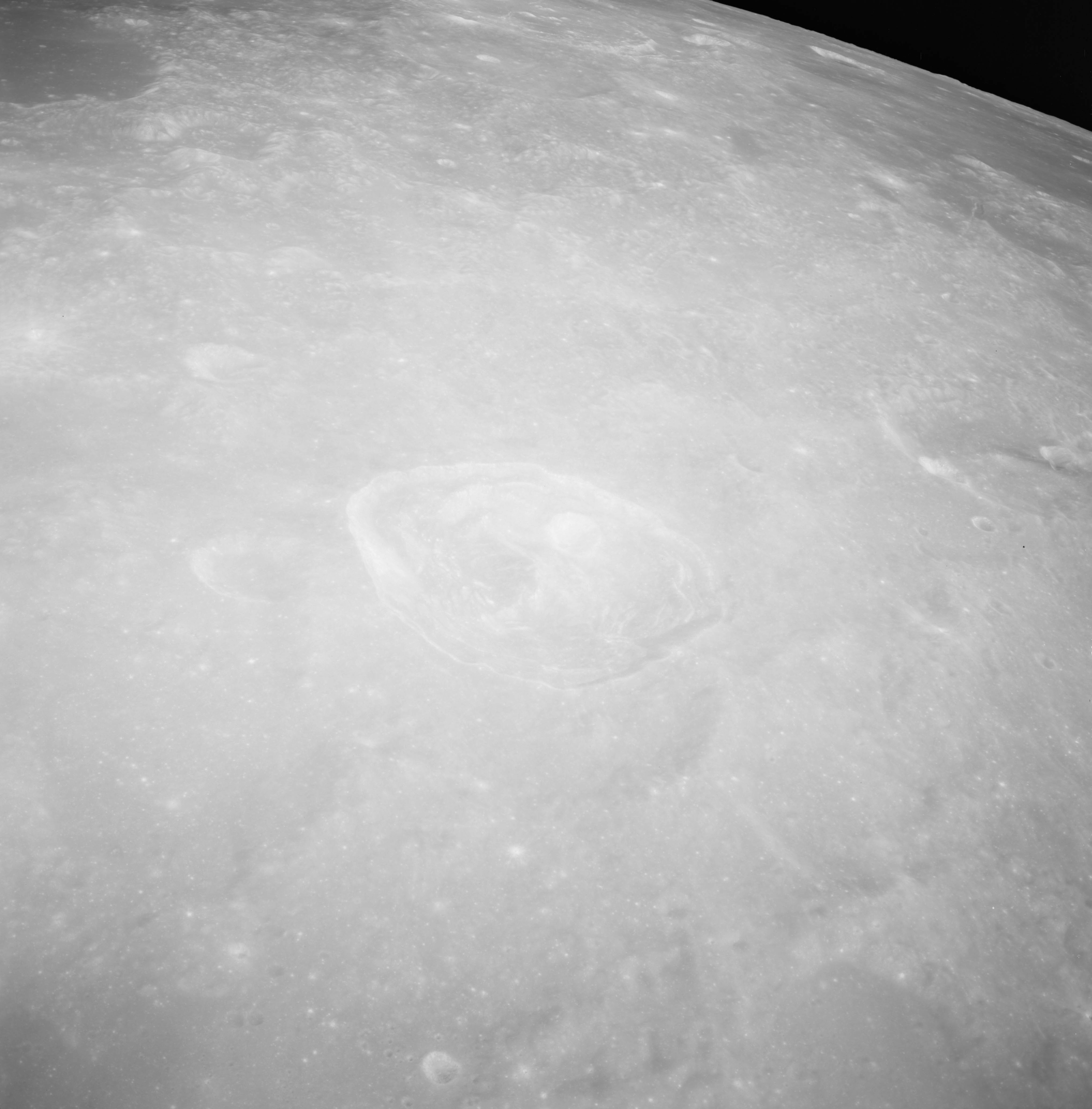 Of particular note in the last four images is the radial "sculpture"; evidence of the outrushing sheet of ejecta from the impact which carved long furrows in the ground. These are smaller scale examples of similar landforms seen around the Imbrium basin on the front side, particularly around Mare Vaporum, which are traces of the tremendous effect the formation of the Imbrium Basin had on the Moon's surface. The correct interpretation of the origin of sculpture would prove to be crucial to understanding the history of the Moon's features. For vertical context, this is a more recent image from the Lunar Reconnaissance Orbiter.